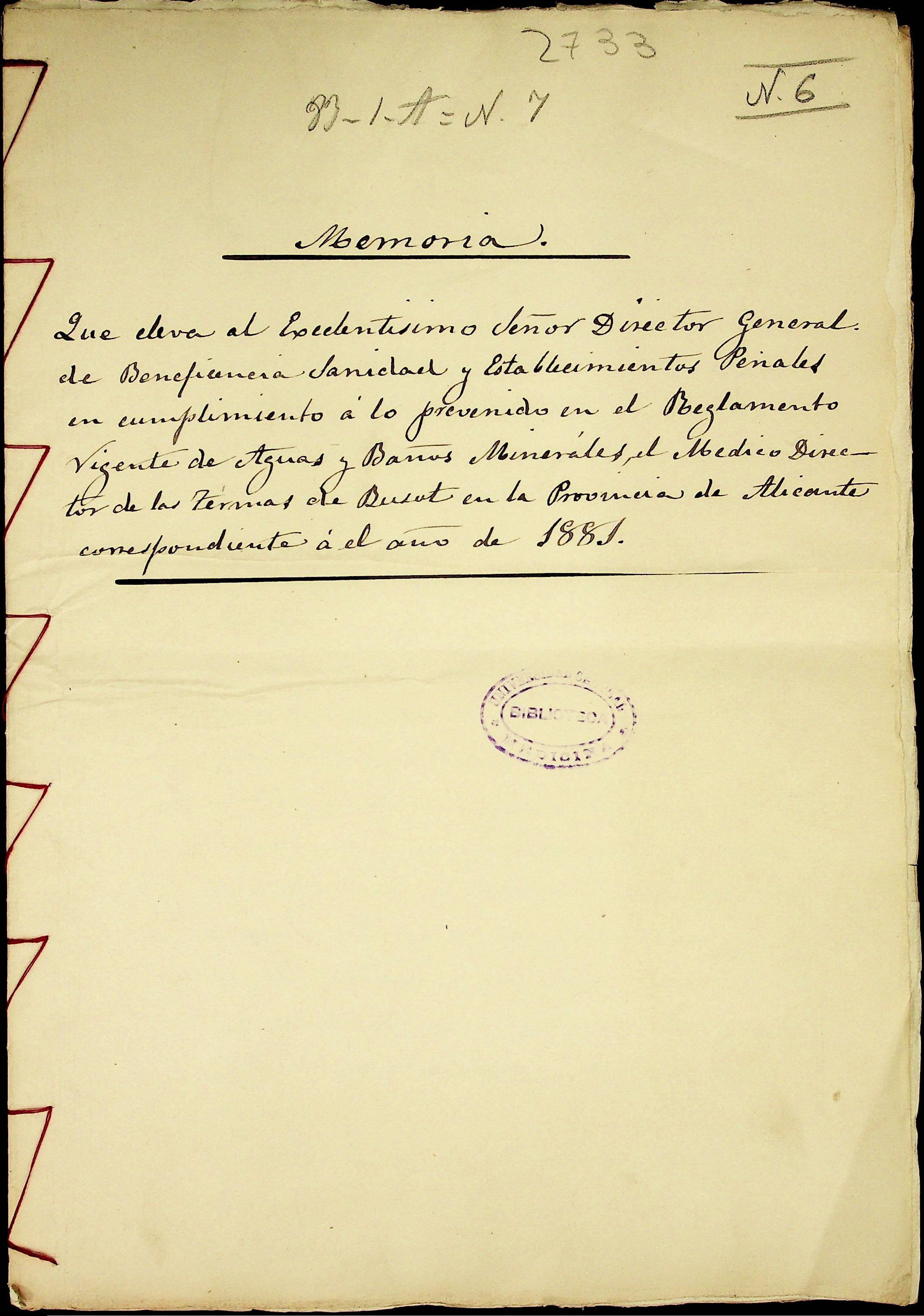 Memoria que eleva al Exvelentisimo Señor Director General de Beneficiencia Sanidad y Establecimientos Penales en cumplimiento á lo prevenido en el Reglamento Vigente de Aguas y Baños Minerales, el Médico Director de las Termas de Busot en la Provincia de Alicante correspondiente al año 1881