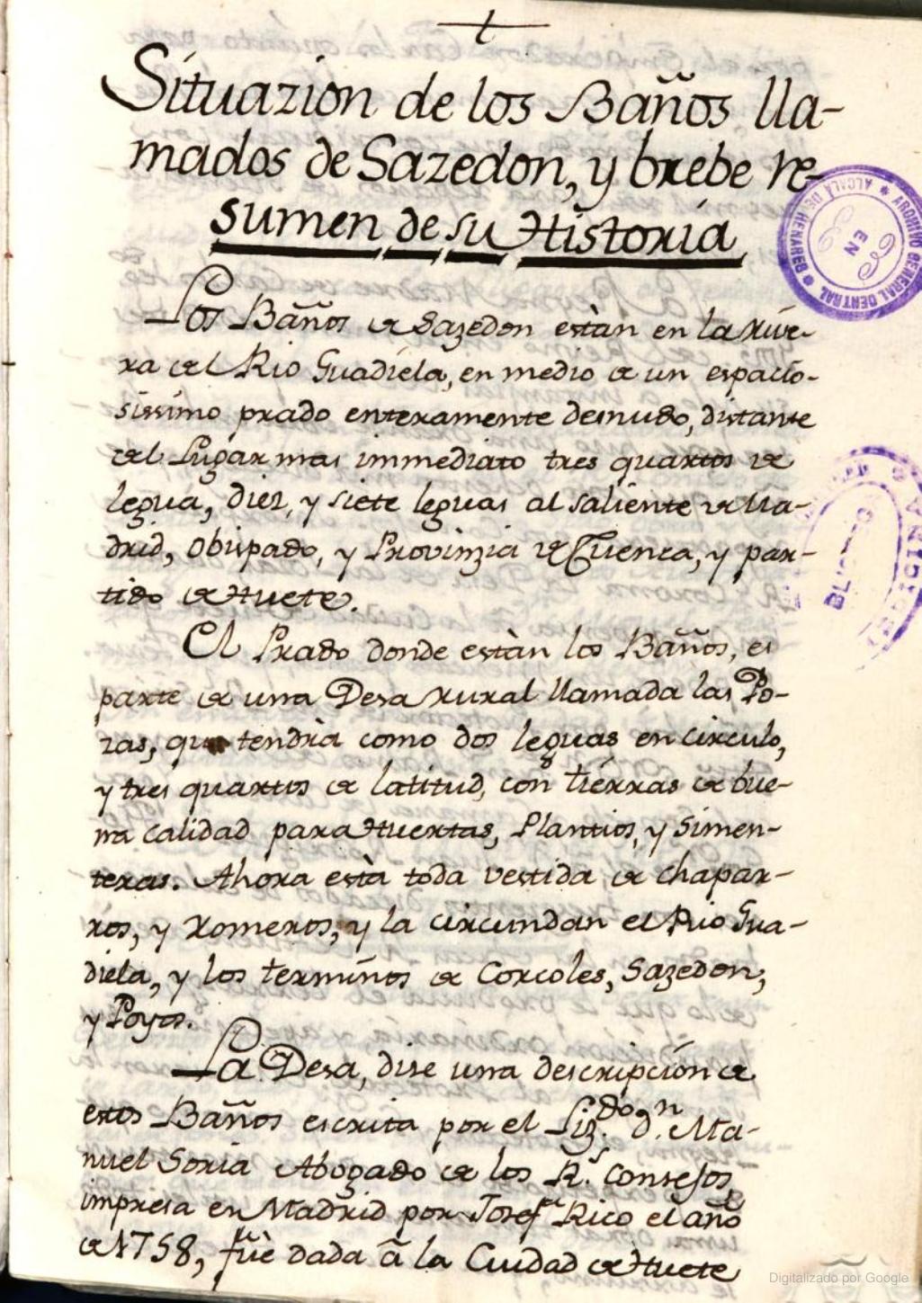 Situazion de los baños llamados de Sazedon, y brebe resumen de su historia