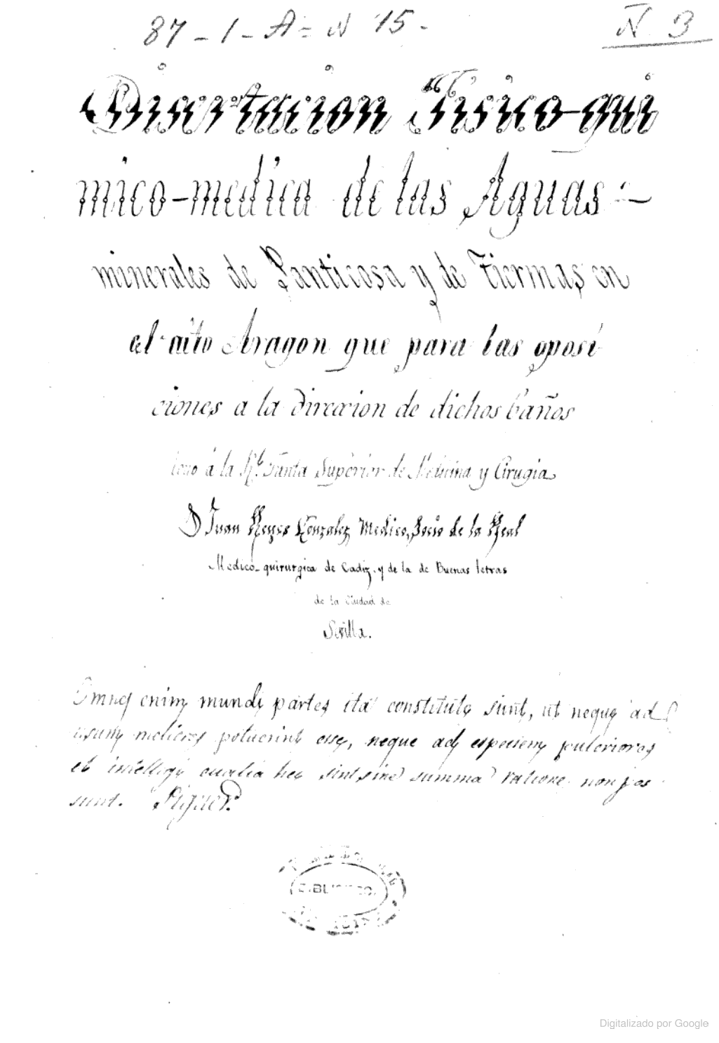 Disertacion fisico-quimico-medica de las aguas minerales de Panticosa y de Tiermas en el alto Aragón que para las oposiciones á la direccion de dichos baños leyó a la Real Junta Superior de Medicina y Cirugía D. Juan Reyes Gonzalez..