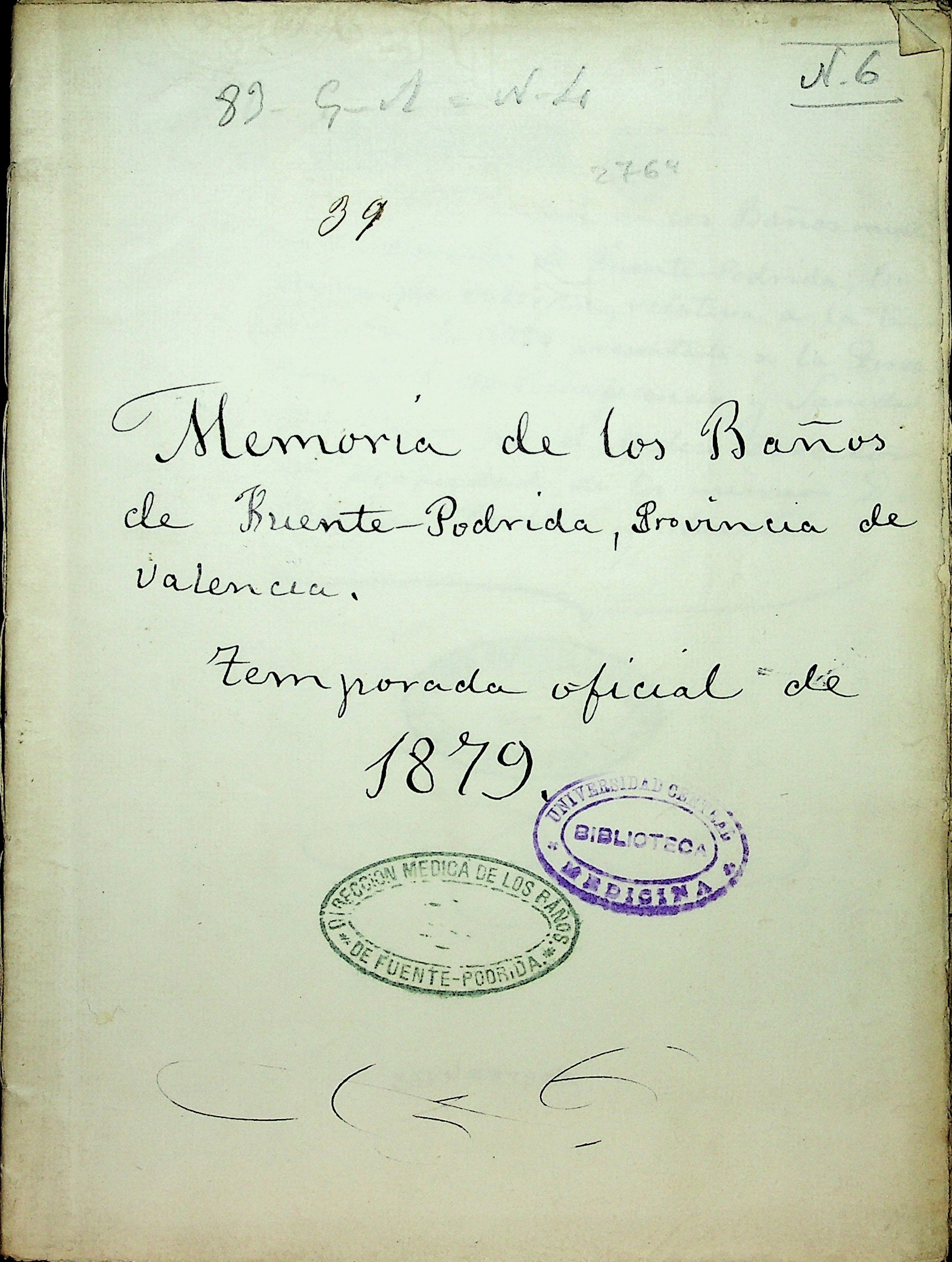 Memoria anual de los baños mínero-medicinales de Fuente Podrida , provincia de Valencia relativa a la temporada oficial de 1879, presentada a la Direccion gral de Beneficiencia y Sanidad del Reyno