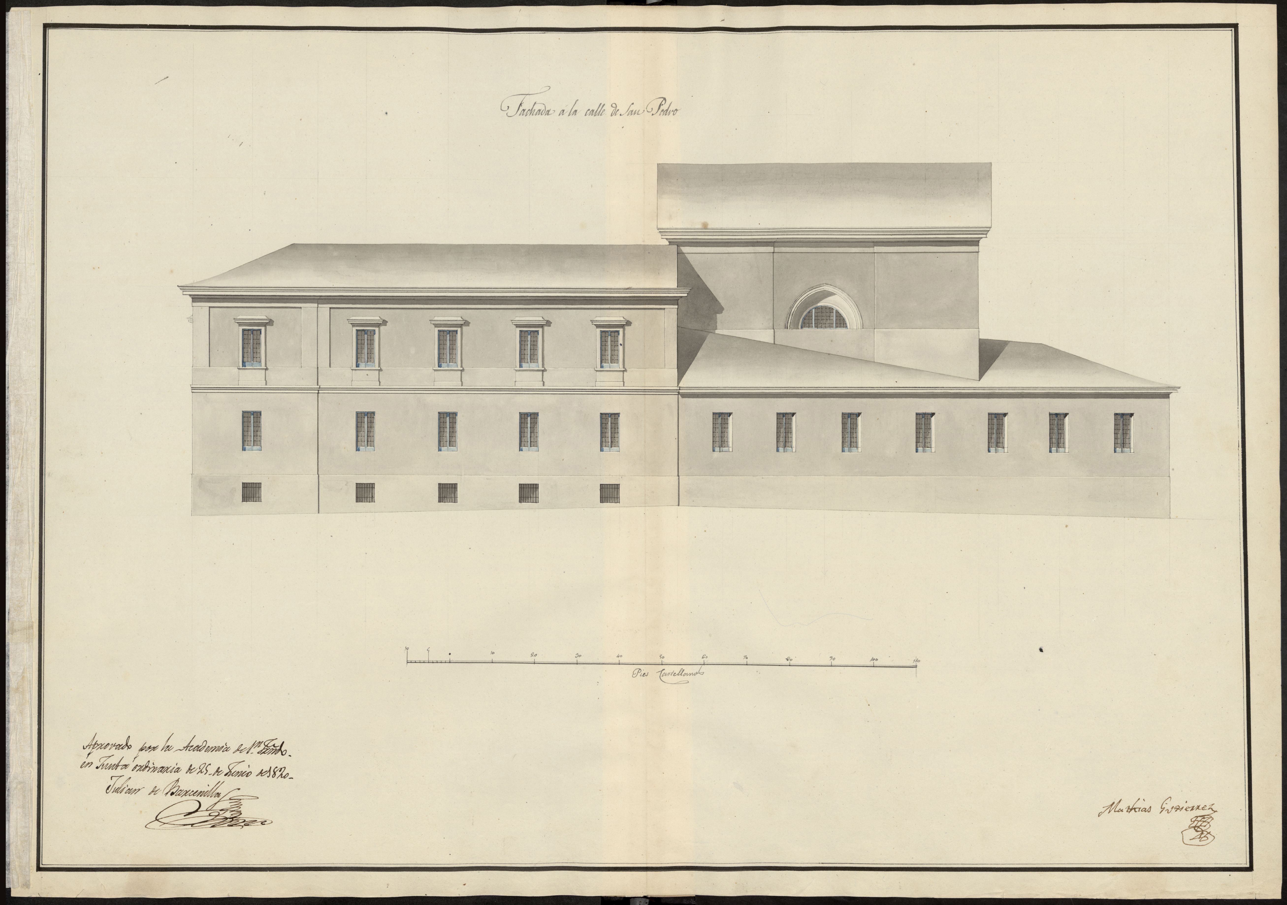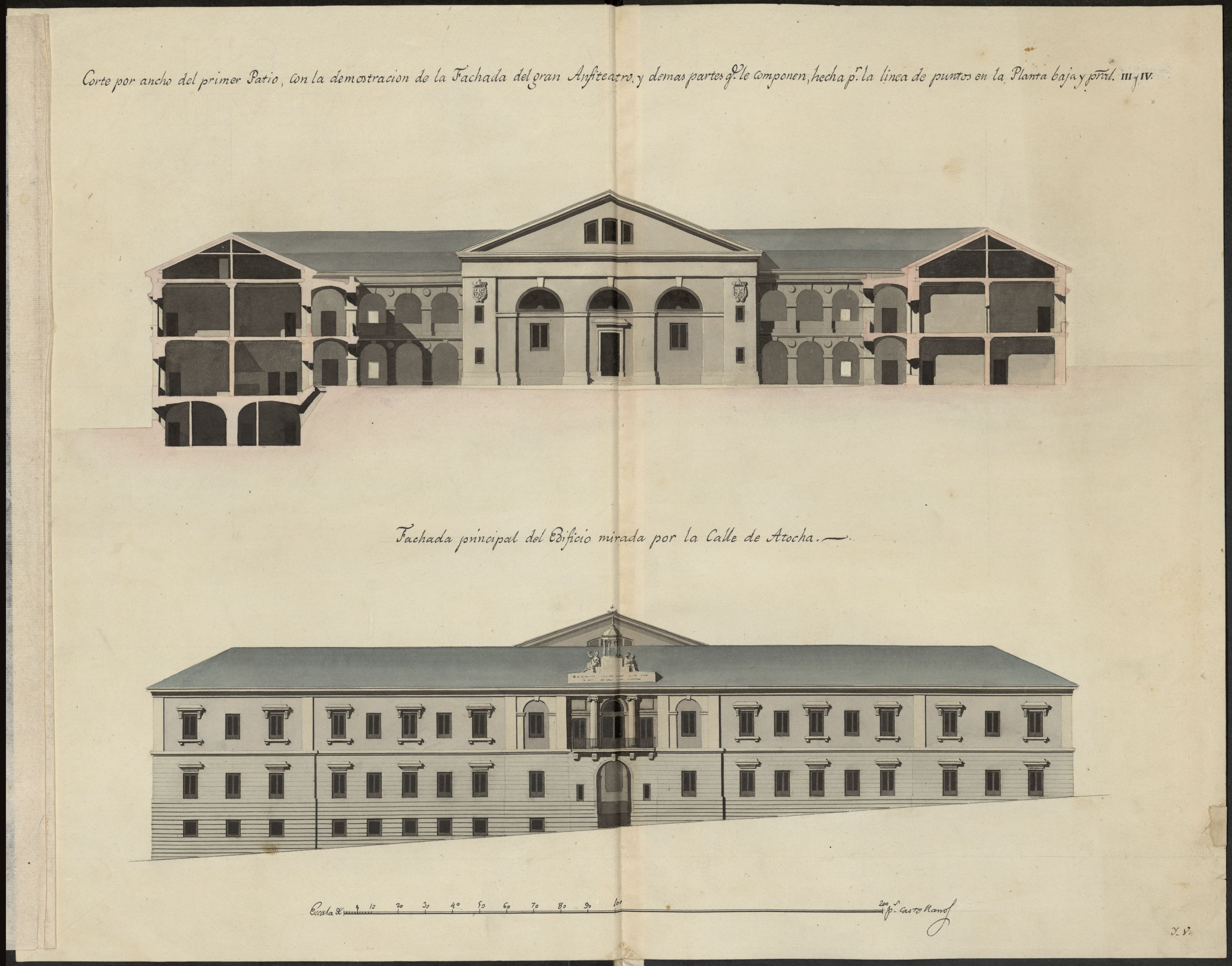 Los planos se sitúan en un momento clave de la historia de la enseñanza médica en España. El Real Colegio de Cirugía de San Carlos, fundado en 1780 por iniciativa de Carlos III, nació con el propósito de prestigiar la cirugía, hasta entonces relegada frente a la medicina universitaria. A lo largo del tiempo, y como resultado de diversas reformas, la institución fue modificando su denominación, destacando la de Real Colegio de Medicina y Cirugía de San Carlos, preludio de la integración de ambas disciplinas, y culminando con su denominación más estable, la de Facultad de Medicina de San Carlos, vinculada a la Universidad Central a mediados del siglo XIX. Fue en ese contexto cuando se levantó el edificio histórico, en la calle Atocha, concebido como sede propia. El proyecto inicial, elaborado en 1831 por Isidro González Velázquez, se vio pronto complementado por las propuestas de Tiburcio Pérez Cuervo, quien en 1836 asumió la dirección de las obras e introdujo modificaciones en la distribución que acercaron el diseño al resultado final. No obstante, los orígenes del proyecto se remontan ya a 1820, con los planos de Matías Gutiérrez, y se prolongaron hasta la conclusión definitiva en 1844, con las últimas intervenciones de Juan Pedro Ayegui y Francisco Javier de Martiategui. El conjunto levantado, de planta cuadrada y con un amplio patio central, integraba espacios docentes, de práctica clínica y de investigación, destacando especialmente el anfiteatro anatómico, símbolo de la nueva enseñanza médica.