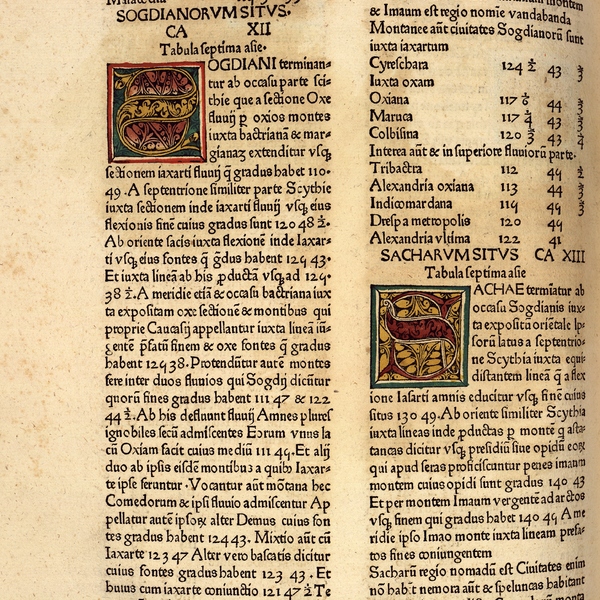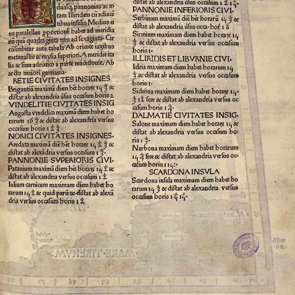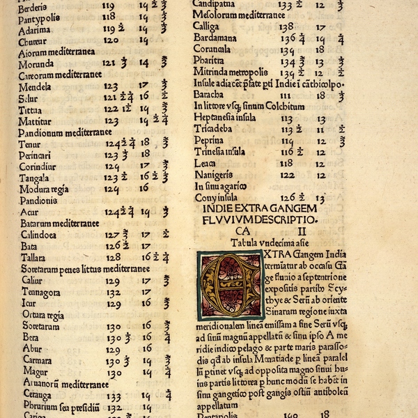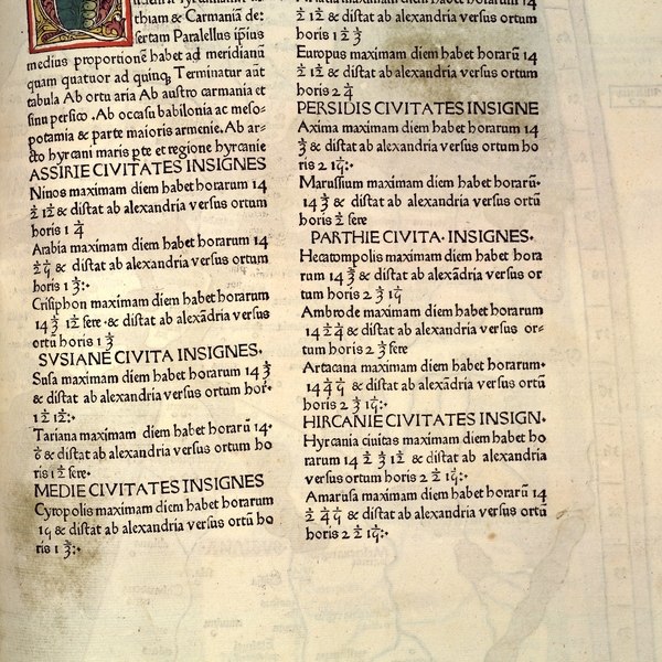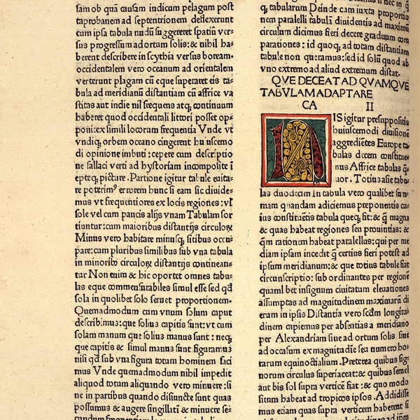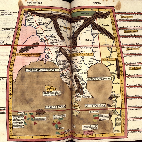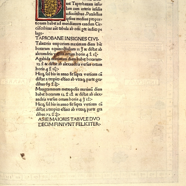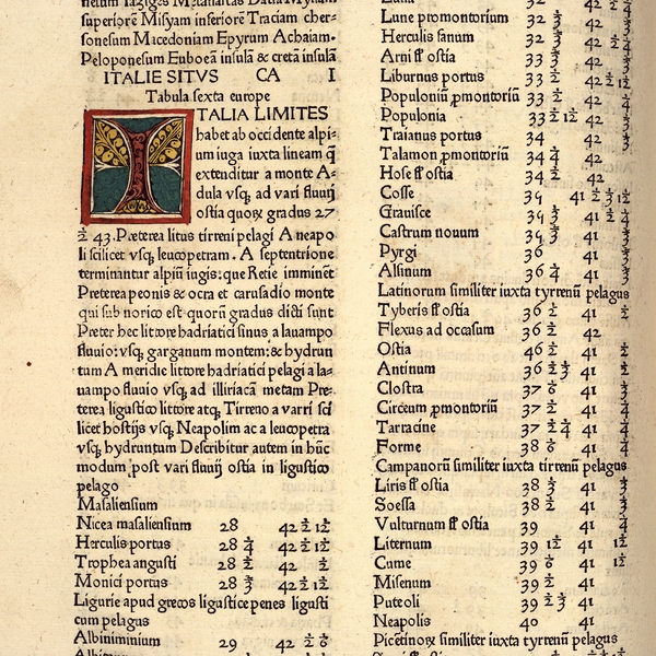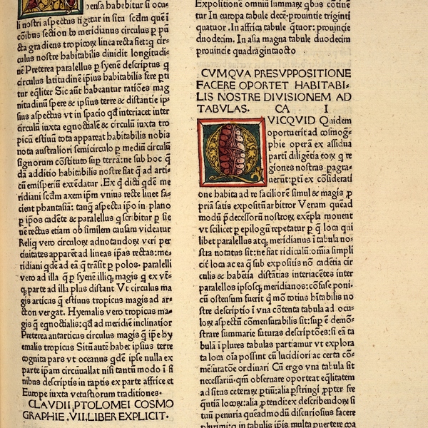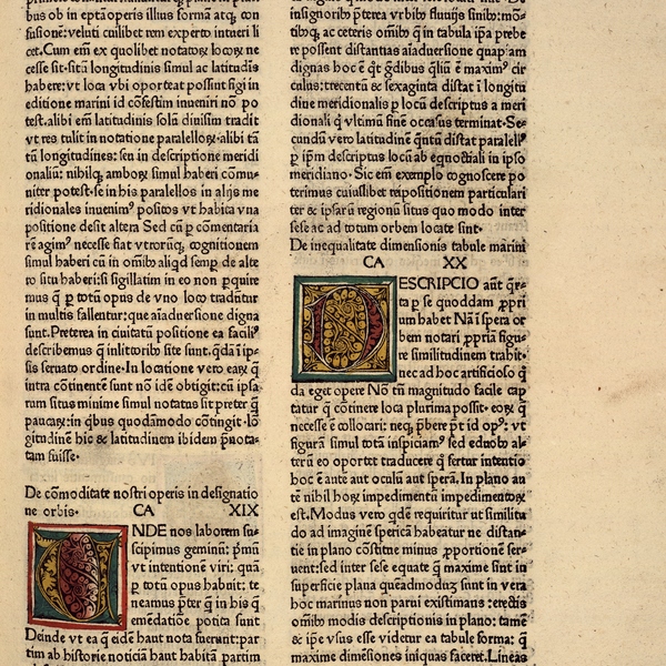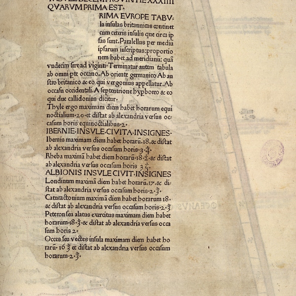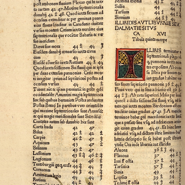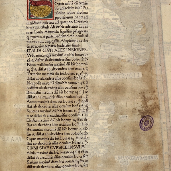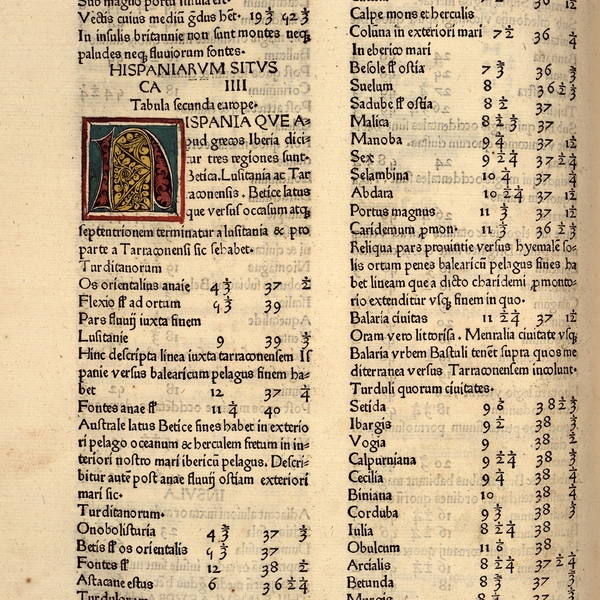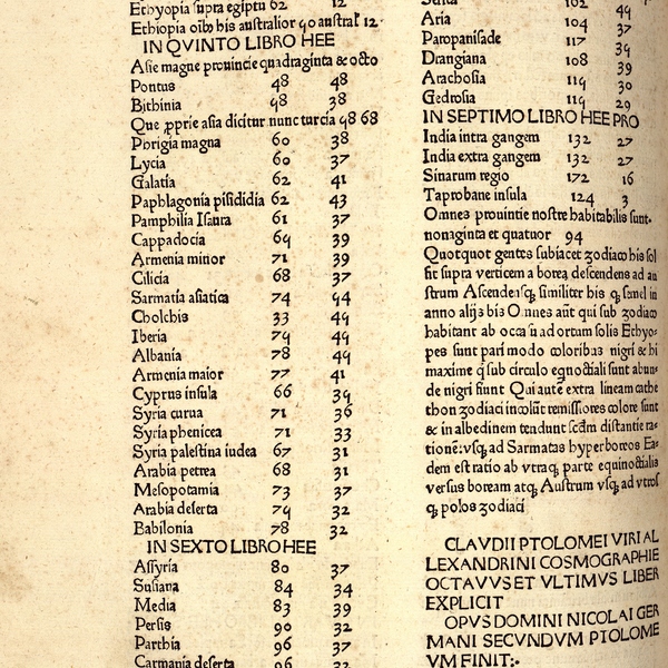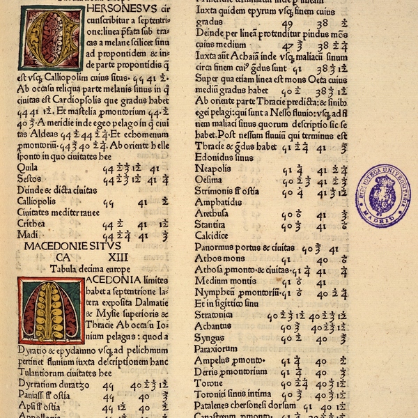 - Ex-libris ms. del Colegio Imperial de la Compañía de Jesús de Madrid. Ingresó en la Biblioteca Histórica procedente de la Facultad de Filología en 2000. Falta la última hoja, sustituida por copia ms. Se inicia con “Registrum alphabeticum super octo libro a Ptolomei incipit feliciter” cuyas primeras cuatro hojas restauradas, presentan pérdida de texto. A continuación el texto de Ptolomeo con 32 mapas. Los cinco mapas modernos aparecen intercalados entre los 26 de Ptolomeo, a continuación del correspondiente al que moderniza: en Europa: Tabula Moderna Hispanie, entre 2 y 3, Tabula Moderna Francie, entre 3 y 4, Tabula Moderna Italie, entre 6 y 7, y Tabula Moderna Prussie, Livonie, Norbegie et Gotcie, entre 8 y 9; en Asia Tabula Moderna Terre Sancte, entre 4 y 5. Al final incluye “De locis ac mirabilibus mundi” (signaturas a-b8, c10), con la particularidad de que el último cuadernillo de esta serie c-10 está intercalado entre los B-8 y C-8 del “Registrum alphabeticum super octo libro a Ptolomei incipit feliciter”. Los grabados xilográficos (mapas e iniciales) están coloreados a mano. Encuadernación de piel vuelta. Cortes dorados y cincelados, con restos de dos iniciales y un escudo en colores.