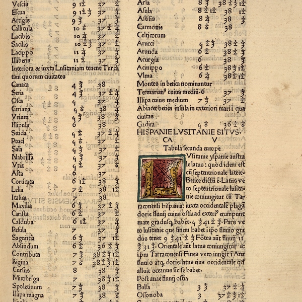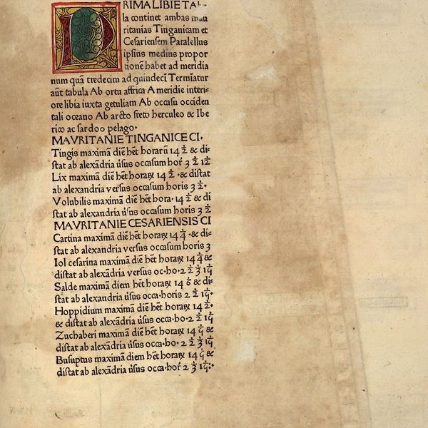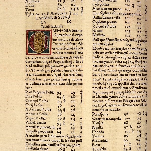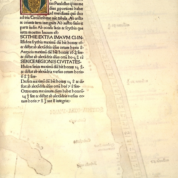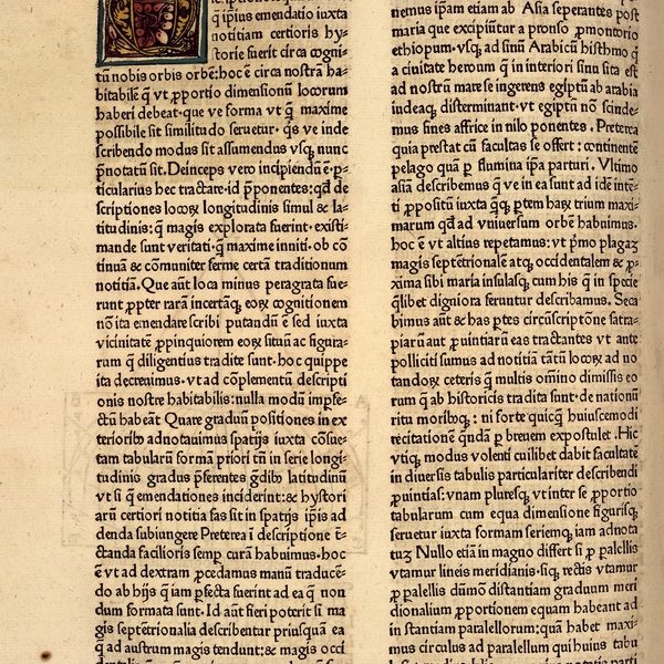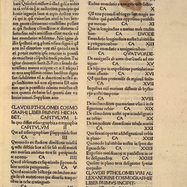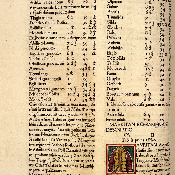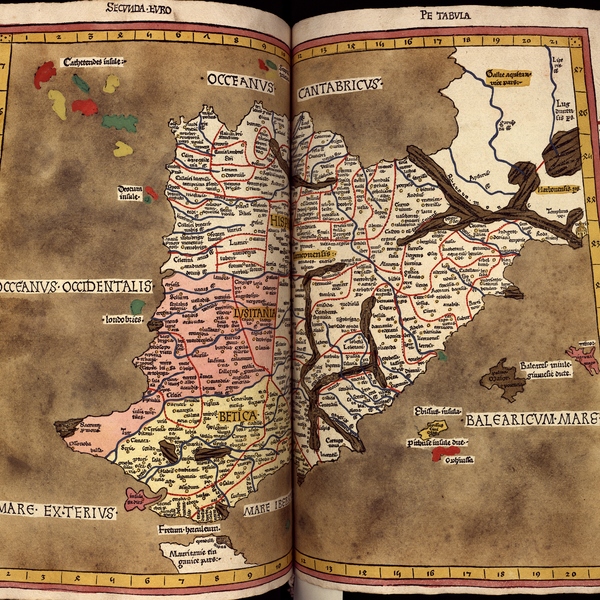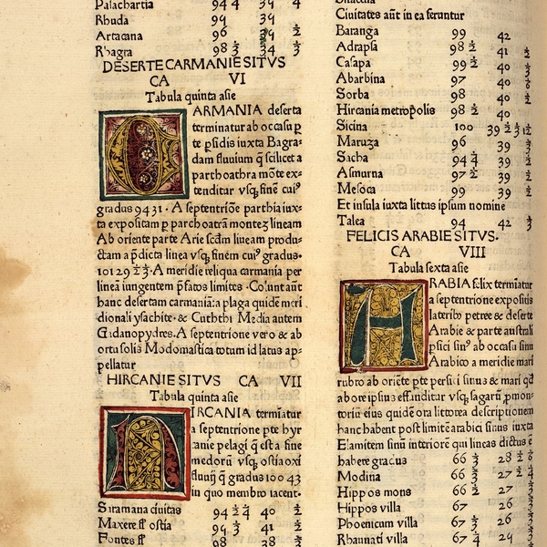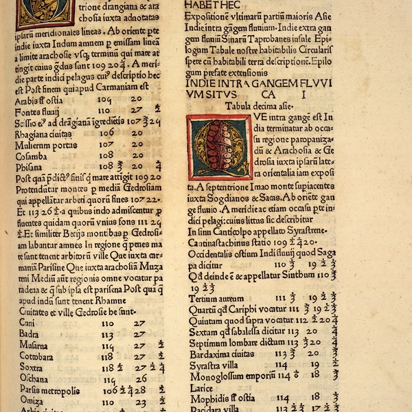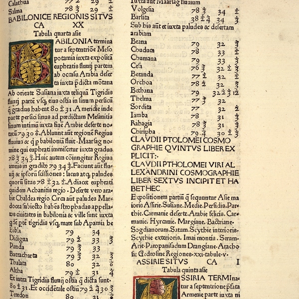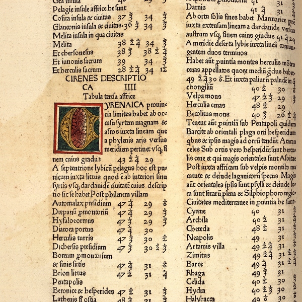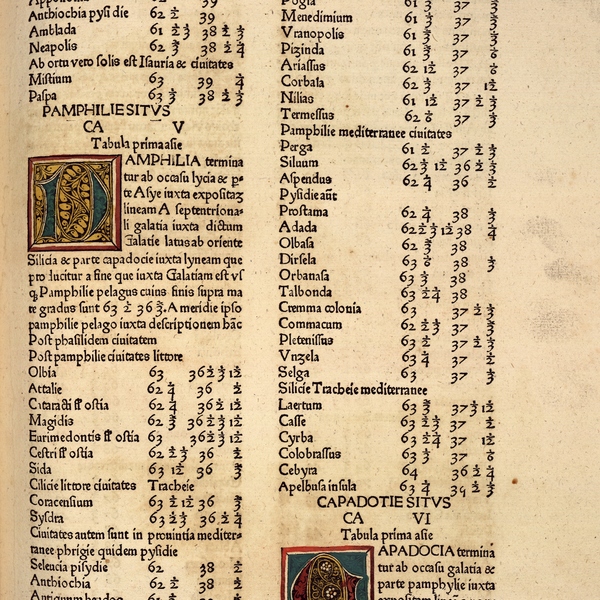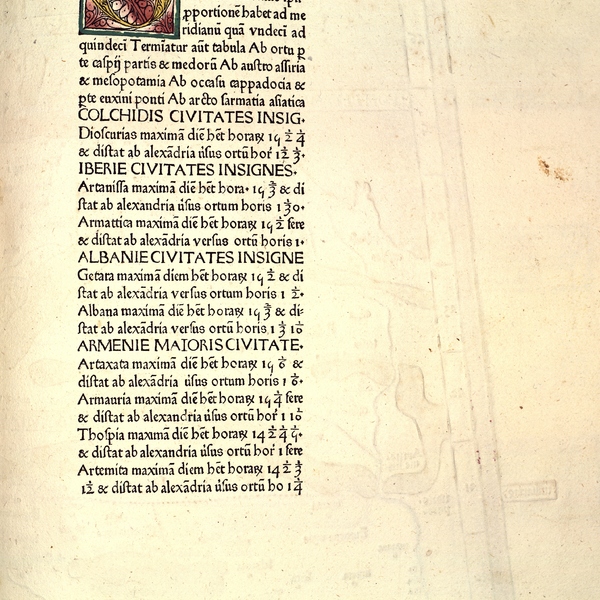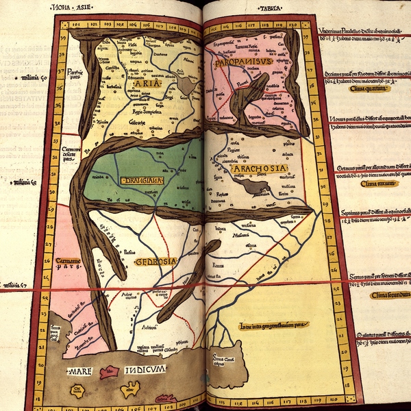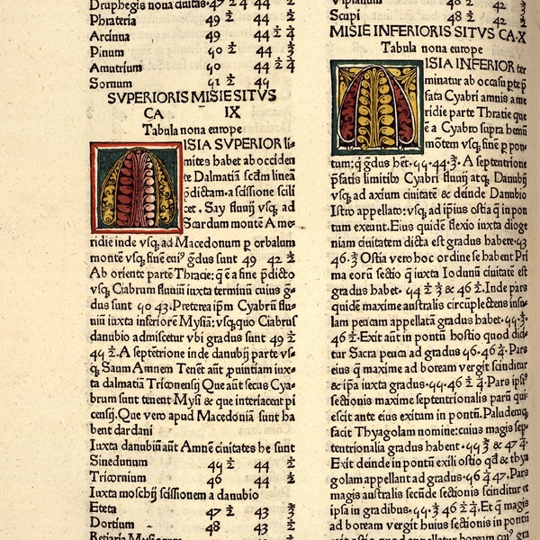 - Ex-libris ms. del Colegio Imperial de la Compañía de Jesús de Madrid. Ingresó en la Biblioteca Histórica procedente de la Facultad de Filología en 2000. Falta la última hoja, sustituida por copia ms. Se inicia con “Registrum alphabeticum super octo libro a Ptolomei incipit feliciter” cuyas primeras cuatro hojas restauradas, presentan pérdida de texto. A continuación el texto de Ptolomeo con 32 mapas. Los cinco mapas modernos aparecen intercalados entre los 26 de Ptolomeo, a continuación del correspondiente al que moderniza: en Europa: Tabula Moderna Hispanie, entre 2 y 3, Tabula Moderna Francie, entre 3 y 4, Tabula Moderna Italie, entre 6 y 7, y Tabula Moderna Prussie, Livonie, Norbegie et Gotcie, entre 8 y 9; en Asia Tabula Moderna Terre Sancte, entre 4 y 5. Al final incluye “De locis ac mirabilibus mundi” (signaturas a-b8, c10), con la particularidad de que el último cuadernillo de esta serie c-10 está intercalado entre los B-8 y C-8 del “Registrum alphabeticum super octo libro a Ptolomei incipit feliciter”. Los grabados xilográficos (mapas e iniciales) están coloreados a mano. Encuadernación de piel vuelta. Cortes dorados y cincelados, con restos de dos iniciales y un escudo en colores.