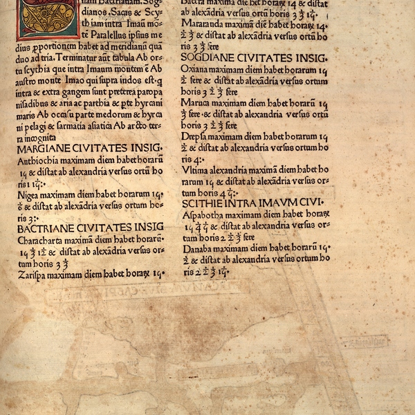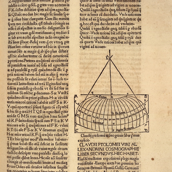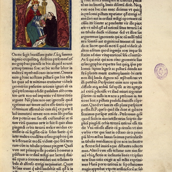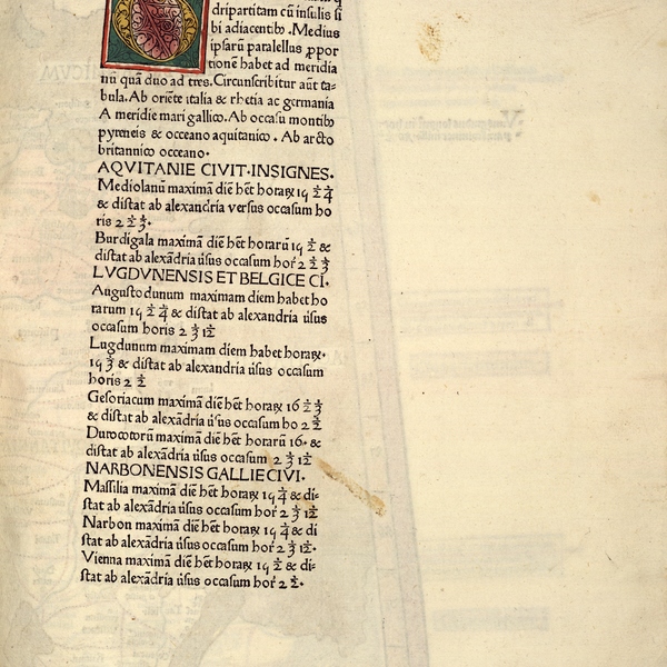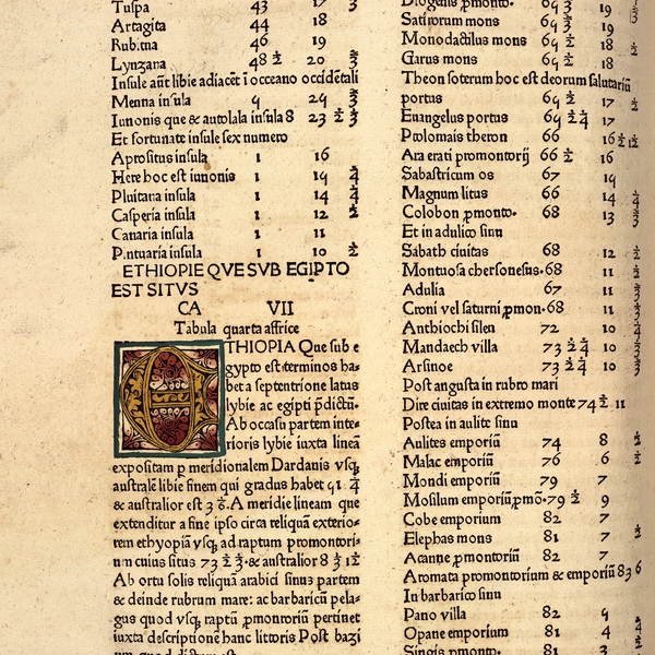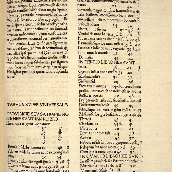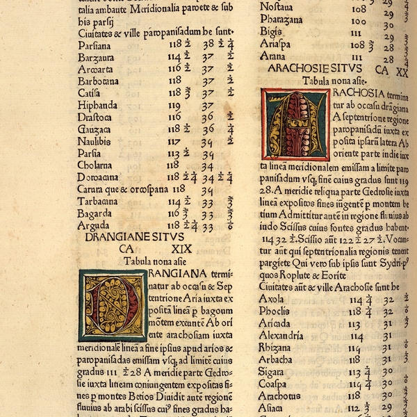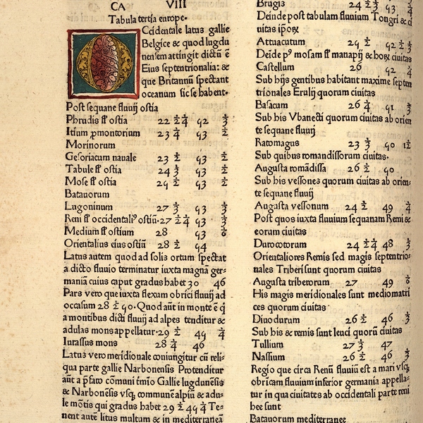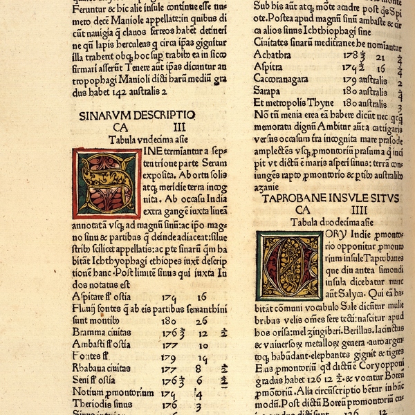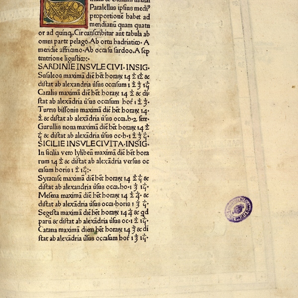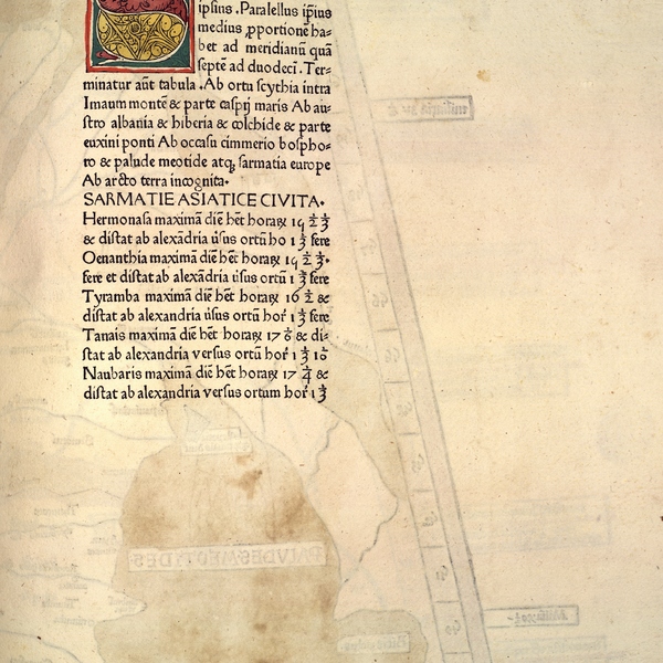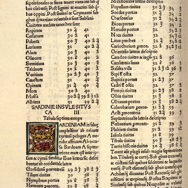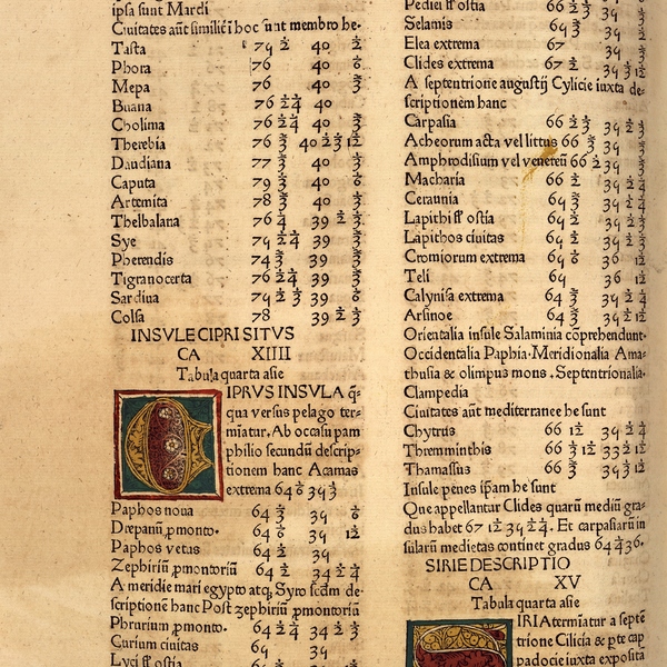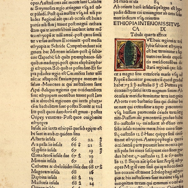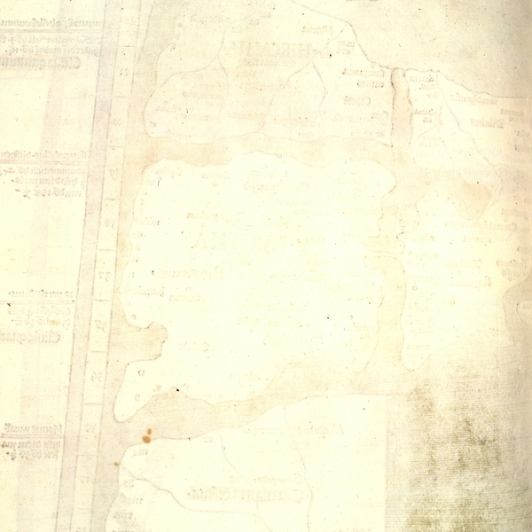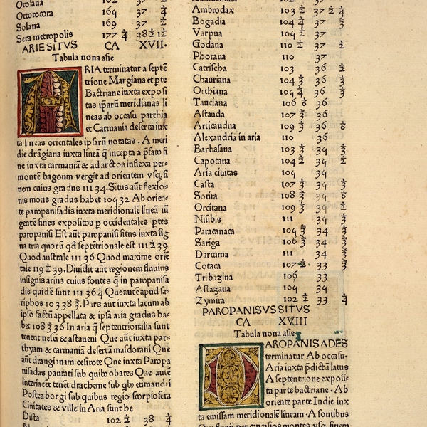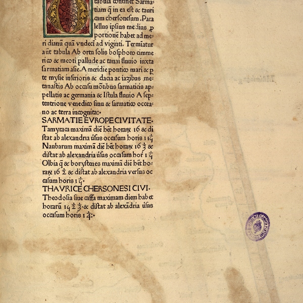 - Ex-libris ms. del Colegio Imperial de la Compañía de Jesús de Madrid. Ingresó en la Biblioteca Histórica procedente de la Facultad de Filología en 2000. Falta la última hoja, sustituida por copia ms. Se inicia con “Registrum alphabeticum super octo libro a Ptolomei incipit feliciter” cuyas primeras cuatro hojas restauradas, presentan pérdida de texto. A continuación el texto de Ptolomeo con 32 mapas. Los cinco mapas modernos aparecen intercalados entre los 26 de Ptolomeo, a continuación del correspondiente al que moderniza: en Europa: Tabula Moderna Hispanie, entre 2 y 3, Tabula Moderna Francie, entre 3 y 4, Tabula Moderna Italie, entre 6 y 7, y Tabula Moderna Prussie, Livonie, Norbegie et Gotcie, entre 8 y 9; en Asia Tabula Moderna Terre Sancte, entre 4 y 5. Al final incluye “De locis ac mirabilibus mundi” (signaturas a-b8, c10), con la particularidad de que el último cuadernillo de esta serie c-10 está intercalado entre los B-8 y C-8 del “Registrum alphabeticum super octo libro a Ptolomei incipit feliciter”. Los grabados xilográficos (mapas e iniciales) están coloreados a mano. Encuadernación de piel vuelta. Cortes dorados y cincelados, con restos de dos iniciales y un escudo en colores.