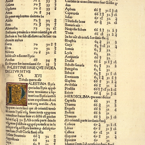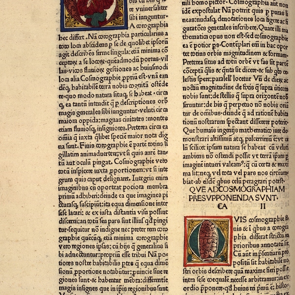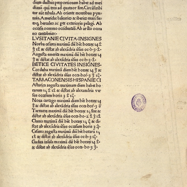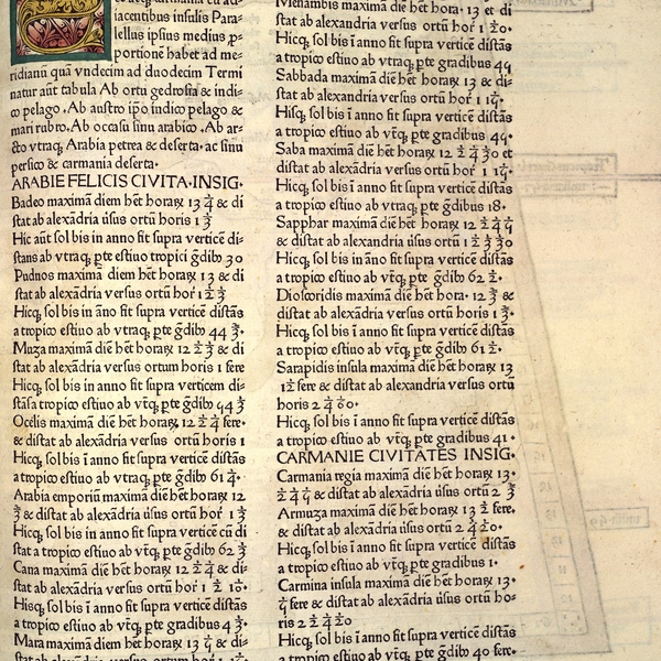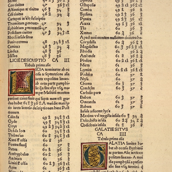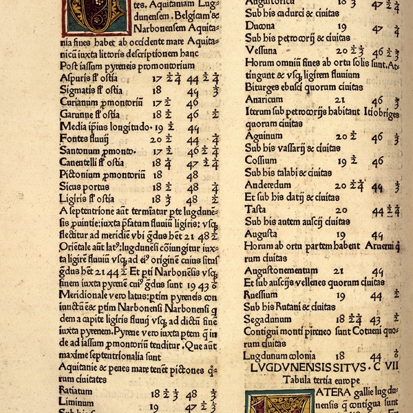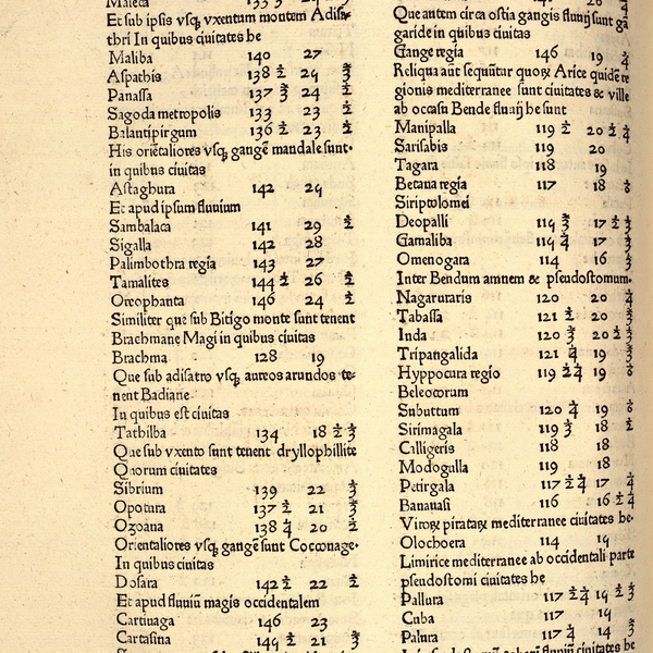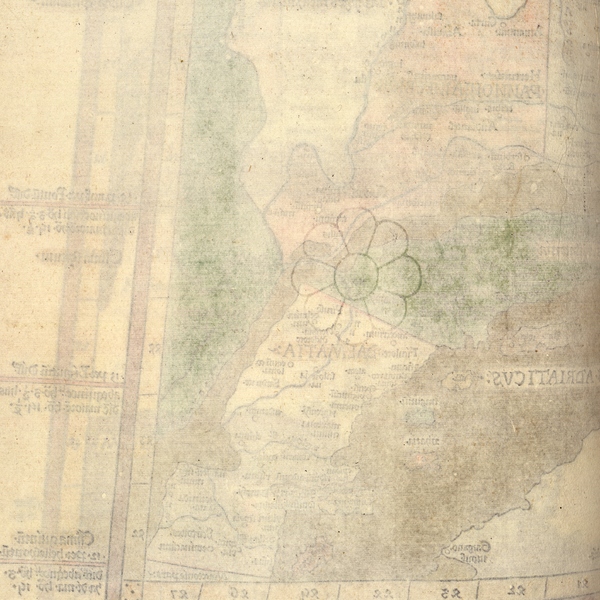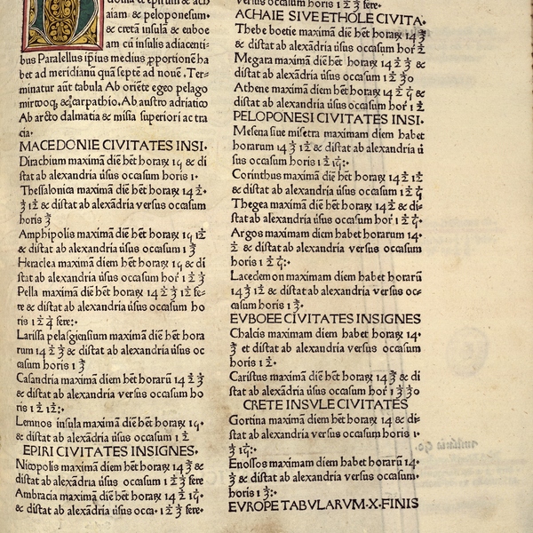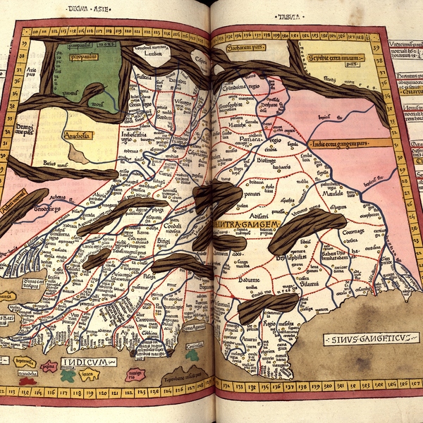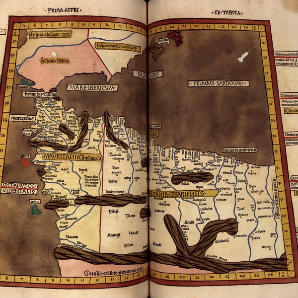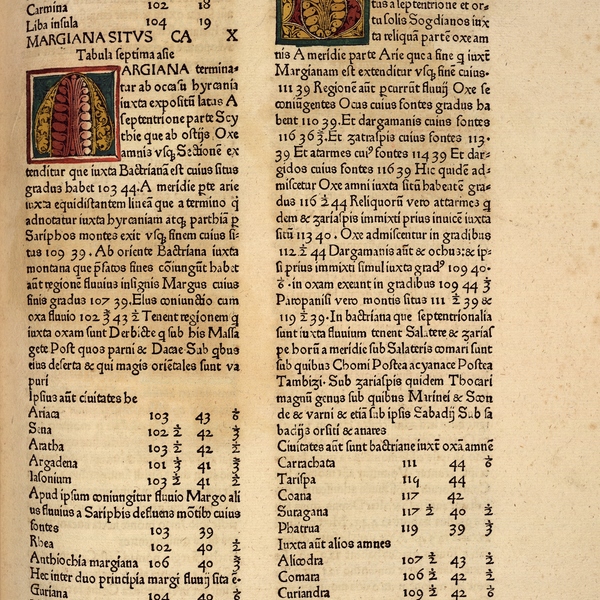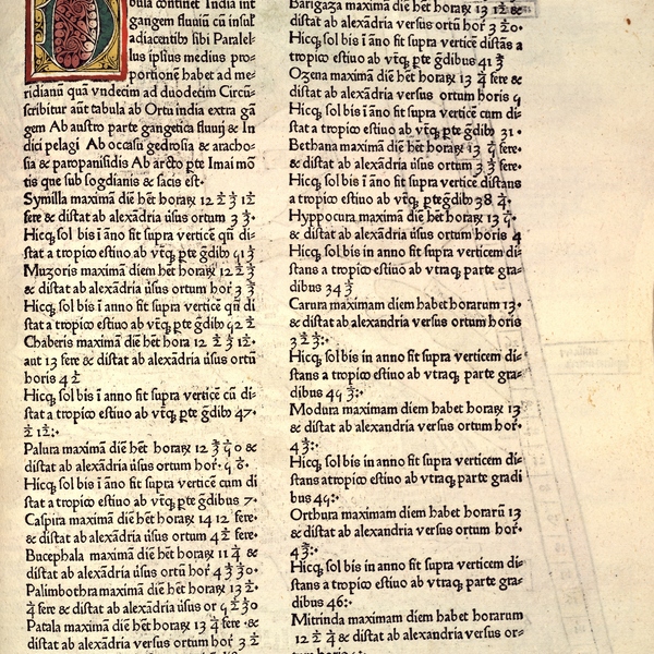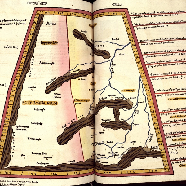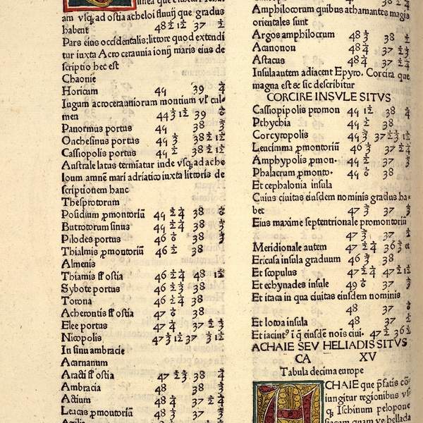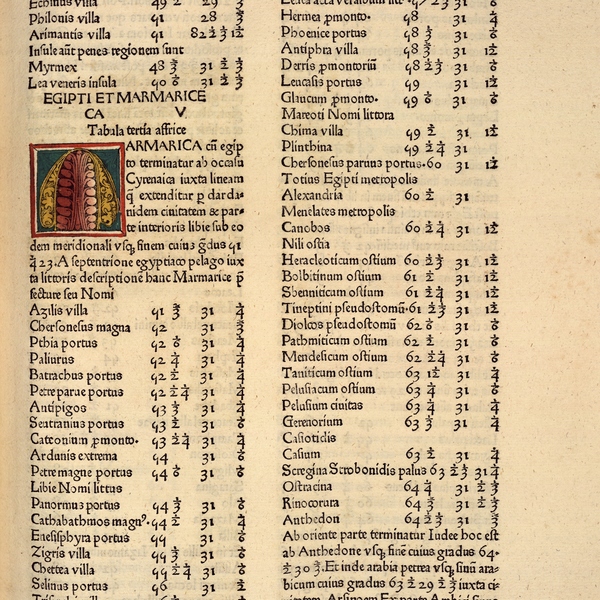 - Ex-libris ms. del Colegio Imperial de la Compañía de Jesús de Madrid. Ingresó en la Biblioteca Histórica procedente de la Facultad de Filología en 2000. Falta la última hoja, sustituida por copia ms. Se inicia con “Registrum alphabeticum super octo libro a Ptolomei incipit feliciter” cuyas primeras cuatro hojas restauradas, presentan pérdida de texto. A continuación el texto de Ptolomeo con 32 mapas. Los cinco mapas modernos aparecen intercalados entre los 26 de Ptolomeo, a continuación del correspondiente al que moderniza: en Europa: Tabula Moderna Hispanie, entre 2 y 3, Tabula Moderna Francie, entre 3 y 4, Tabula Moderna Italie, entre 6 y 7, y Tabula Moderna Prussie, Livonie, Norbegie et Gotcie, entre 8 y 9; en Asia Tabula Moderna Terre Sancte, entre 4 y 5. Al final incluye “De locis ac mirabilibus mundi” (signaturas a-b8, c10), con la particularidad de que el último cuadernillo de esta serie c-10 está intercalado entre los B-8 y C-8 del “Registrum alphabeticum super octo libro a Ptolomei incipit feliciter”. Los grabados xilográficos (mapas e iniciales) están coloreados a mano. Encuadernación de piel vuelta. Cortes dorados y cincelados, con restos de dos iniciales y un escudo en colores.