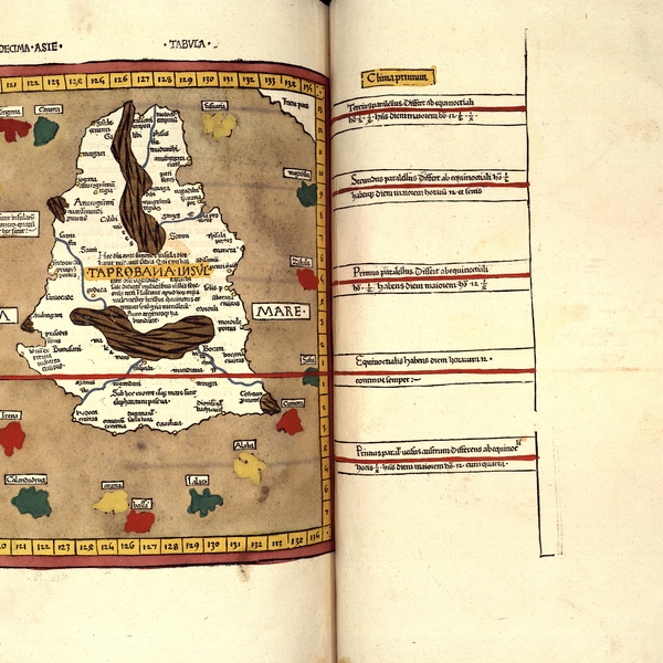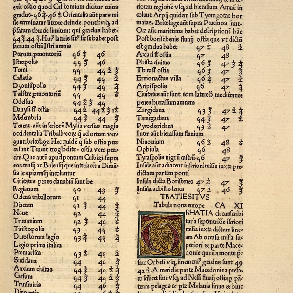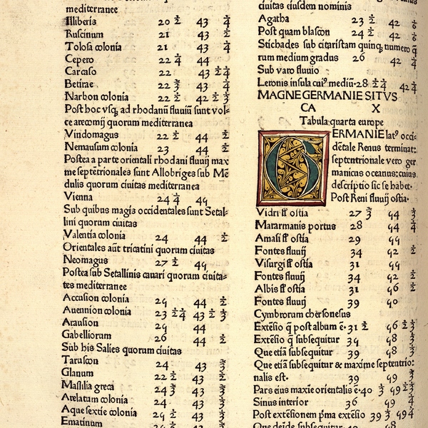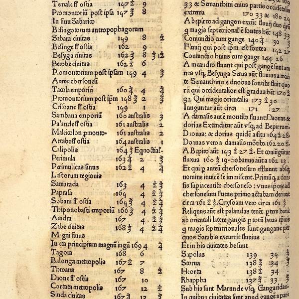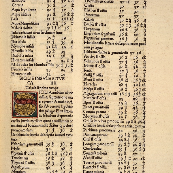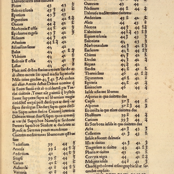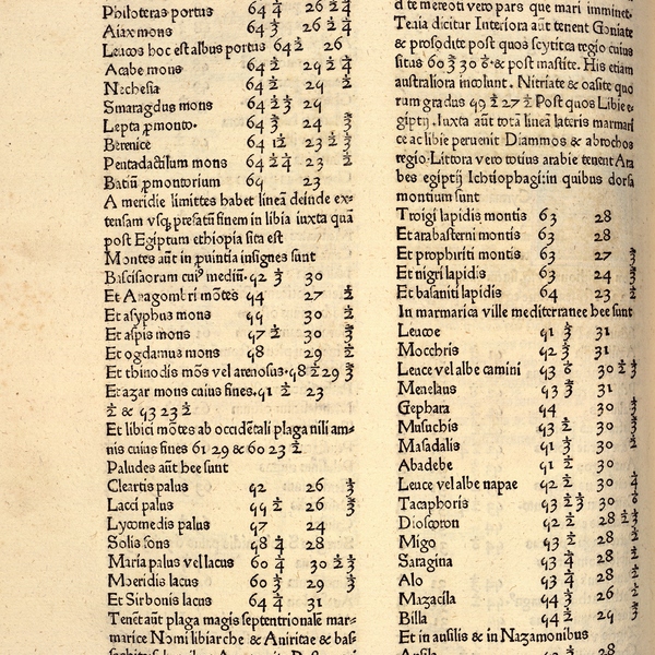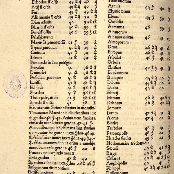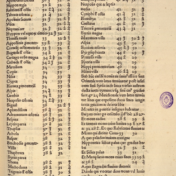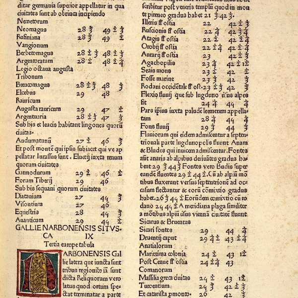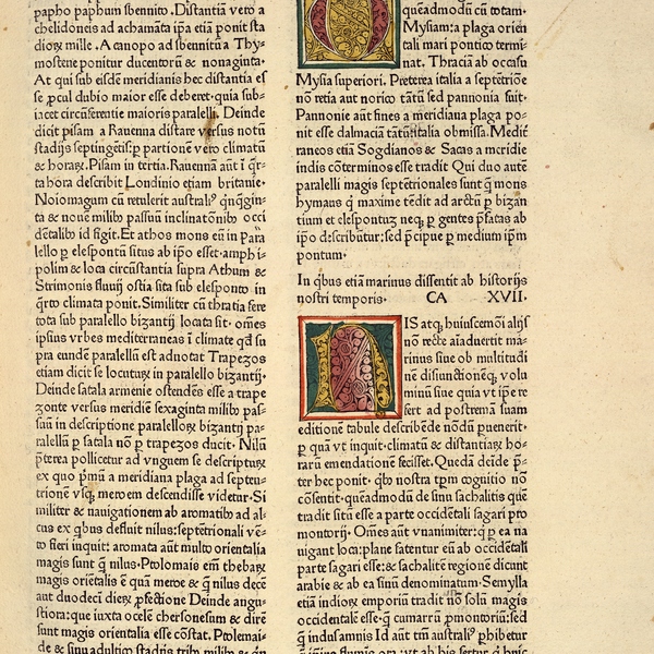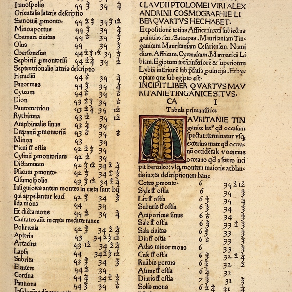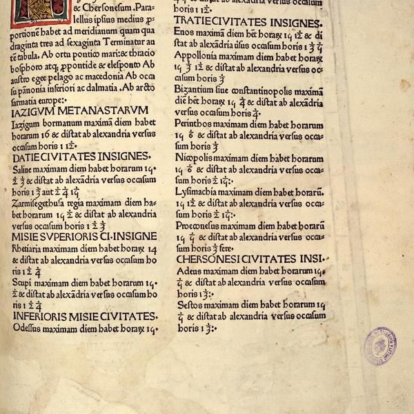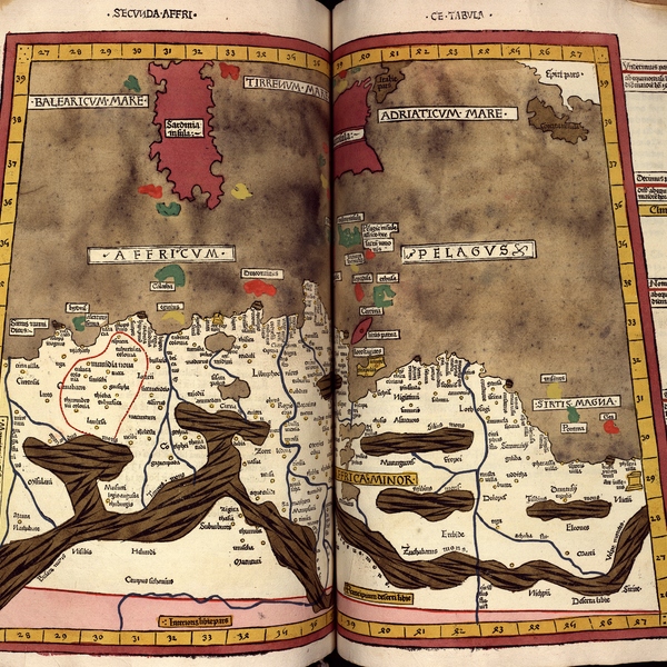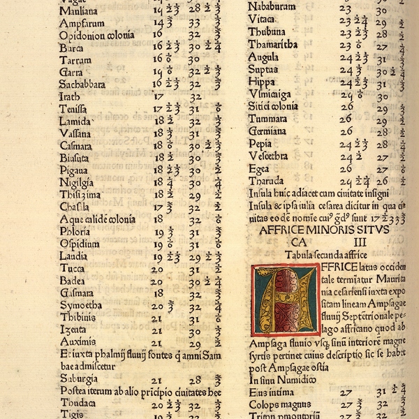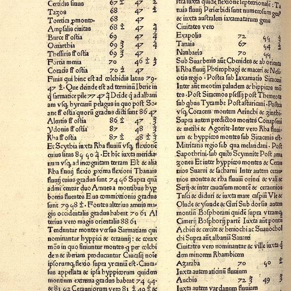 - Ex-libris ms. del Colegio Imperial de la Compañía de Jesús de Madrid. Ingresó en la Biblioteca Histórica procedente de la Facultad de Filología en 2000. Falta la última hoja, sustituida por copia ms. Se inicia con “Registrum alphabeticum super octo libro a Ptolomei incipit feliciter” cuyas primeras cuatro hojas restauradas, presentan pérdida de texto. A continuación el texto de Ptolomeo con 32 mapas. Los cinco mapas modernos aparecen intercalados entre los 26 de Ptolomeo, a continuación del correspondiente al que moderniza: en Europa: Tabula Moderna Hispanie, entre 2 y 3, Tabula Moderna Francie, entre 3 y 4, Tabula Moderna Italie, entre 6 y 7, y Tabula Moderna Prussie, Livonie, Norbegie et Gotcie, entre 8 y 9; en Asia Tabula Moderna Terre Sancte, entre 4 y 5. Al final incluye “De locis ac mirabilibus mundi” (signaturas a-b8, c10), con la particularidad de que el último cuadernillo de esta serie c-10 está intercalado entre los B-8 y C-8 del “Registrum alphabeticum super octo libro a Ptolomei incipit feliciter”. Los grabados xilográficos (mapas e iniciales) están coloreados a mano. Encuadernación de piel vuelta. Cortes dorados y cincelados, con restos de dos iniciales y un escudo en colores.