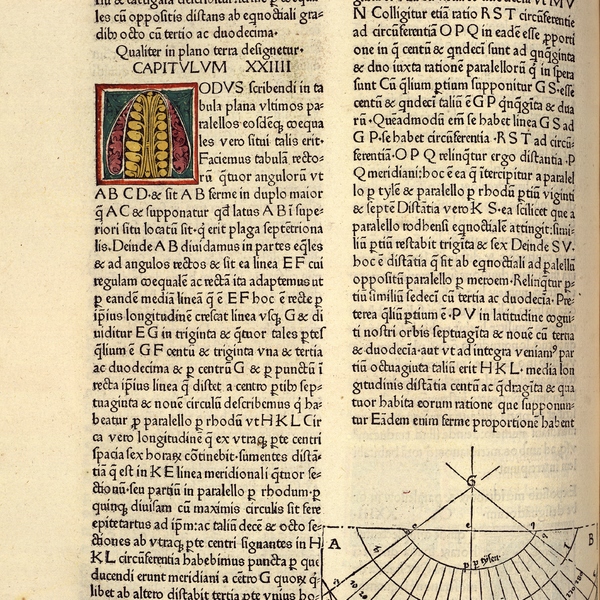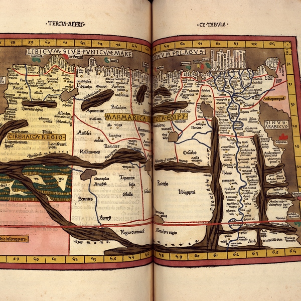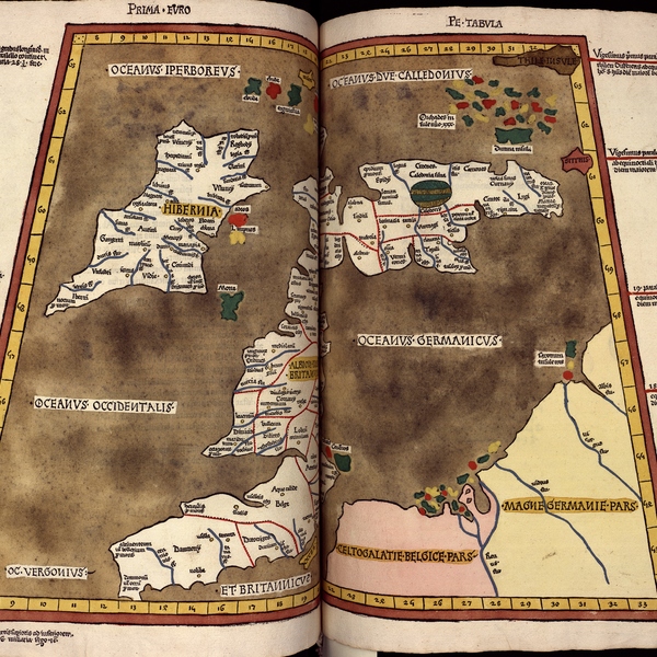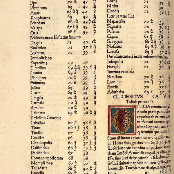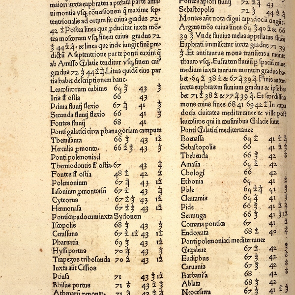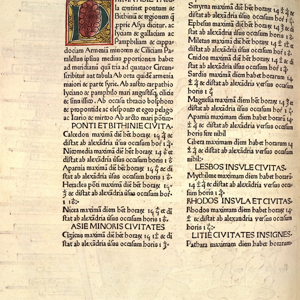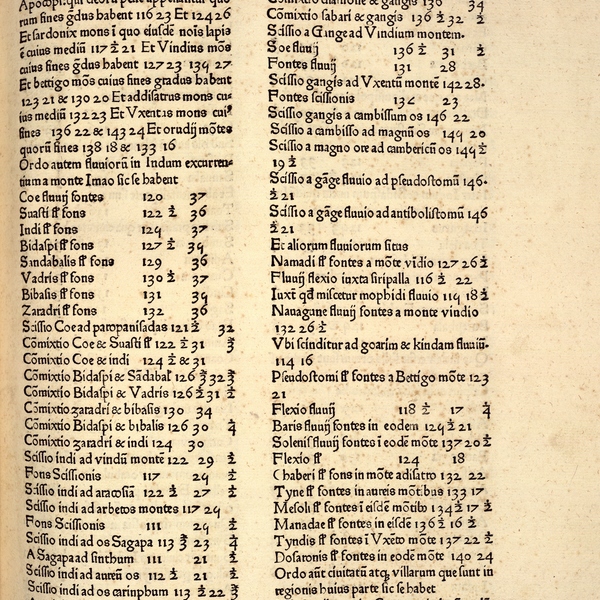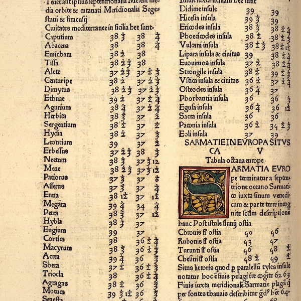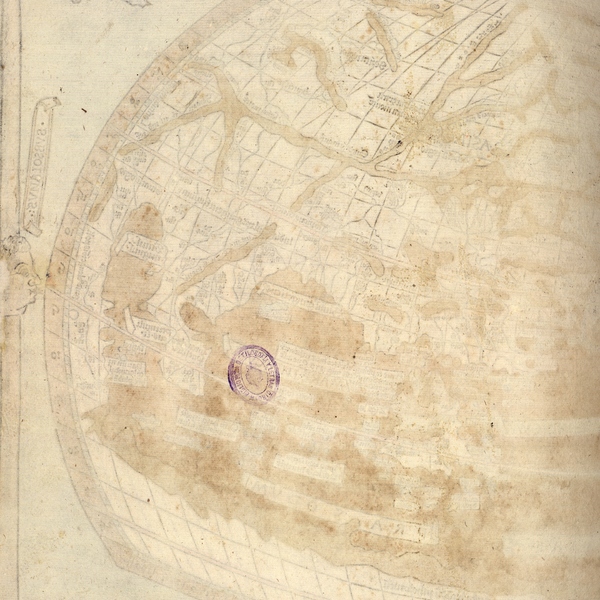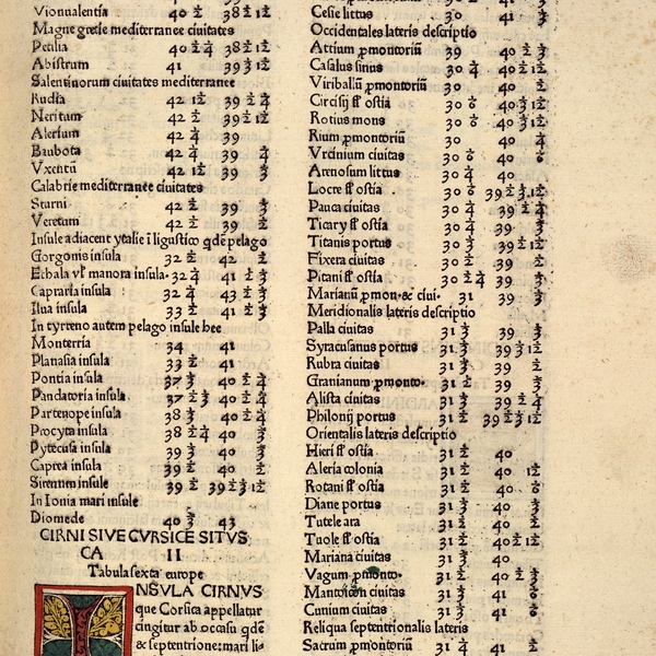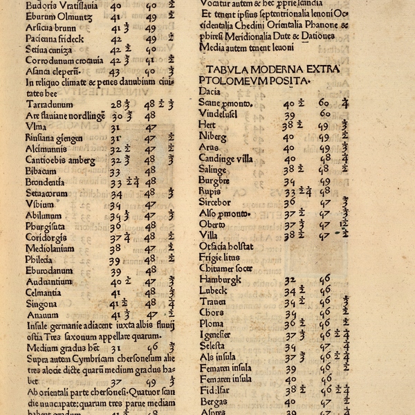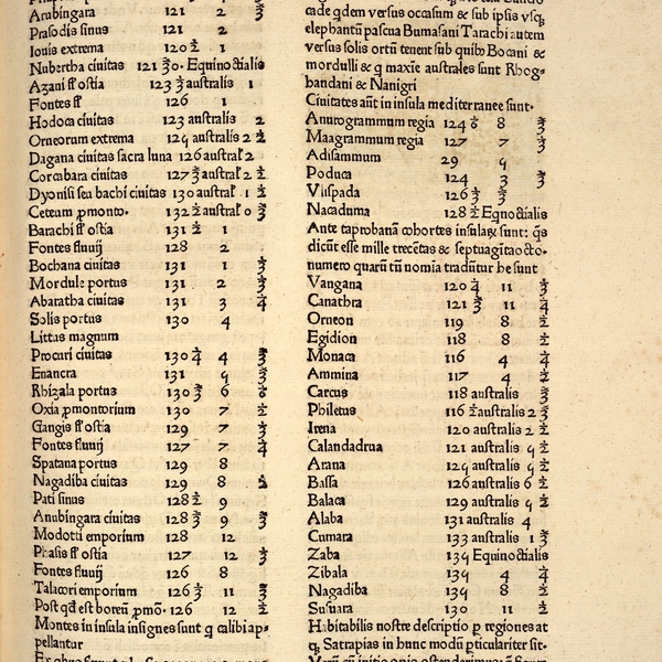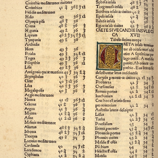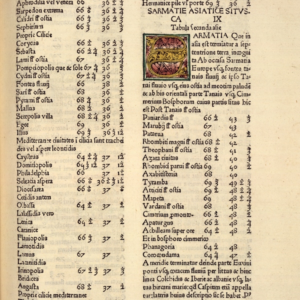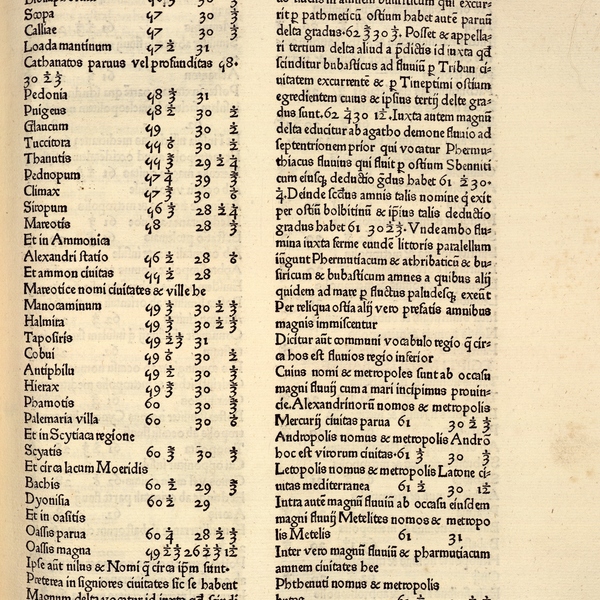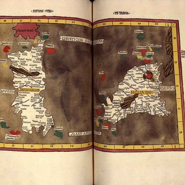 - Ex-libris ms. del Colegio Imperial de la Compañía de Jesús de Madrid. Ingresó en la Biblioteca Histórica procedente de la Facultad de Filología en 2000. Falta la última hoja, sustituida por copia ms. Se inicia con “Registrum alphabeticum super octo libro a Ptolomei incipit feliciter” cuyas primeras cuatro hojas restauradas, presentan pérdida de texto. A continuación el texto de Ptolomeo con 32 mapas. Los cinco mapas modernos aparecen intercalados entre los 26 de Ptolomeo, a continuación del correspondiente al que moderniza: en Europa: Tabula Moderna Hispanie, entre 2 y 3, Tabula Moderna Francie, entre 3 y 4, Tabula Moderna Italie, entre 6 y 7, y Tabula Moderna Prussie, Livonie, Norbegie et Gotcie, entre 8 y 9; en Asia Tabula Moderna Terre Sancte, entre 4 y 5. Al final incluye “De locis ac mirabilibus mundi” (signaturas a-b8, c10), con la particularidad de que el último cuadernillo de esta serie c-10 está intercalado entre los B-8 y C-8 del “Registrum alphabeticum super octo libro a Ptolomei incipit feliciter”. Los grabados xilográficos (mapas e iniciales) están coloreados a mano. Encuadernación de piel vuelta. Cortes dorados y cincelados, con restos de dos iniciales y un escudo en colores.
