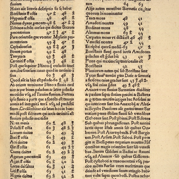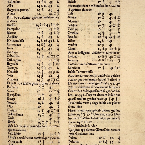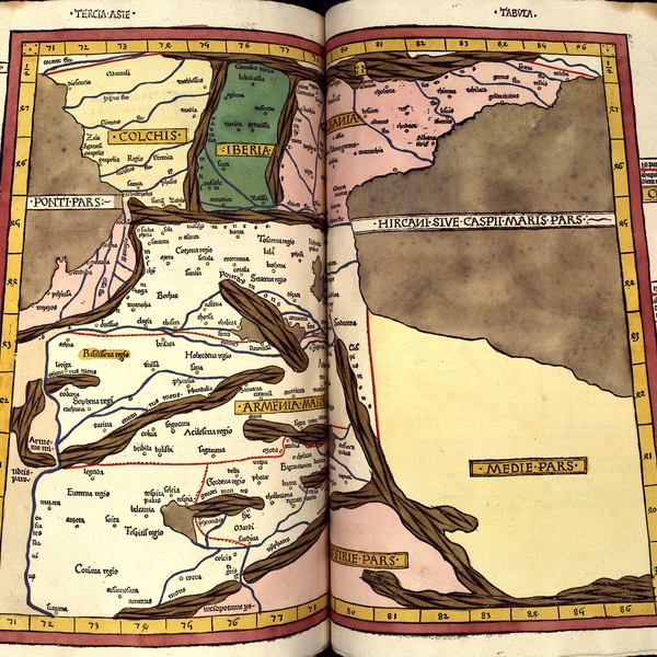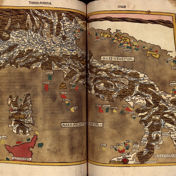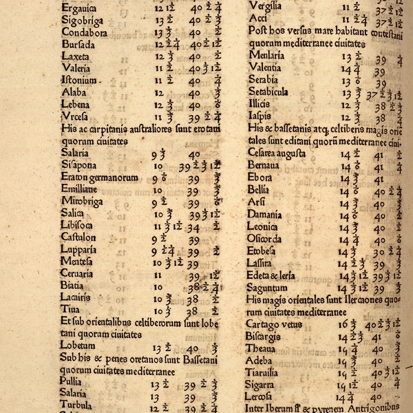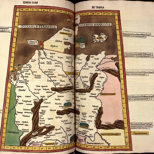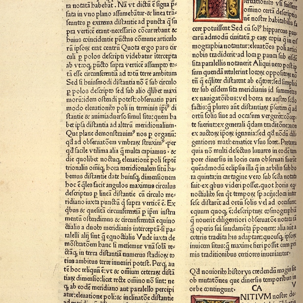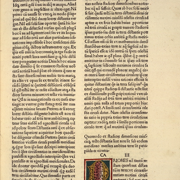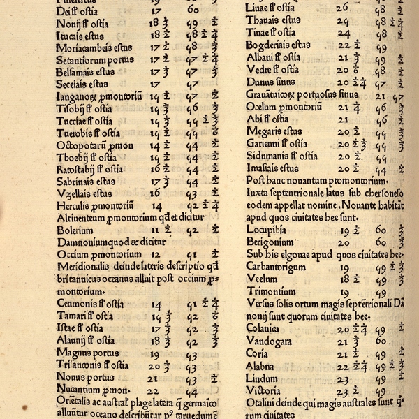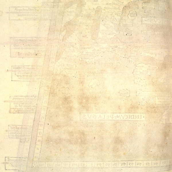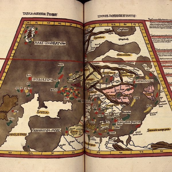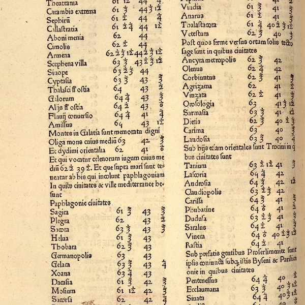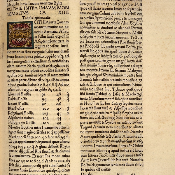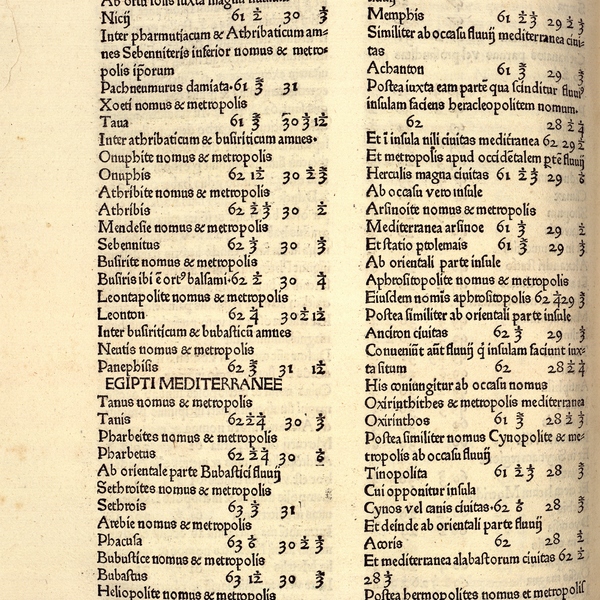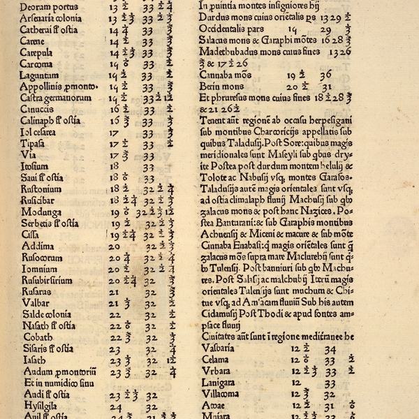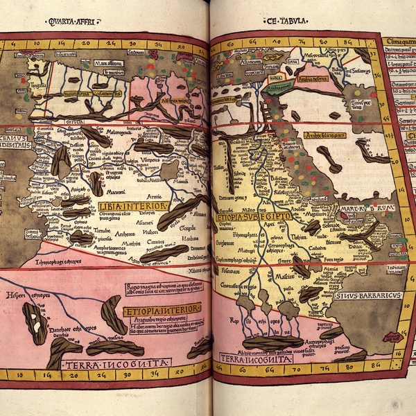- Ex-libris ms. del Colegio Imperial de la Compañía de Jesús de Madrid. Ingresó en la Biblioteca Histórica procedente de la Facultad de Filología en 2000. Falta la última hoja, sustituida por copia ms. Se inicia con “Registrum alphabeticum super octo libro a Ptolomei incipit feliciter” cuyas primeras cuatro hojas restauradas, presentan pérdida de texto. A continuación el texto de Ptolomeo con 32 mapas. Los cinco mapas modernos aparecen intercalados entre los 26 de Ptolomeo, a continuación del correspondiente al que moderniza: en Europa: Tabula Moderna Hispanie, entre 2 y 3, Tabula Moderna Francie, entre 3 y 4, Tabula Moderna Italie, entre 6 y 7, y Tabula Moderna Prussie, Livonie, Norbegie et Gotcie, entre 8 y 9; en Asia Tabula Moderna Terre Sancte, entre 4 y 5. Al final incluye “De locis ac mirabilibus mundi” (signaturas a-b8, c10), con la particularidad de que el último cuadernillo de esta serie c-10 está intercalado entre los B-8 y C-8 del “Registrum alphabeticum super octo libro a Ptolomei incipit feliciter”. Los grabados xilográficos (mapas e iniciales) están coloreados a mano. Encuadernación de piel vuelta. Cortes dorados y cincelados, con restos de dos iniciales y un escudo en colores.