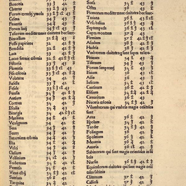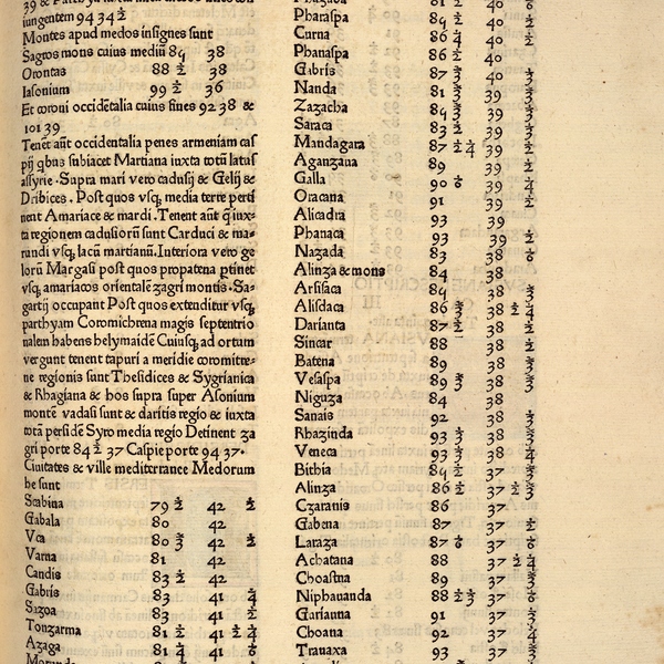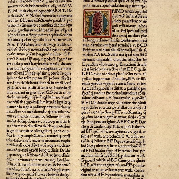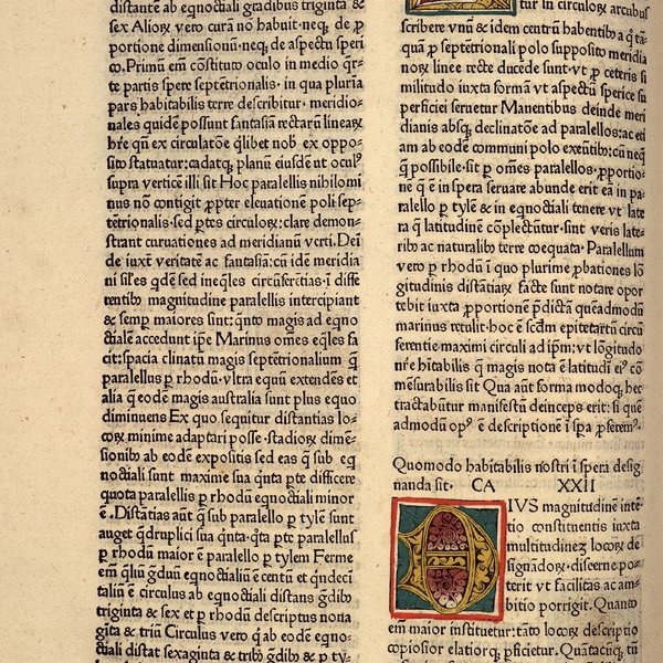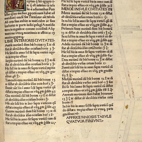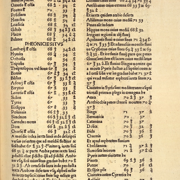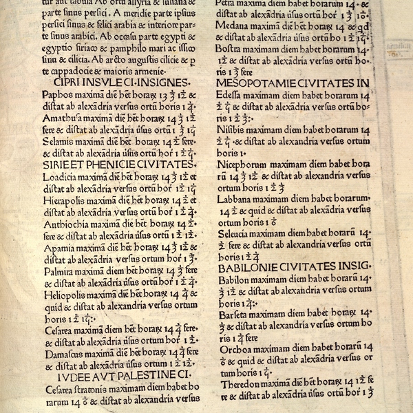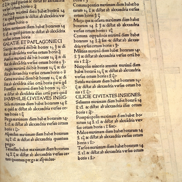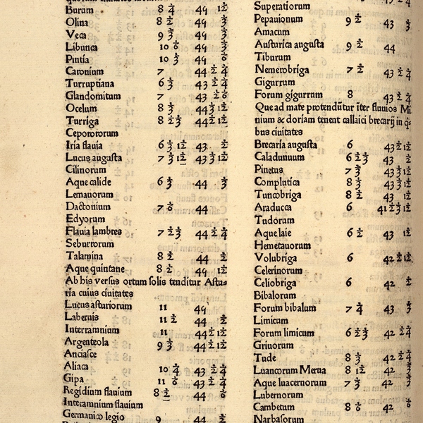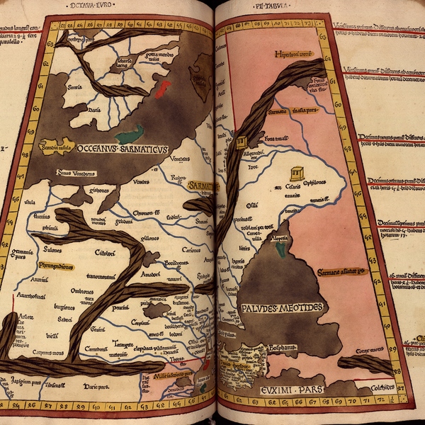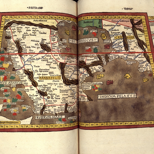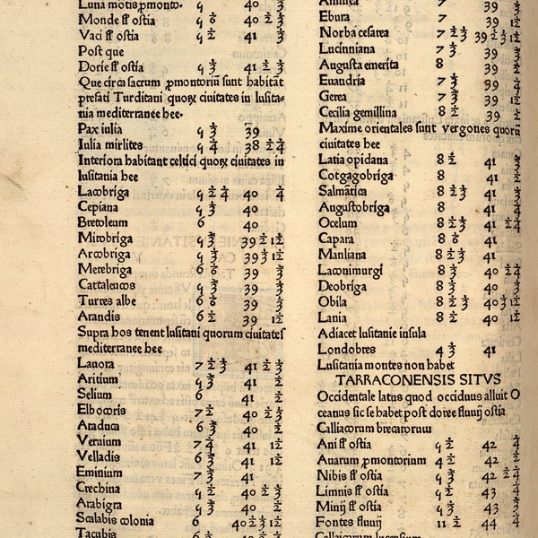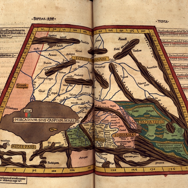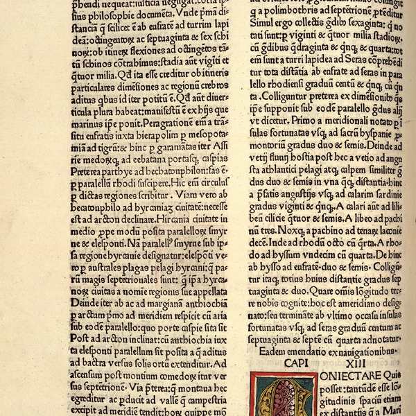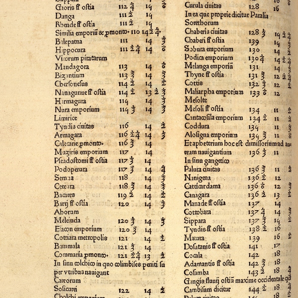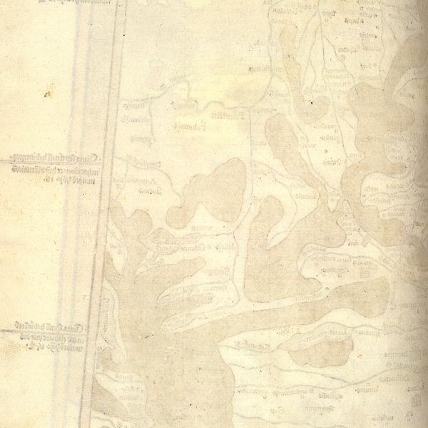 - Ex-libris ms. del Colegio Imperial de la Compañía de Jesús de Madrid. Ingresó en la Biblioteca Histórica procedente de la Facultad de Filología en 2000. Falta la última hoja, sustituida por copia ms. Se inicia con “Registrum alphabeticum super octo libro a Ptolomei incipit feliciter” cuyas primeras cuatro hojas restauradas, presentan pérdida de texto. A continuación el texto de Ptolomeo con 32 mapas. Los cinco mapas modernos aparecen intercalados entre los 26 de Ptolomeo, a continuación del correspondiente al que moderniza: en Europa: Tabula Moderna Hispanie, entre 2 y 3, Tabula Moderna Francie, entre 3 y 4, Tabula Moderna Italie, entre 6 y 7, y Tabula Moderna Prussie, Livonie, Norbegie et Gotcie, entre 8 y 9; en Asia Tabula Moderna Terre Sancte, entre 4 y 5. Al final incluye “De locis ac mirabilibus mundi” (signaturas a-b8, c10), con la particularidad de que el último cuadernillo de esta serie c-10 está intercalado entre los B-8 y C-8 del “Registrum alphabeticum super octo libro a Ptolomei incipit feliciter”. Los grabados xilográficos (mapas e iniciales) están coloreados a mano. Encuadernación de piel vuelta. Cortes dorados y cincelados, con restos de dos iniciales y un escudo en colores.