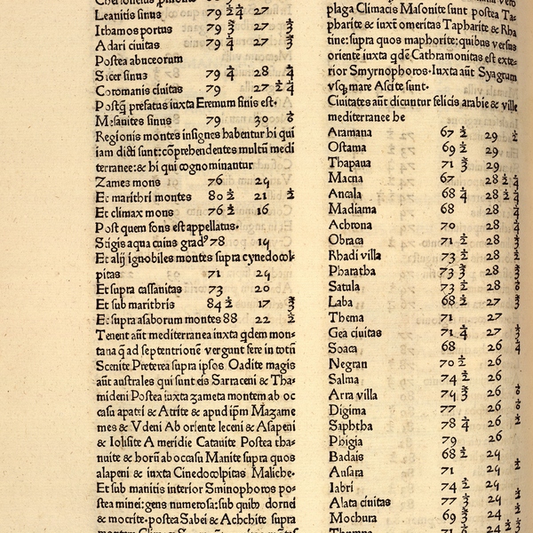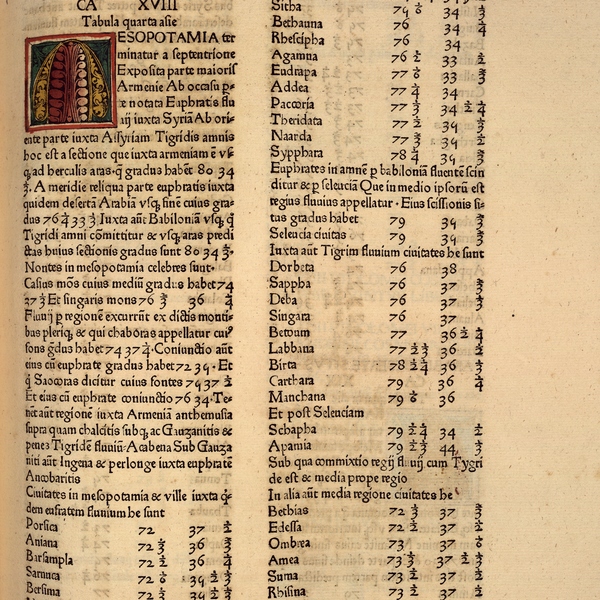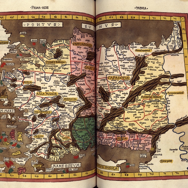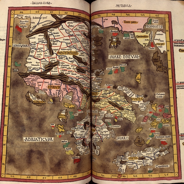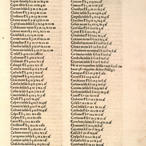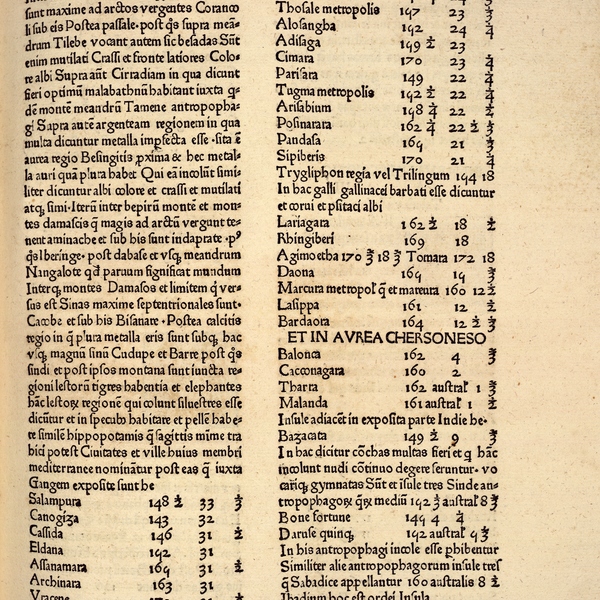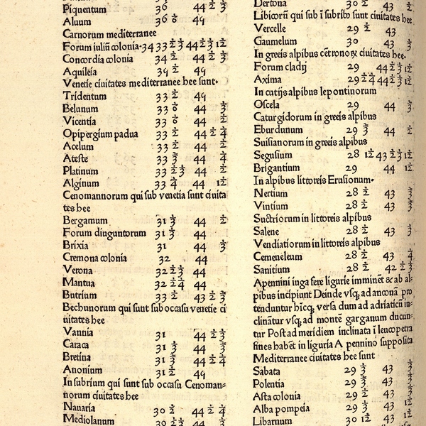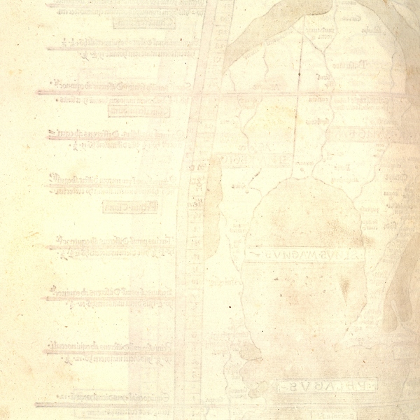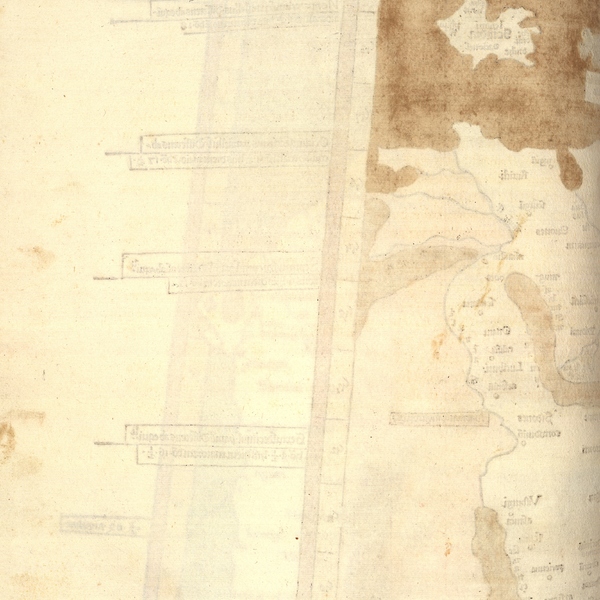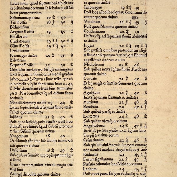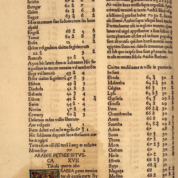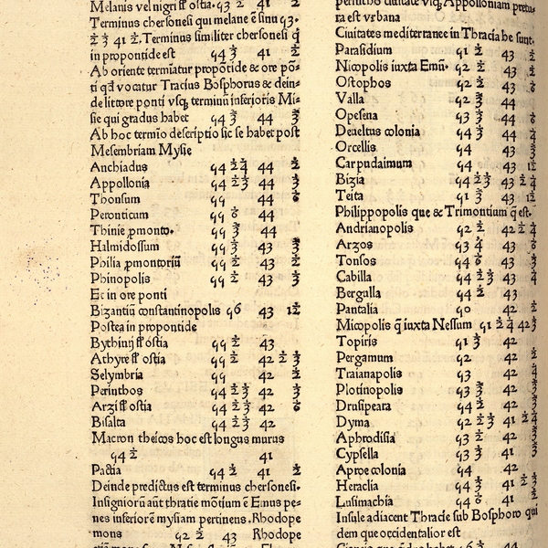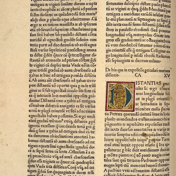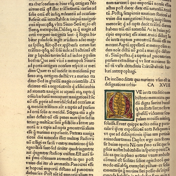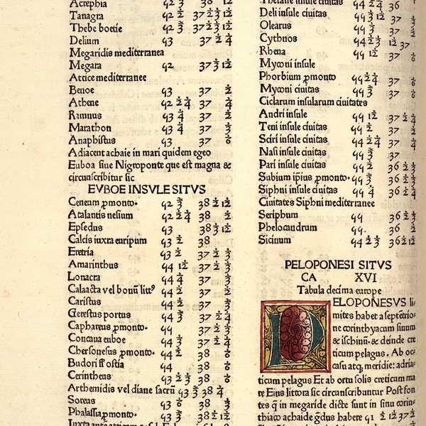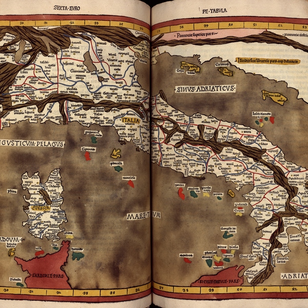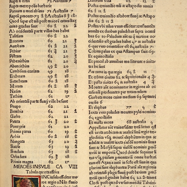 - Ex-libris ms. del Colegio Imperial de la Compañía de Jesús de Madrid. Ingresó en la Biblioteca Histórica procedente de la Facultad de Filología en 2000. Falta la última hoja, sustituida por copia ms. Se inicia con “Registrum alphabeticum super octo libro a Ptolomei incipit feliciter” cuyas primeras cuatro hojas restauradas, presentan pérdida de texto. A continuación el texto de Ptolomeo con 32 mapas. Los cinco mapas modernos aparecen intercalados entre los 26 de Ptolomeo, a continuación del correspondiente al que moderniza: en Europa: Tabula Moderna Hispanie, entre 2 y 3, Tabula Moderna Francie, entre 3 y 4, Tabula Moderna Italie, entre 6 y 7, y Tabula Moderna Prussie, Livonie, Norbegie et Gotcie, entre 8 y 9; en Asia Tabula Moderna Terre Sancte, entre 4 y 5. Al final incluye “De locis ac mirabilibus mundi” (signaturas a-b8, c10), con la particularidad de que el último cuadernillo de esta serie c-10 está intercalado entre los B-8 y C-8 del “Registrum alphabeticum super octo libro a Ptolomei incipit feliciter”. Los grabados xilográficos (mapas e iniciales) están coloreados a mano. Encuadernación de piel vuelta. Cortes dorados y cincelados, con restos de dos iniciales y un escudo en colores.
