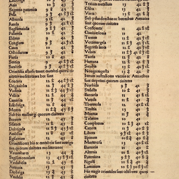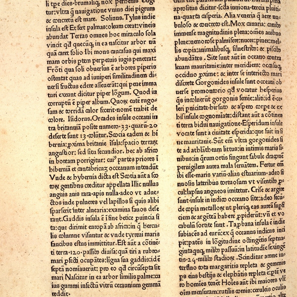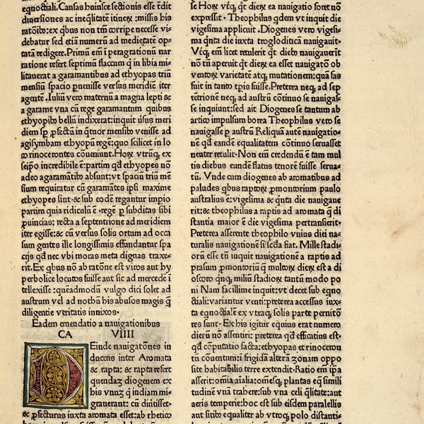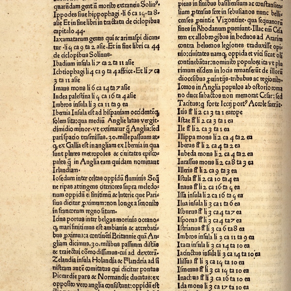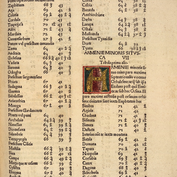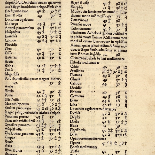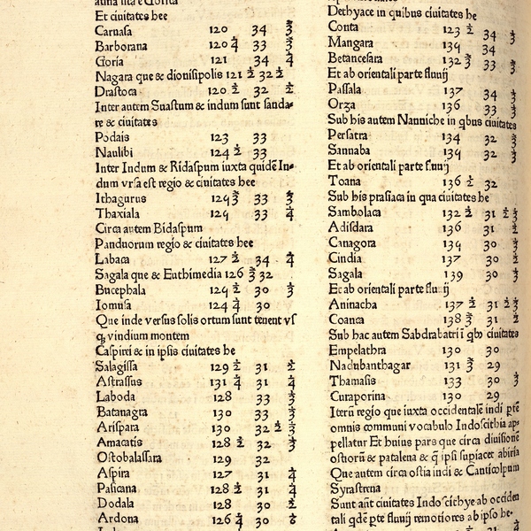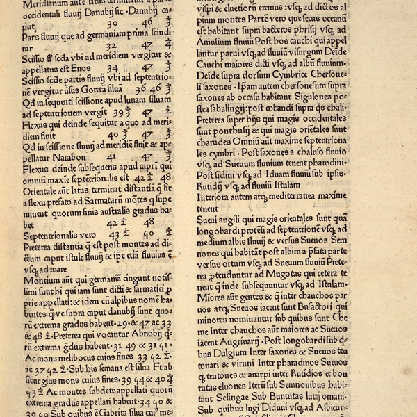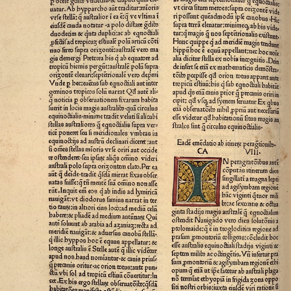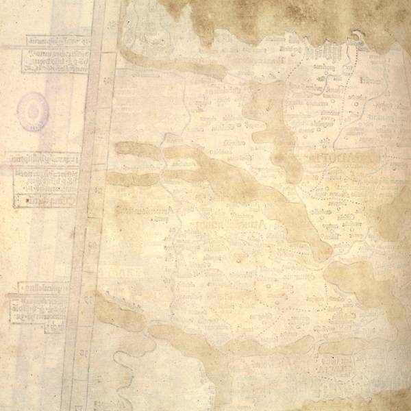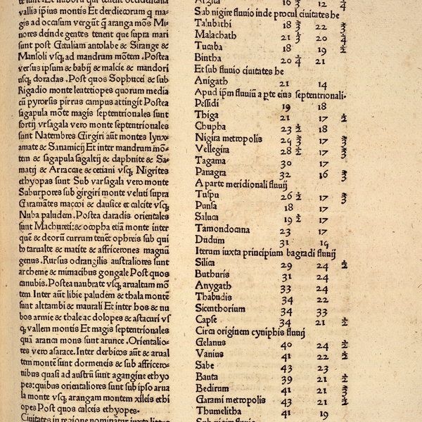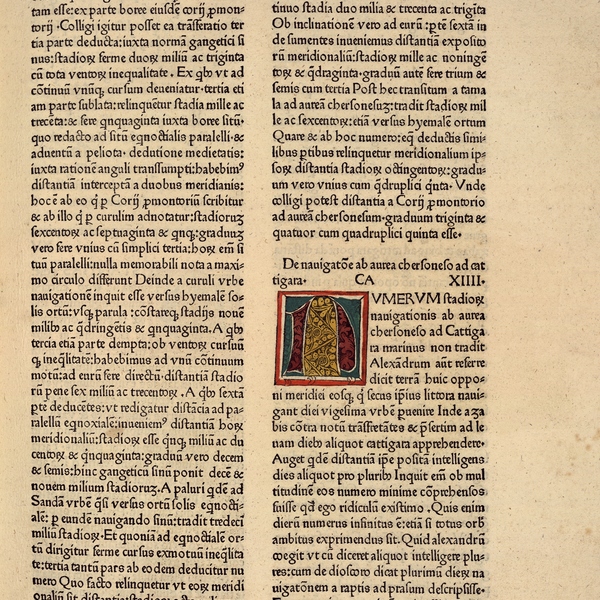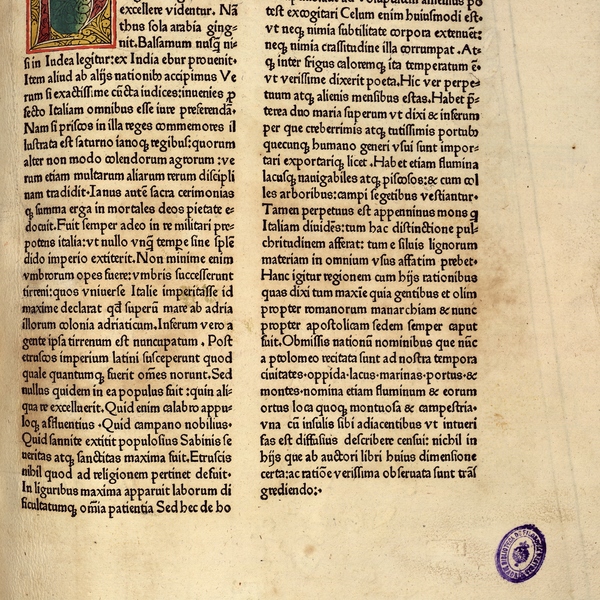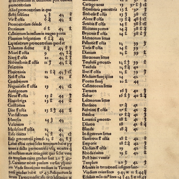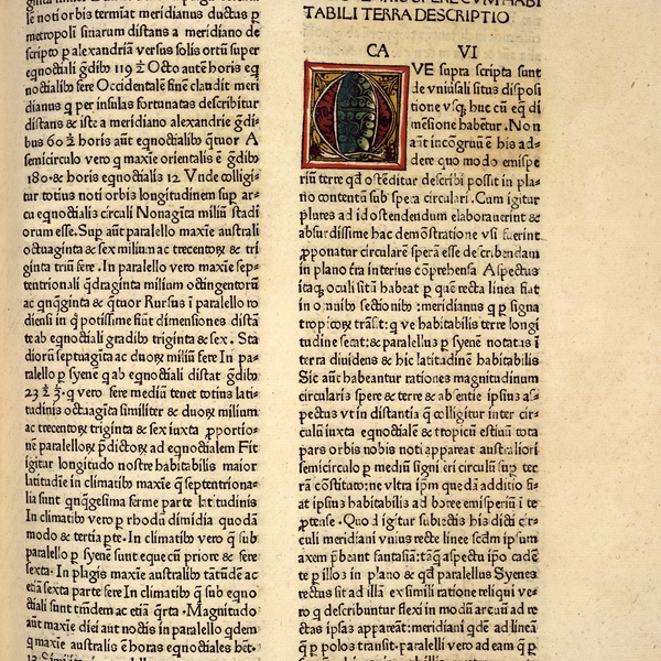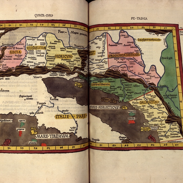 - Ex-libris ms. del Colegio Imperial de la Compañía de Jesús de Madrid. Ingresó en la Biblioteca Histórica procedente de la Facultad de Filología en 2000. Falta la última hoja, sustituida por copia ms. Se inicia con “Registrum alphabeticum super octo libro a Ptolomei incipit feliciter” cuyas primeras cuatro hojas restauradas, presentan pérdida de texto. A continuación el texto de Ptolomeo con 32 mapas. Los cinco mapas modernos aparecen intercalados entre los 26 de Ptolomeo, a continuación del correspondiente al que moderniza: en Europa: Tabula Moderna Hispanie, entre 2 y 3, Tabula Moderna Francie, entre 3 y 4, Tabula Moderna Italie, entre 6 y 7, y Tabula Moderna Prussie, Livonie, Norbegie et Gotcie, entre 8 y 9; en Asia Tabula Moderna Terre Sancte, entre 4 y 5. Al final incluye “De locis ac mirabilibus mundi” (signaturas a-b8, c10), con la particularidad de que el último cuadernillo de esta serie c-10 está intercalado entre los B-8 y C-8 del “Registrum alphabeticum super octo libro a Ptolomei incipit feliciter”. Los grabados xilográficos (mapas e iniciales) están coloreados a mano. Encuadernación de piel vuelta. Cortes dorados y cincelados, con restos de dos iniciales y un escudo en colores.