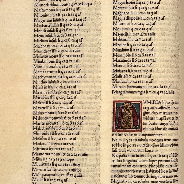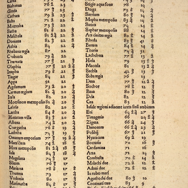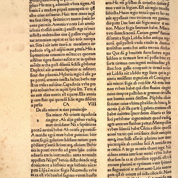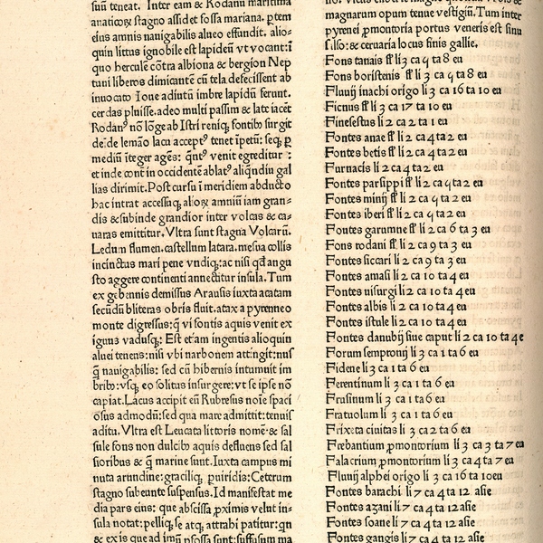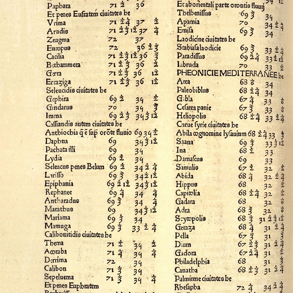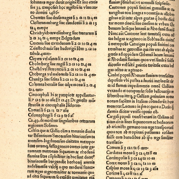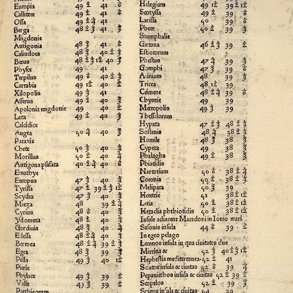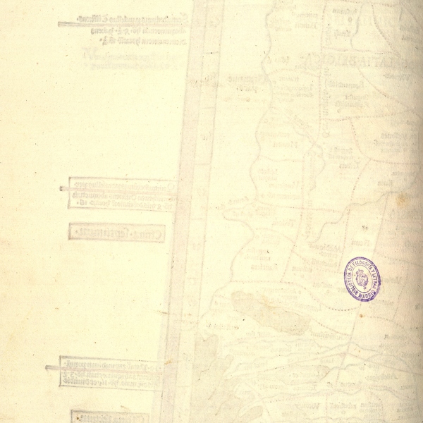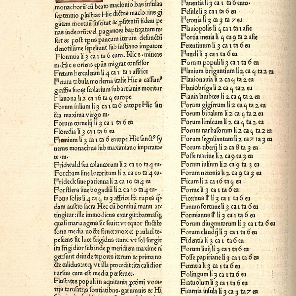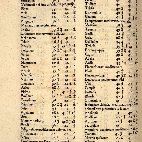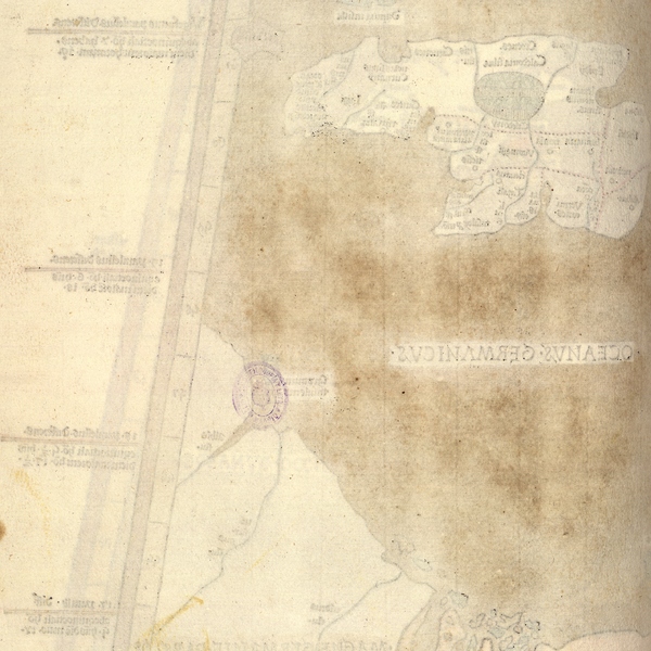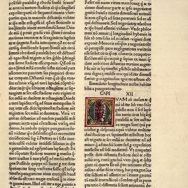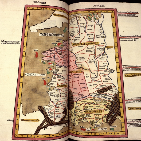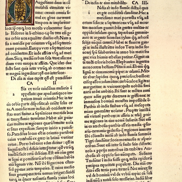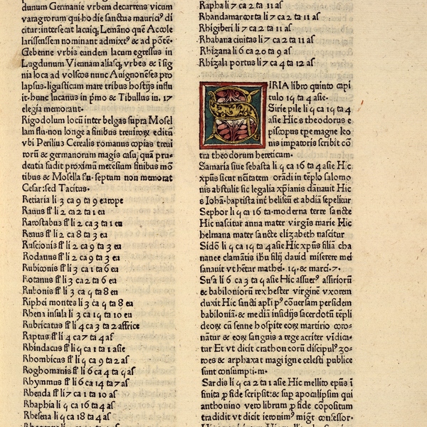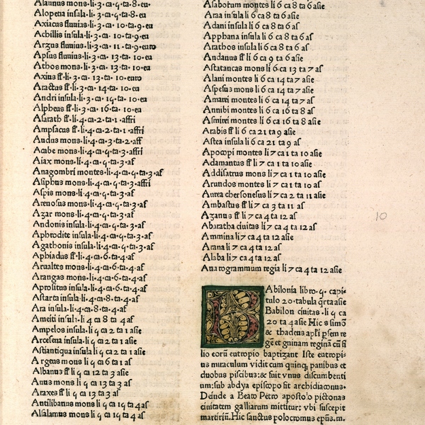 - Ex-libris ms. del Colegio Imperial de la Compañía de Jesús de Madrid. Ingresó en la Biblioteca Histórica procedente de la Facultad de Filología en 2000. Falta la última hoja, sustituida por copia ms. Se inicia con “Registrum alphabeticum super octo libro a Ptolomei incipit feliciter” cuyas primeras cuatro hojas restauradas, presentan pérdida de texto. A continuación el texto de Ptolomeo con 32 mapas. Los cinco mapas modernos aparecen intercalados entre los 26 de Ptolomeo, a continuación del correspondiente al que moderniza: en Europa: Tabula Moderna Hispanie, entre 2 y 3, Tabula Moderna Francie, entre 3 y 4, Tabula Moderna Italie, entre 6 y 7, y Tabula Moderna Prussie, Livonie, Norbegie et Gotcie, entre 8 y 9; en Asia Tabula Moderna Terre Sancte, entre 4 y 5. Al final incluye “De locis ac mirabilibus mundi” (signaturas a-b8, c10), con la particularidad de que el último cuadernillo de esta serie c-10 está intercalado entre los B-8 y C-8 del “Registrum alphabeticum super octo libro a Ptolomei incipit feliciter”. Los grabados xilográficos (mapas e iniciales) están coloreados a mano. Encuadernación de piel vuelta. Cortes dorados y cincelados, con restos de dos iniciales y un escudo en colores.