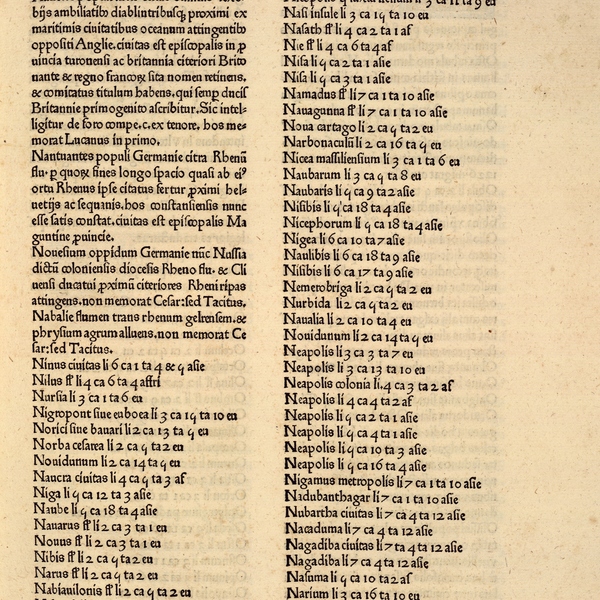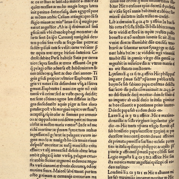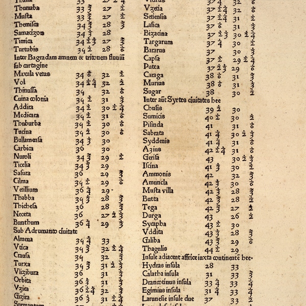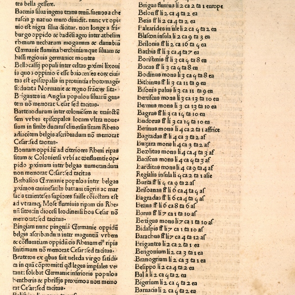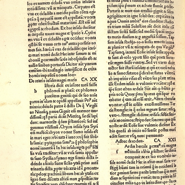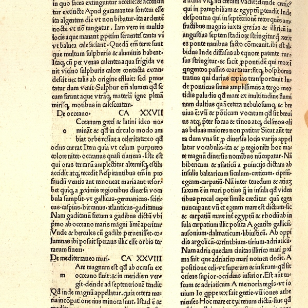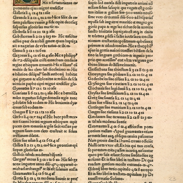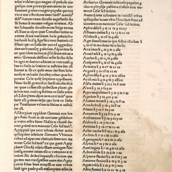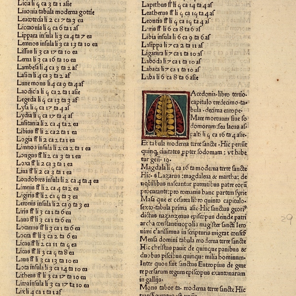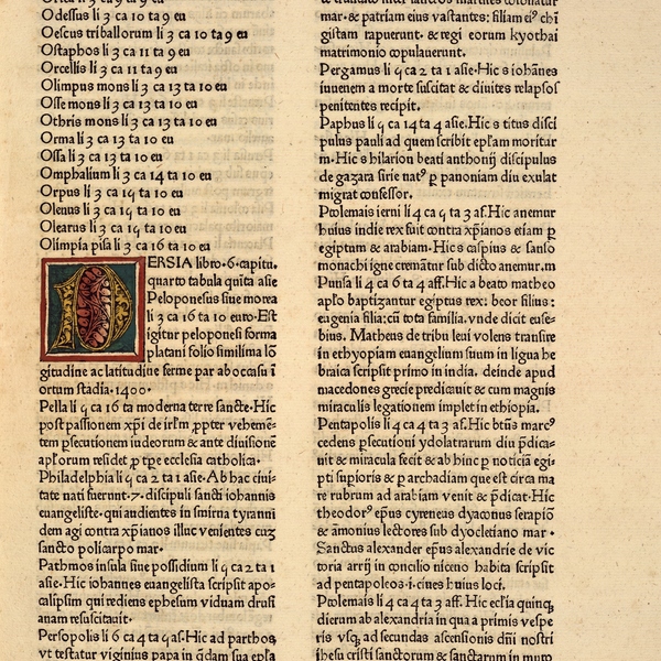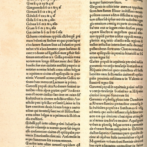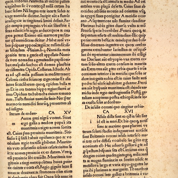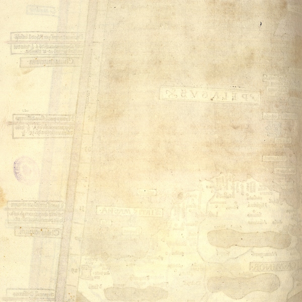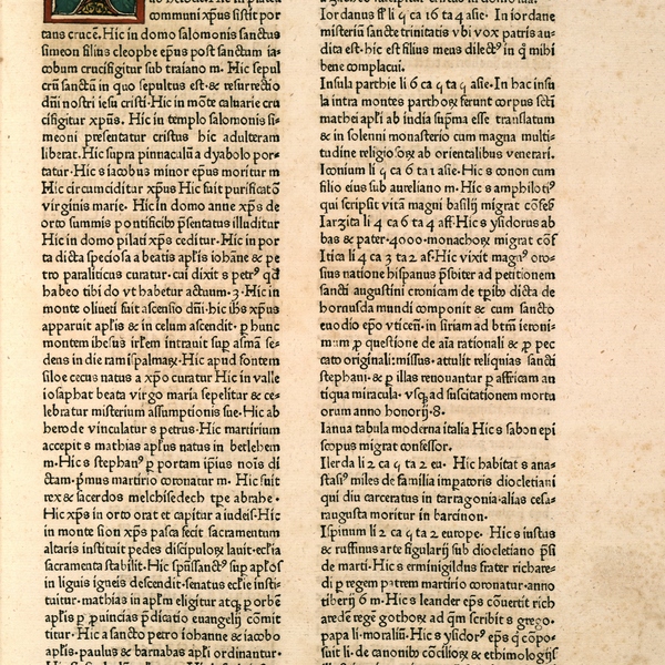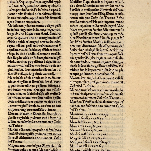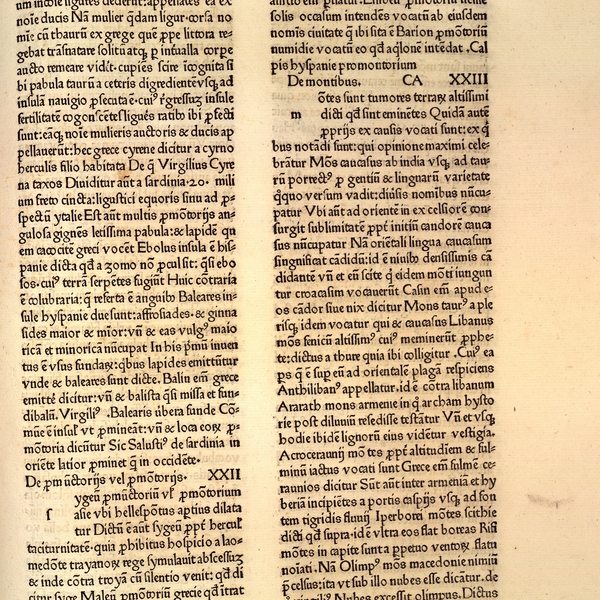 - Ex-libris ms. del Colegio Imperial de la Compañía de Jesús de Madrid. Ingresó en la Biblioteca Histórica procedente de la Facultad de Filología en 2000. Falta la última hoja, sustituida por copia ms. Se inicia con “Registrum alphabeticum super octo libro a Ptolomei incipit feliciter” cuyas primeras cuatro hojas restauradas, presentan pérdida de texto. A continuación el texto de Ptolomeo con 32 mapas. Los cinco mapas modernos aparecen intercalados entre los 26 de Ptolomeo, a continuación del correspondiente al que moderniza: en Europa: Tabula Moderna Hispanie, entre 2 y 3, Tabula Moderna Francie, entre 3 y 4, Tabula Moderna Italie, entre 6 y 7, y Tabula Moderna Prussie, Livonie, Norbegie et Gotcie, entre 8 y 9; en Asia Tabula Moderna Terre Sancte, entre 4 y 5. Al final incluye “De locis ac mirabilibus mundi” (signaturas a-b8, c10), con la particularidad de que el último cuadernillo de esta serie c-10 está intercalado entre los B-8 y C-8 del “Registrum alphabeticum super octo libro a Ptolomei incipit feliciter”. Los grabados xilográficos (mapas e iniciales) están coloreados a mano. Encuadernación de piel vuelta. Cortes dorados y cincelados, con restos de dos iniciales y un escudo en colores.