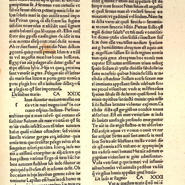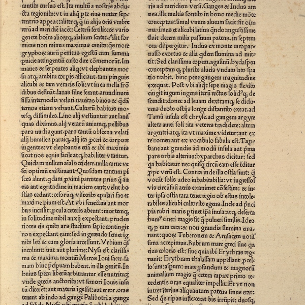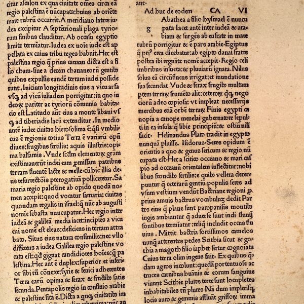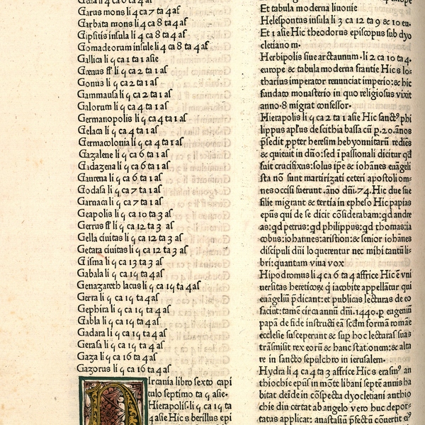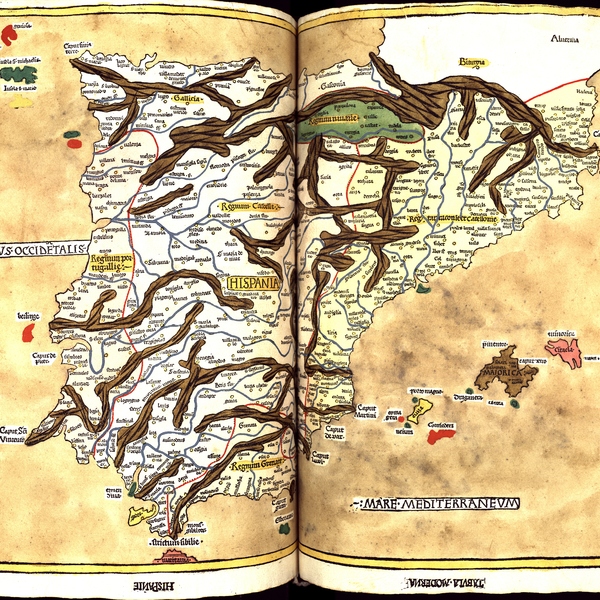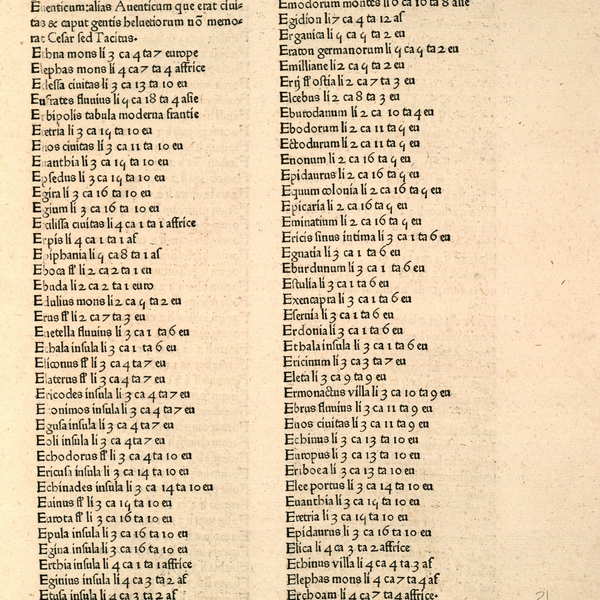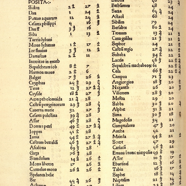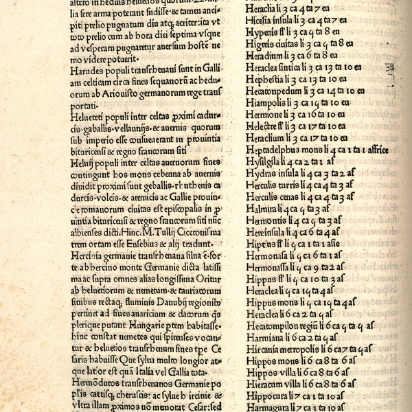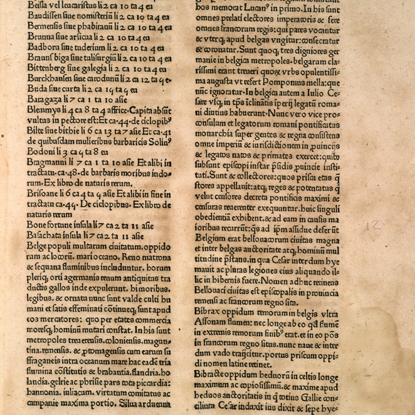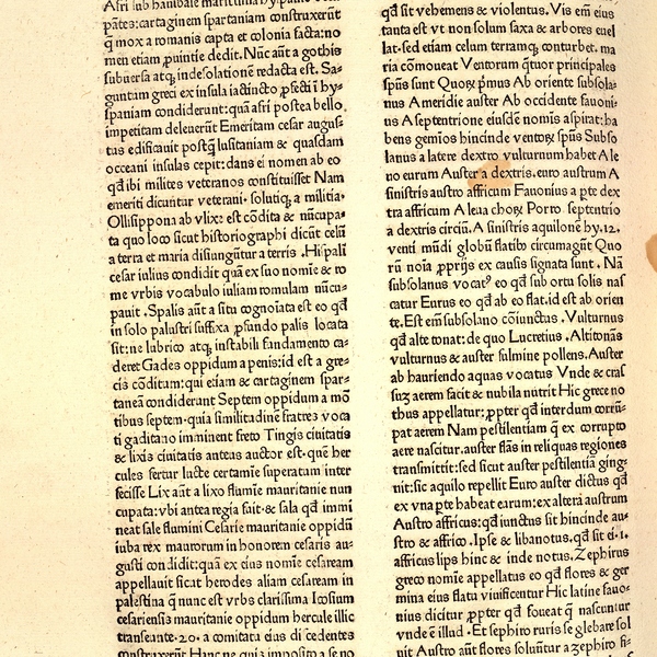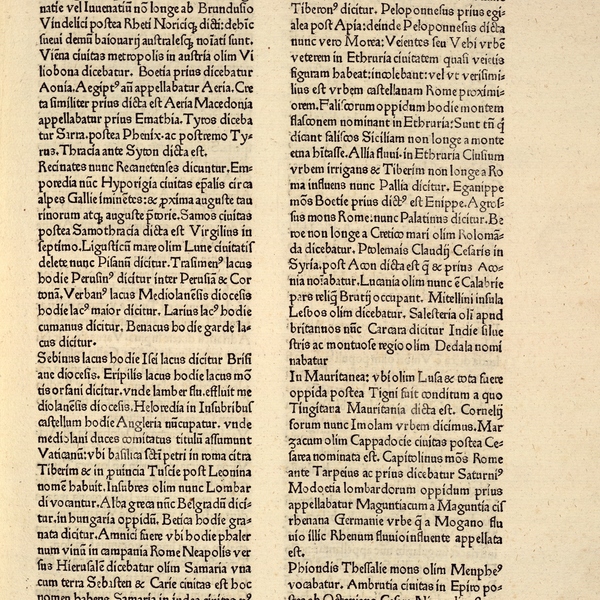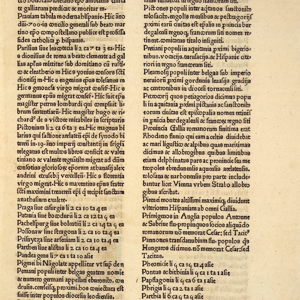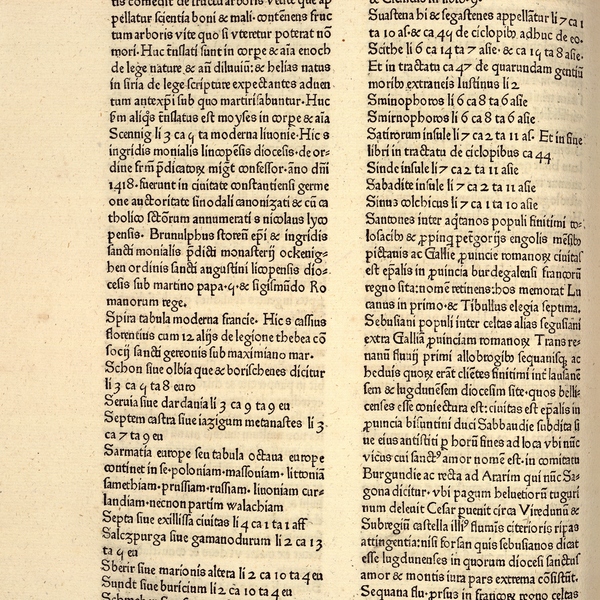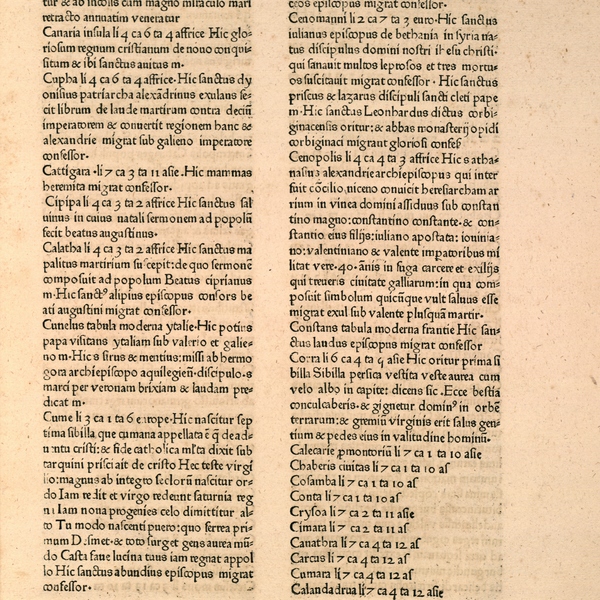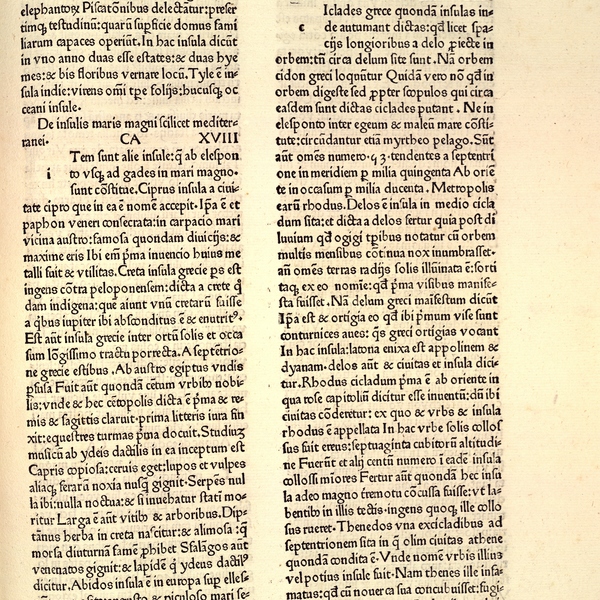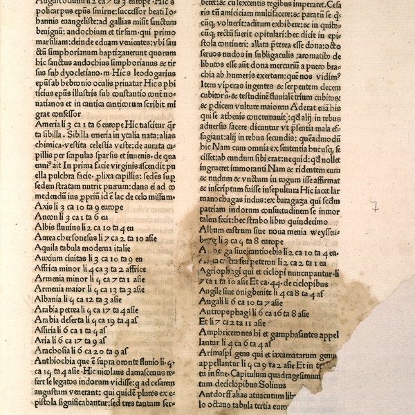- Ex-libris ms. del Colegio Imperial de la Compañía de Jesús de Madrid. Ingresó en la Biblioteca Histórica procedente de la Facultad de Filología en 2000. Falta la última hoja, sustituida por copia ms. Se inicia con “Registrum alphabeticum super octo libro a Ptolomei incipit feliciter” cuyas primeras cuatro hojas restauradas, presentan pérdida de texto. A continuación el texto de Ptolomeo con 32 mapas. Los cinco mapas modernos aparecen intercalados entre los 26 de Ptolomeo, a continuación del correspondiente al que moderniza: en Europa: Tabula Moderna Hispanie, entre 2 y 3, Tabula Moderna Francie, entre 3 y 4, Tabula Moderna Italie, entre 6 y 7, y Tabula Moderna Prussie, Livonie, Norbegie et Gotcie, entre 8 y 9; en Asia Tabula Moderna Terre Sancte, entre 4 y 5. Al final incluye “De locis ac mirabilibus mundi” (signaturas a-b8, c10), con la particularidad de que el último cuadernillo de esta serie c-10 está intercalado entre los B-8 y C-8 del “Registrum alphabeticum super octo libro a Ptolomei incipit feliciter”. Los grabados xilográficos (mapas e iniciales) están coloreados a mano. Encuadernación de piel vuelta. Cortes dorados y cincelados, con restos de dos iniciales y un escudo en colores.