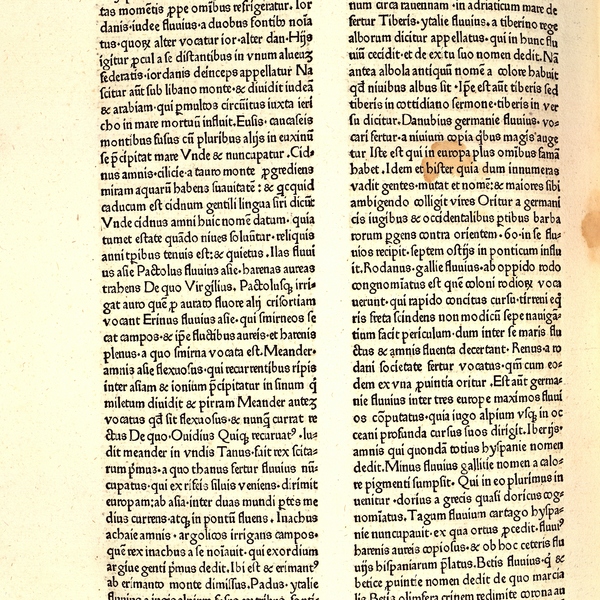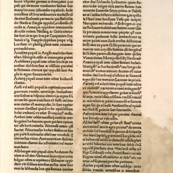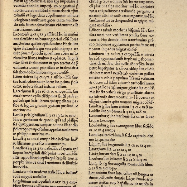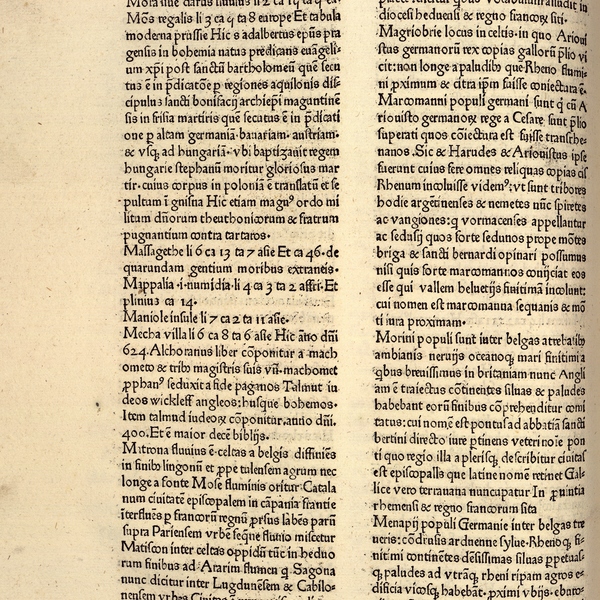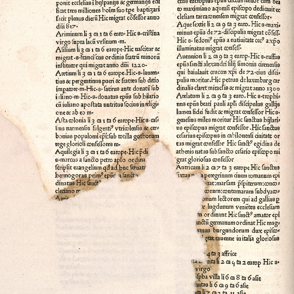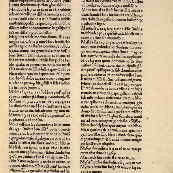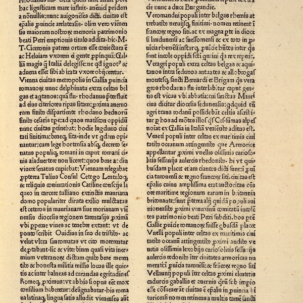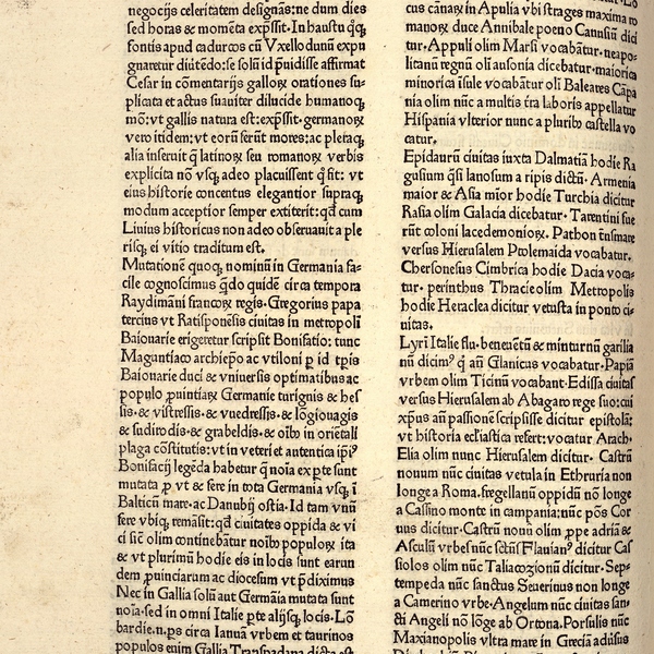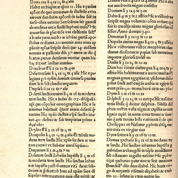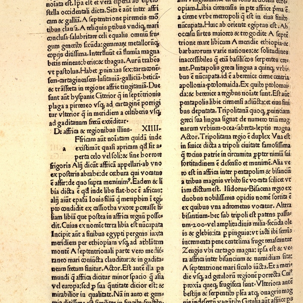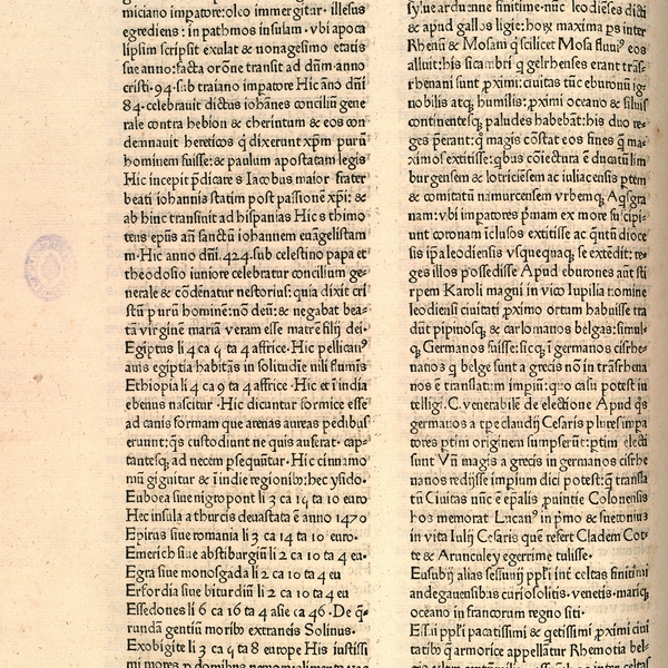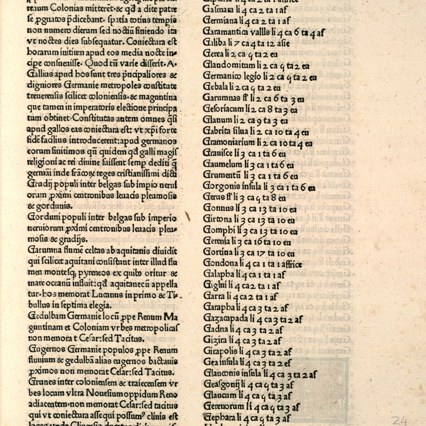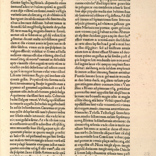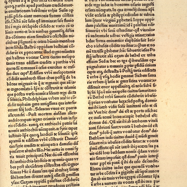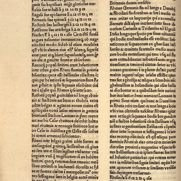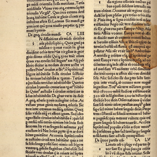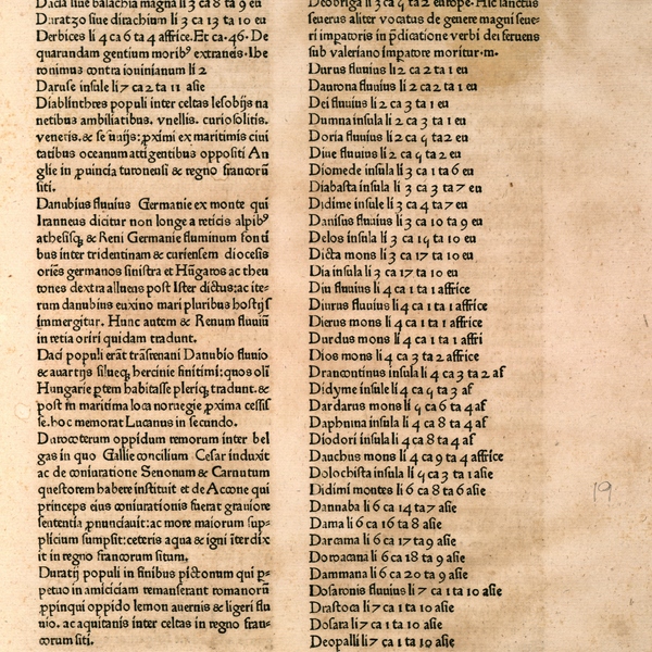 - Ex-libris ms. del Colegio Imperial de la Compañía de Jesús de Madrid. Ingresó en la Biblioteca Histórica procedente de la Facultad de Filología en 2000. Falta la última hoja, sustituida por copia ms. Se inicia con “Registrum alphabeticum super octo libro a Ptolomei incipit feliciter” cuyas primeras cuatro hojas restauradas, presentan pérdida de texto. A continuación el texto de Ptolomeo con 32 mapas. Los cinco mapas modernos aparecen intercalados entre los 26 de Ptolomeo, a continuación del correspondiente al que moderniza: en Europa: Tabula Moderna Hispanie, entre 2 y 3, Tabula Moderna Francie, entre 3 y 4, Tabula Moderna Italie, entre 6 y 7, y Tabula Moderna Prussie, Livonie, Norbegie et Gotcie, entre 8 y 9; en Asia Tabula Moderna Terre Sancte, entre 4 y 5. Al final incluye “De locis ac mirabilibus mundi” (signaturas a-b8, c10), con la particularidad de que el último cuadernillo de esta serie c-10 está intercalado entre los B-8 y C-8 del “Registrum alphabeticum super octo libro a Ptolomei incipit feliciter”. Los grabados xilográficos (mapas e iniciales) están coloreados a mano. Encuadernación de piel vuelta. Cortes dorados y cincelados, con restos de dos iniciales y un escudo en colores.