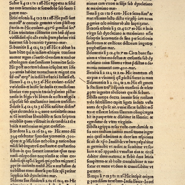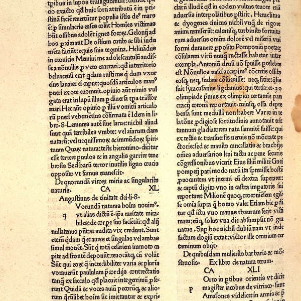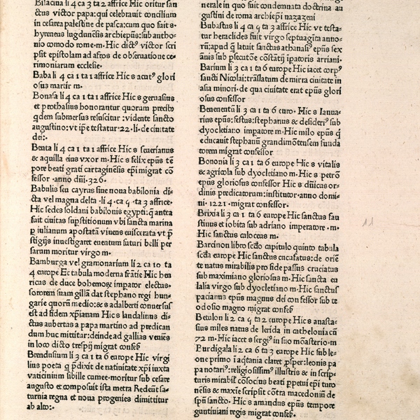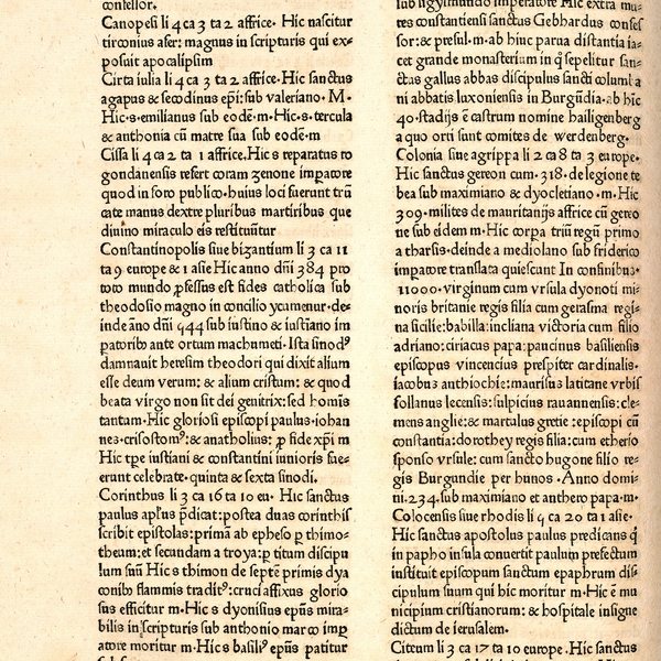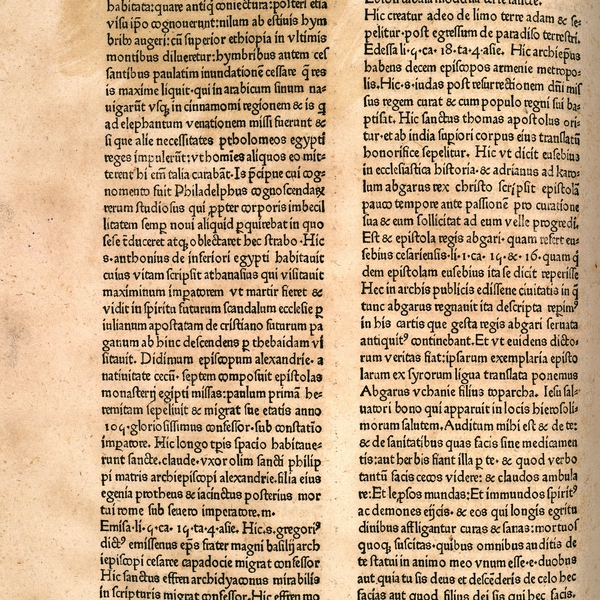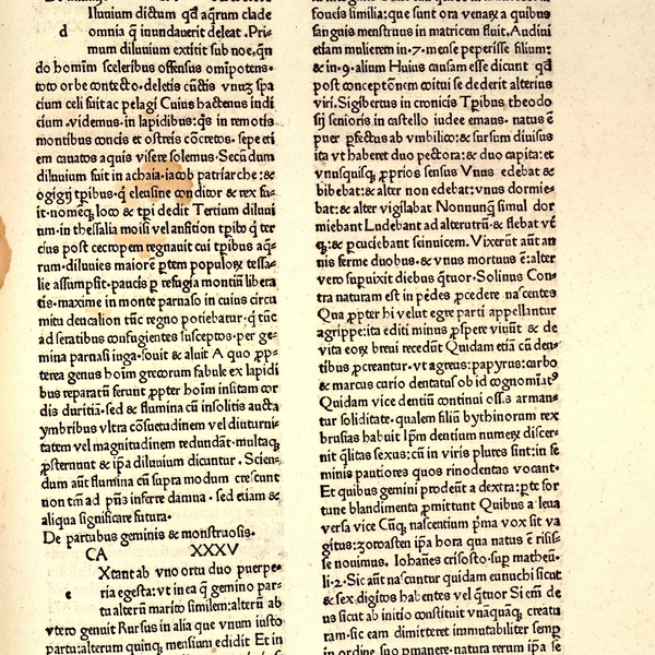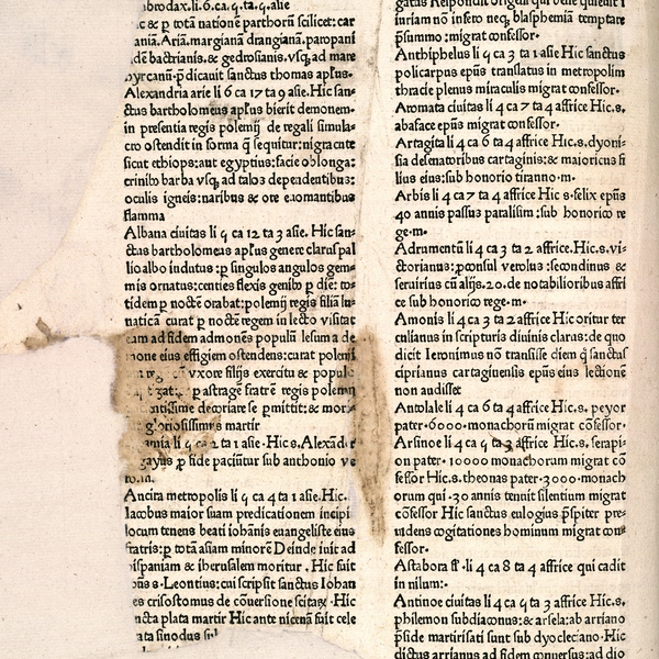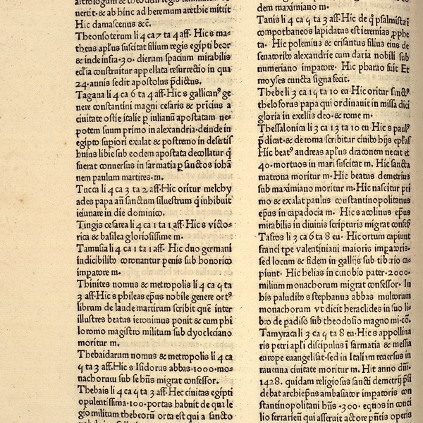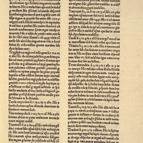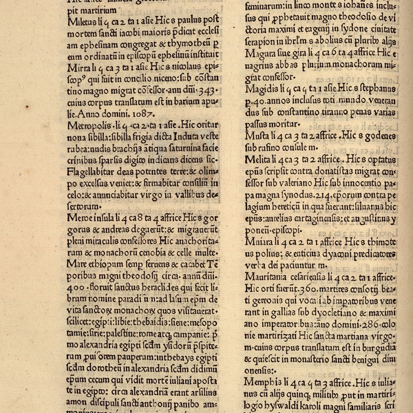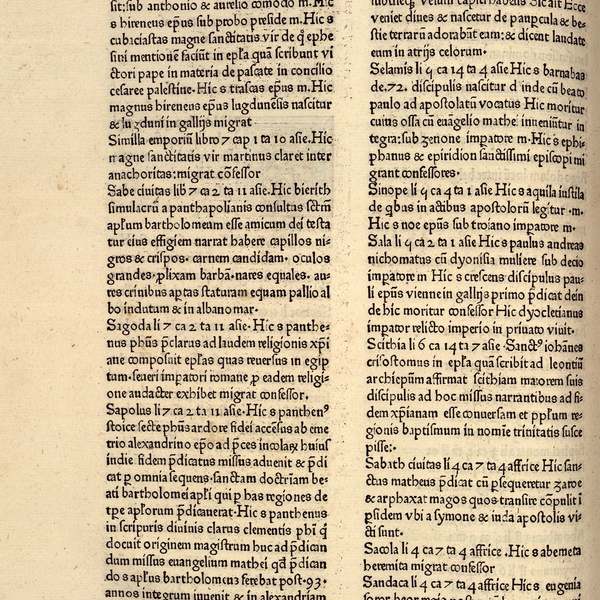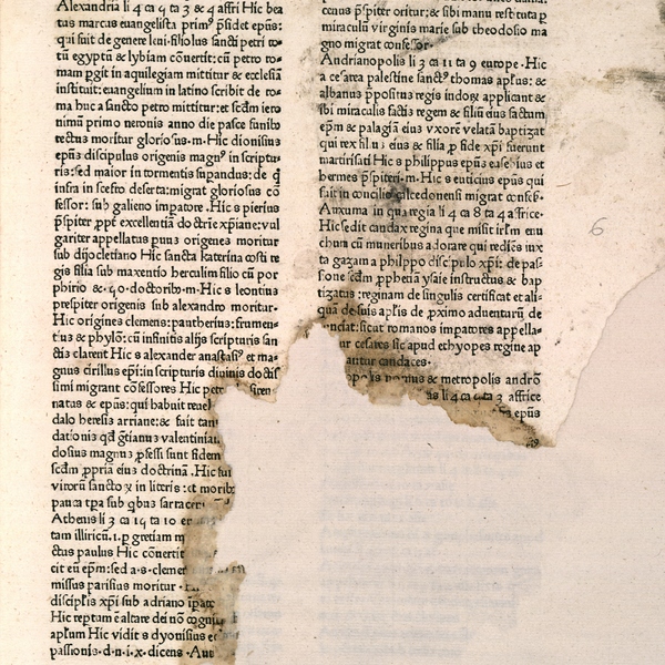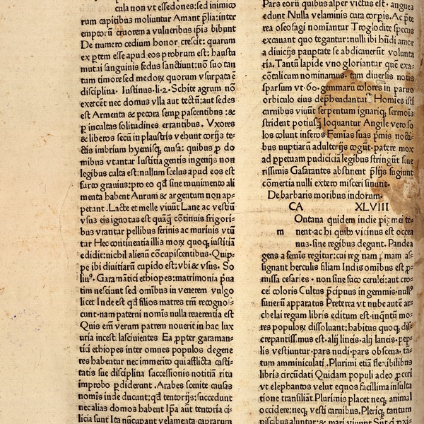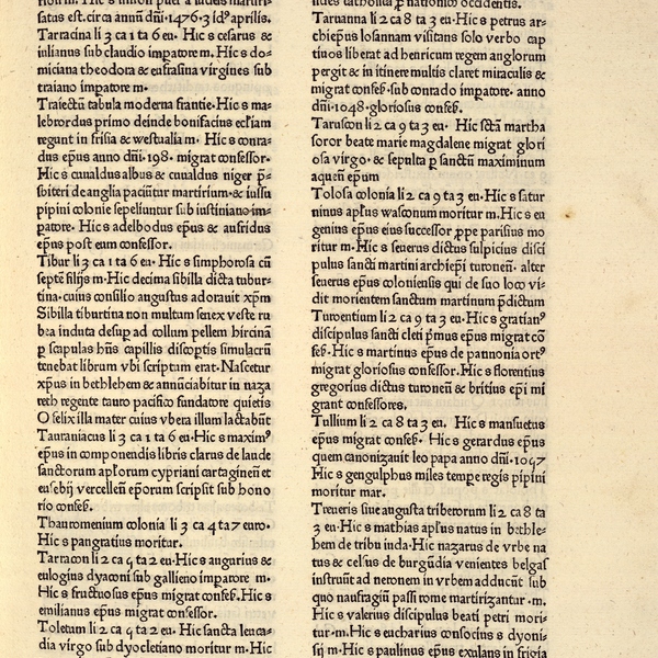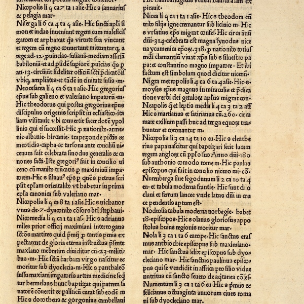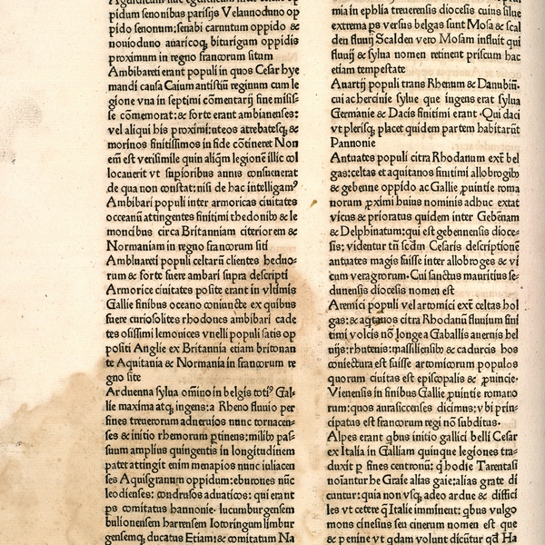 - Ex-libris ms. del Colegio Imperial de la Compañía de Jesús de Madrid. Ingresó en la Biblioteca Histórica procedente de la Facultad de Filología en 2000. Falta la última hoja, sustituida por copia ms. Se inicia con “Registrum alphabeticum super octo libro a Ptolomei incipit feliciter” cuyas primeras cuatro hojas restauradas, presentan pérdida de texto. A continuación el texto de Ptolomeo con 32 mapas. Los cinco mapas modernos aparecen intercalados entre los 26 de Ptolomeo, a continuación del correspondiente al que moderniza: en Europa: Tabula Moderna Hispanie, entre 2 y 3, Tabula Moderna Francie, entre 3 y 4, Tabula Moderna Italie, entre 6 y 7, y Tabula Moderna Prussie, Livonie, Norbegie et Gotcie, entre 8 y 9; en Asia Tabula Moderna Terre Sancte, entre 4 y 5. Al final incluye “De locis ac mirabilibus mundi” (signaturas a-b8, c10), con la particularidad de que el último cuadernillo de esta serie c-10 está intercalado entre los B-8 y C-8 del “Registrum alphabeticum super octo libro a Ptolomei incipit feliciter”. Los grabados xilográficos (mapas e iniciales) están coloreados a mano. Encuadernación de piel vuelta. Cortes dorados y cincelados, con restos de dos iniciales y un escudo en colores.