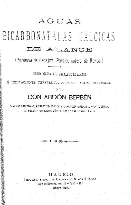 Parte de Aguas bicarbonatadas cálcicas de Alange (Provincia de Badajoz, partido judicial de Mérida) : ligera reseña del balneario de Alange é indicaciones terapéuticas de sus aguas minerales ‐ [Ejemp. 1]