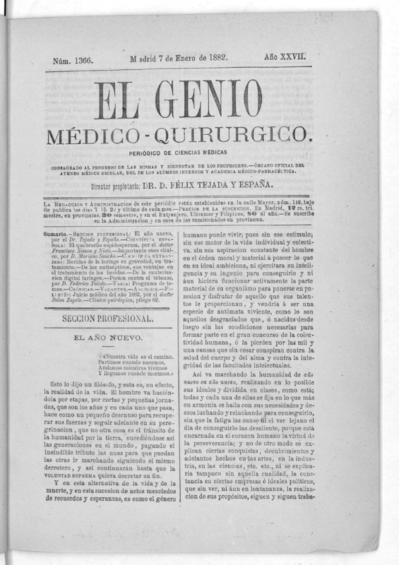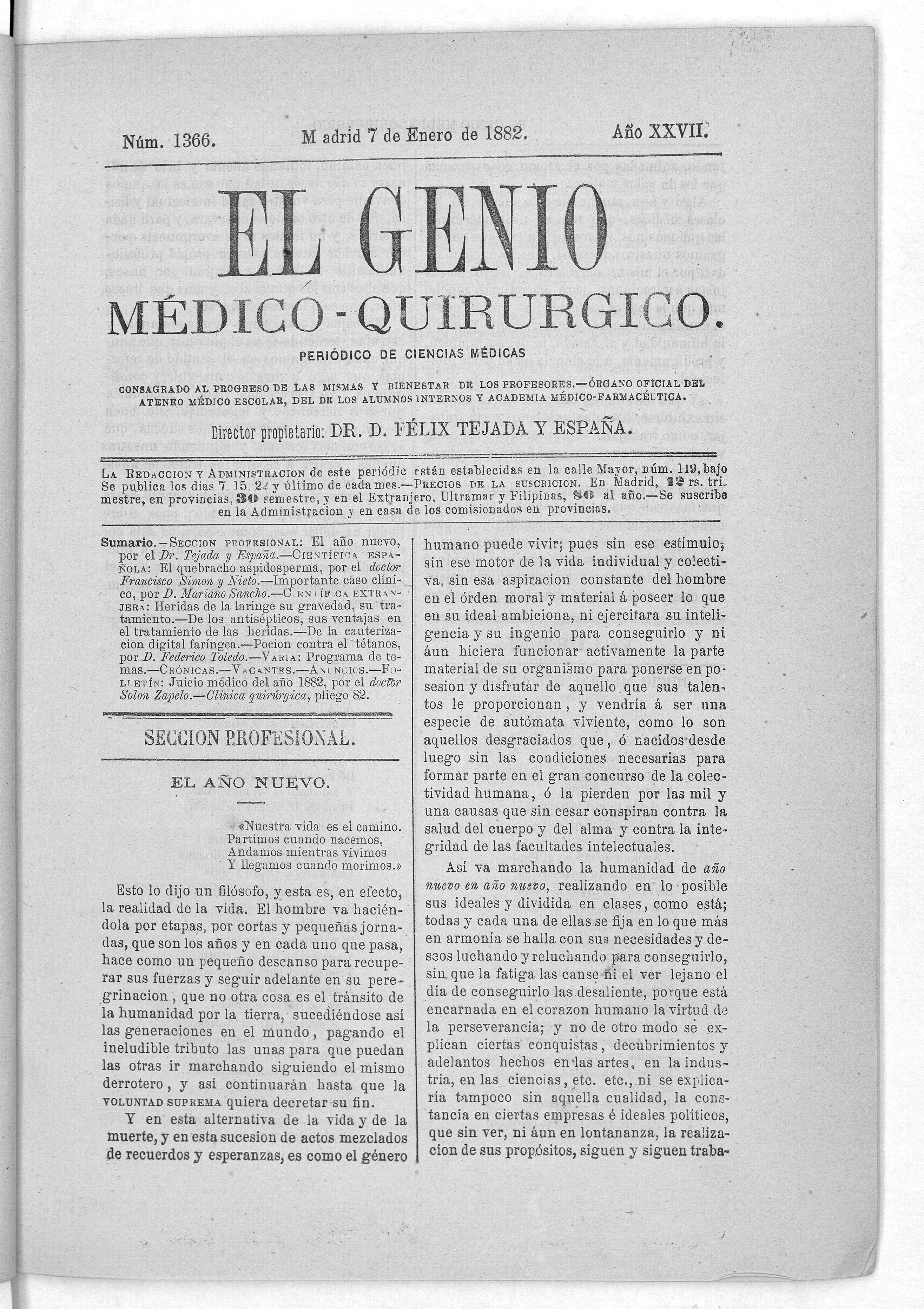 Parte de El Genio médico-quirúrgico : periódico de ciencias médicas ‐ [1882, Vol. 28, n. 1366-1393, 1340-1359.]