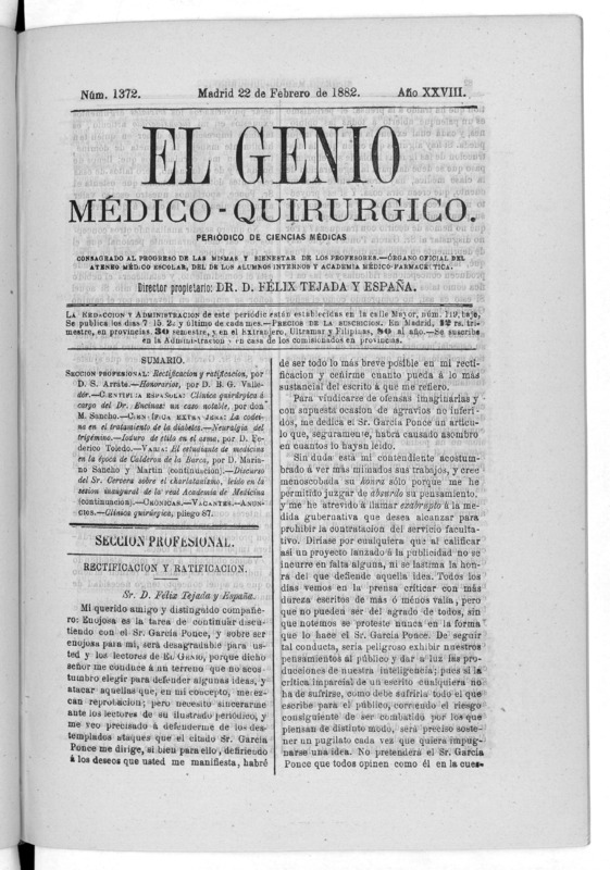 Parte de El Genio médico-quirúrgico : periódico de ciencias médicas ‐ [1882, Vol. 28, n. 1366-1393, 1340-1359.]