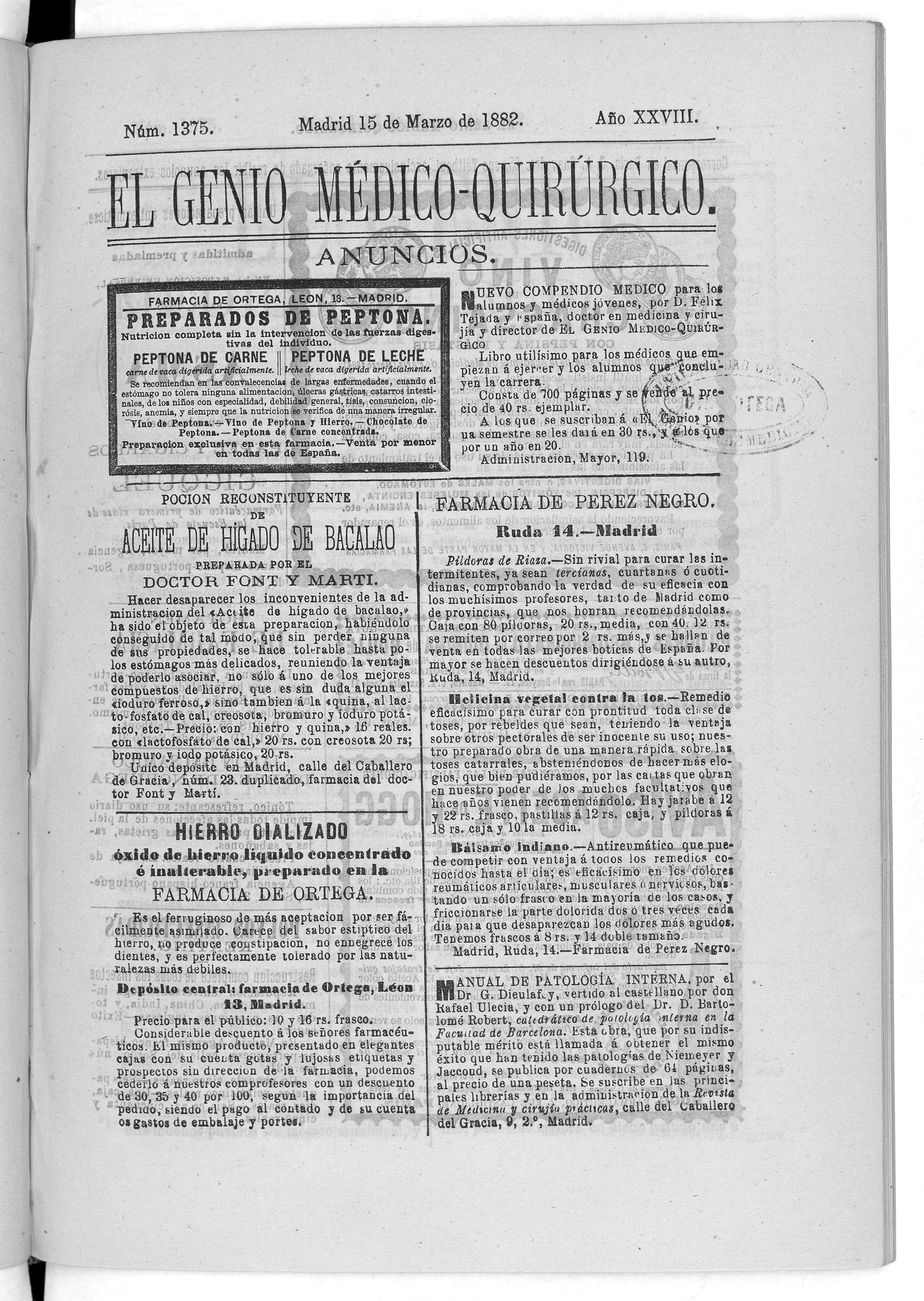Parte de El Genio médico-quirúrgico : periódico de ciencias médicas ‐ [1882, Vol. 28, n. 1366-1393, 1340-1359.]