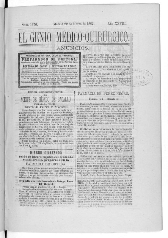 Parte de El Genio médico-quirúrgico : periódico de ciencias médicas ‐ [1882, Vol. 28, n. 1366-1393, 1340-1359.]