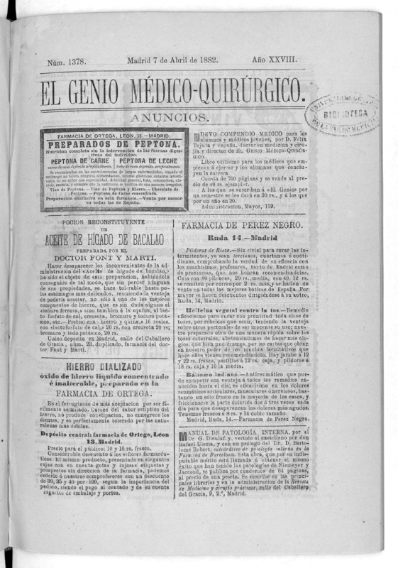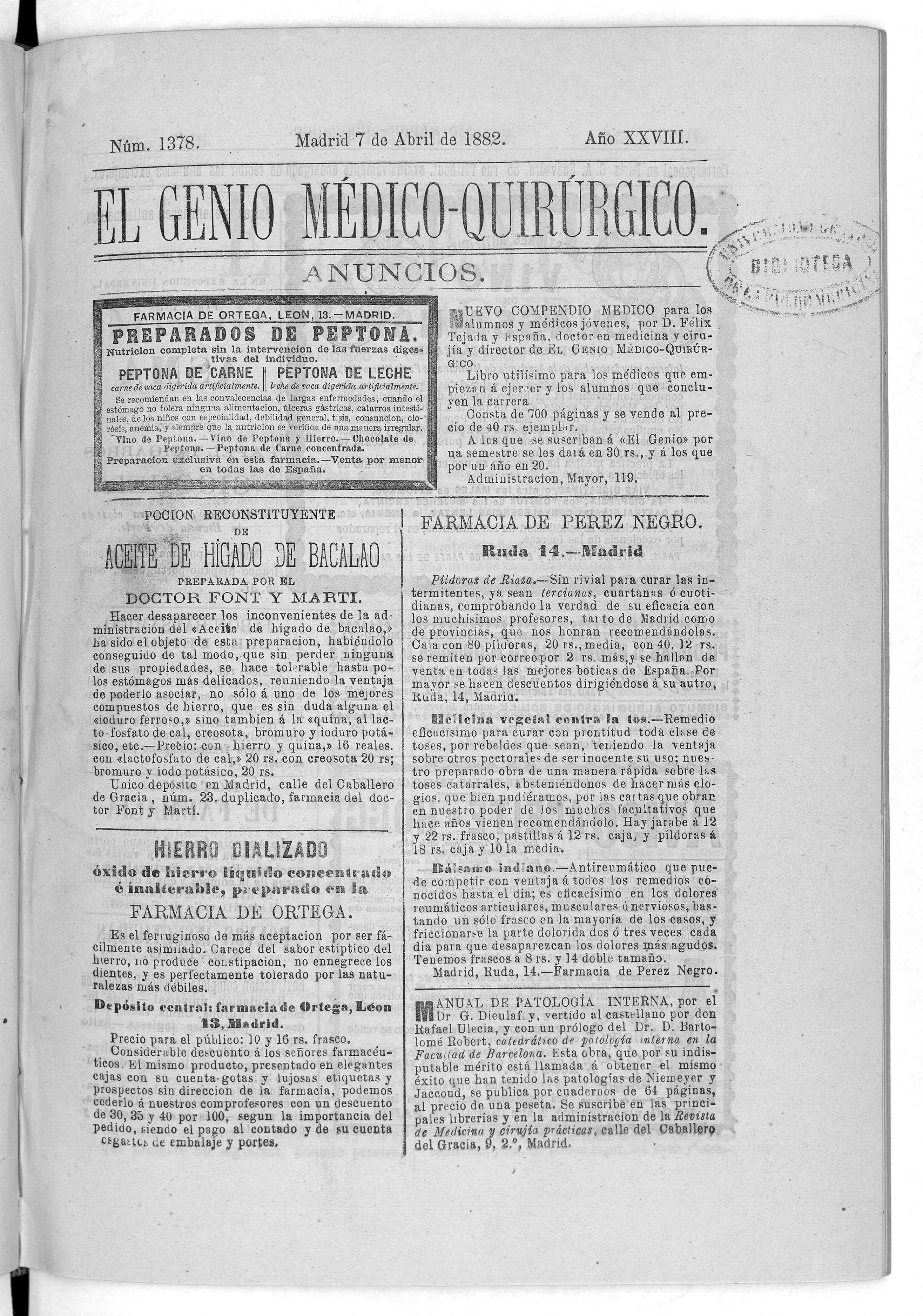Parte de El Genio médico-quirúrgico : periódico de ciencias médicas ‐ [1882, Vol. 28, n. 1366-1393, 1340-1359.]