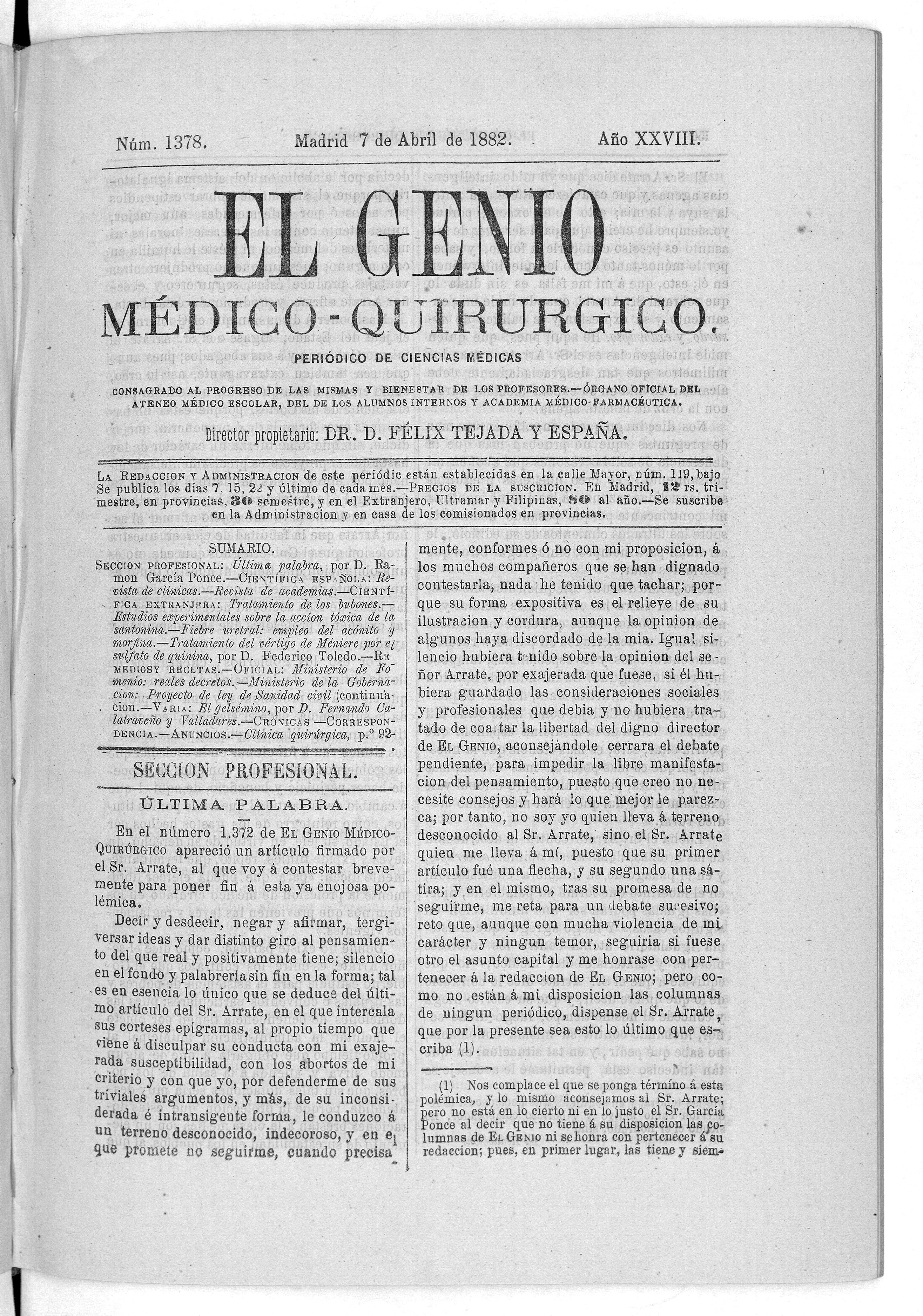 Parte de El Genio médico-quirúrgico : periódico de ciencias médicas ‐ [1882, Vol. 28, n. 1366-1393, 1340-1359.]