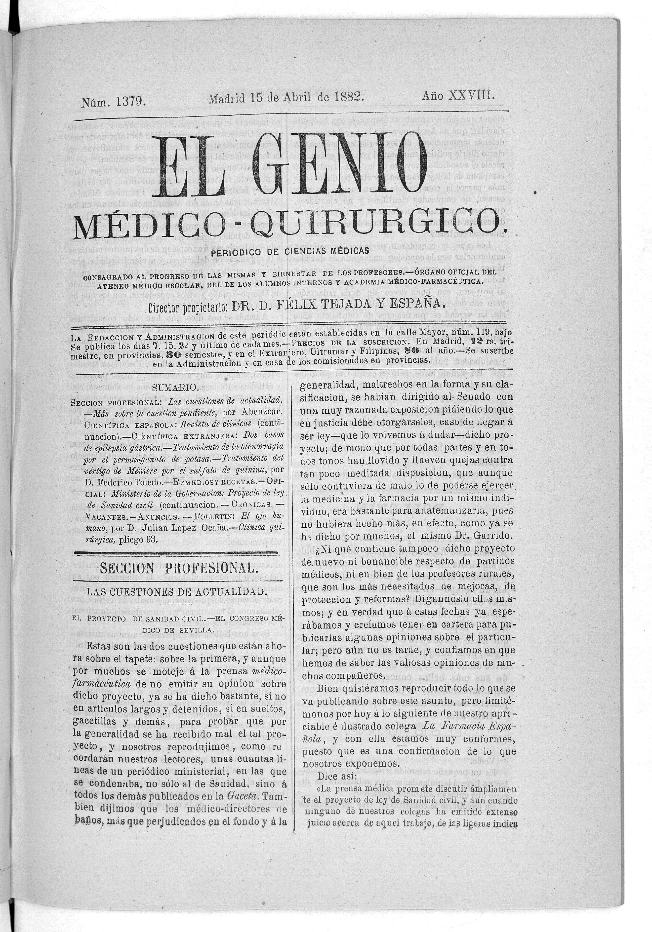 Parte de El Genio médico-quirúrgico : periódico de ciencias médicas ‐ [1882, Vol. 28, n. 1366-1393, 1340-1359.]