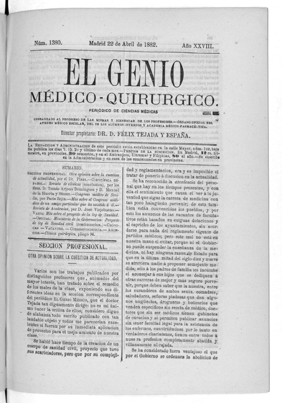 Parte de El Genio médico-quirúrgico : periódico de ciencias médicas ‐ [1882, Vol. 28, n. 1366-1393, 1340-1359.]