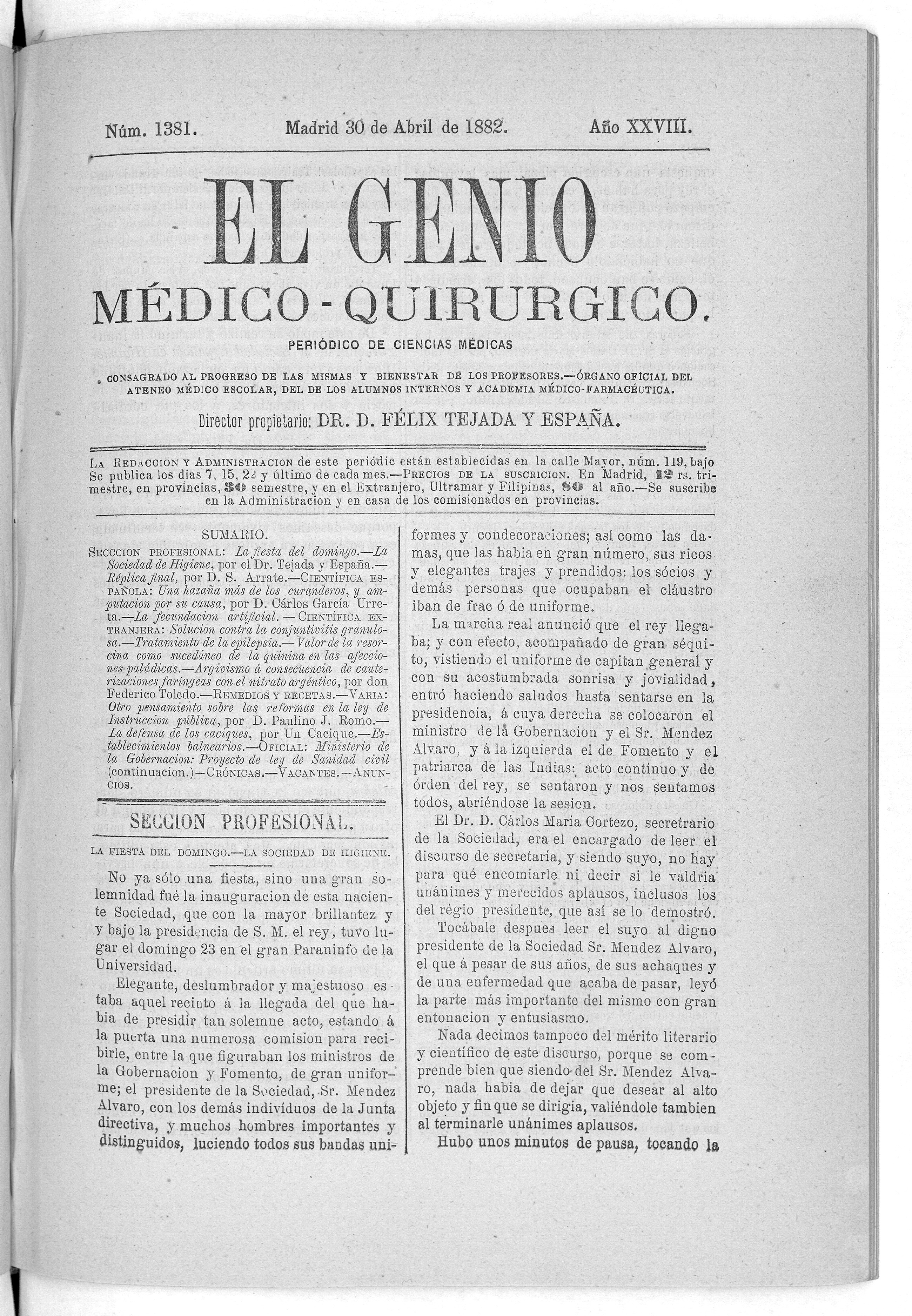 Parte de El Genio médico-quirúrgico : periódico de ciencias médicas ‐ [1882, Vol. 28, n. 1366-1393, 1340-1359.]