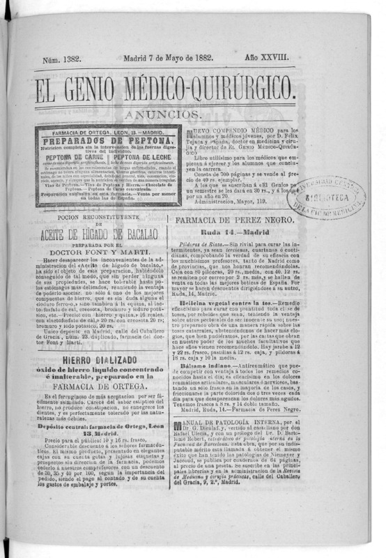Parte de El Genio médico-quirúrgico : periódico de ciencias médicas ‐ [1882, Vol. 28, n. 1366-1393, 1340-1359.]