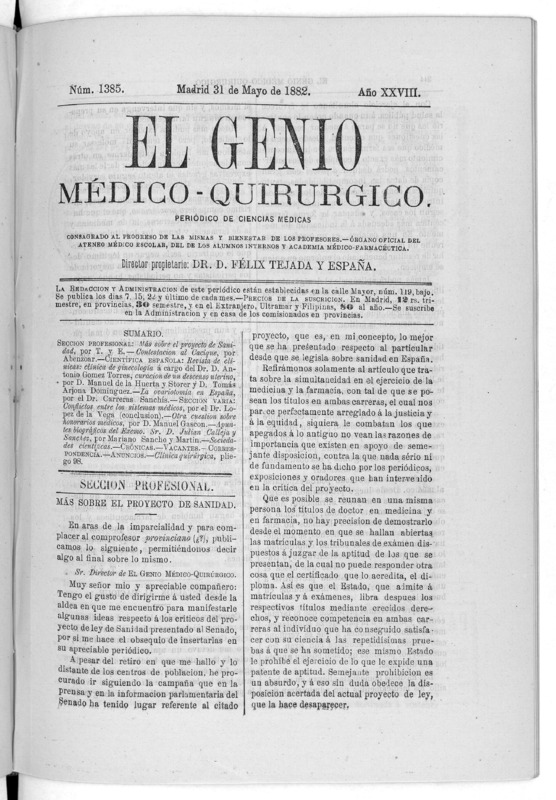 Parte de El Genio médico-quirúrgico : periódico de ciencias médicas ‐ [1882, Vol. 28, n. 1366-1393, 1340-1359.]