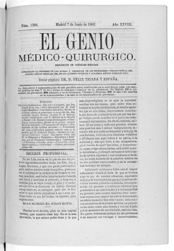 Parte de El Genio médico-quirúrgico : periódico de ciencias médicas ‐ [1882, Vol. 28, n. 1366-1393, 1340-1359.]