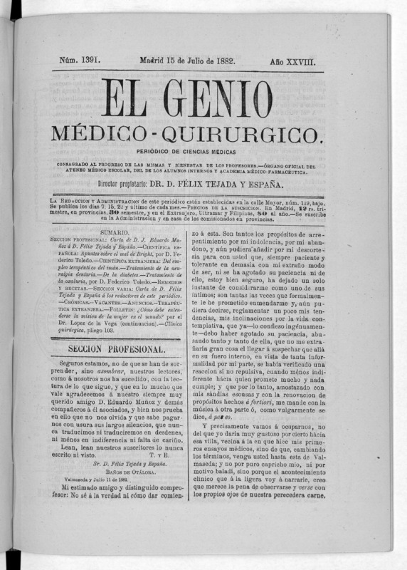 Parte de El Genio médico-quirúrgico : periódico de ciencias médicas ‐ [1882, Vol. 28, n. 1366-1393, 1340-1359.]