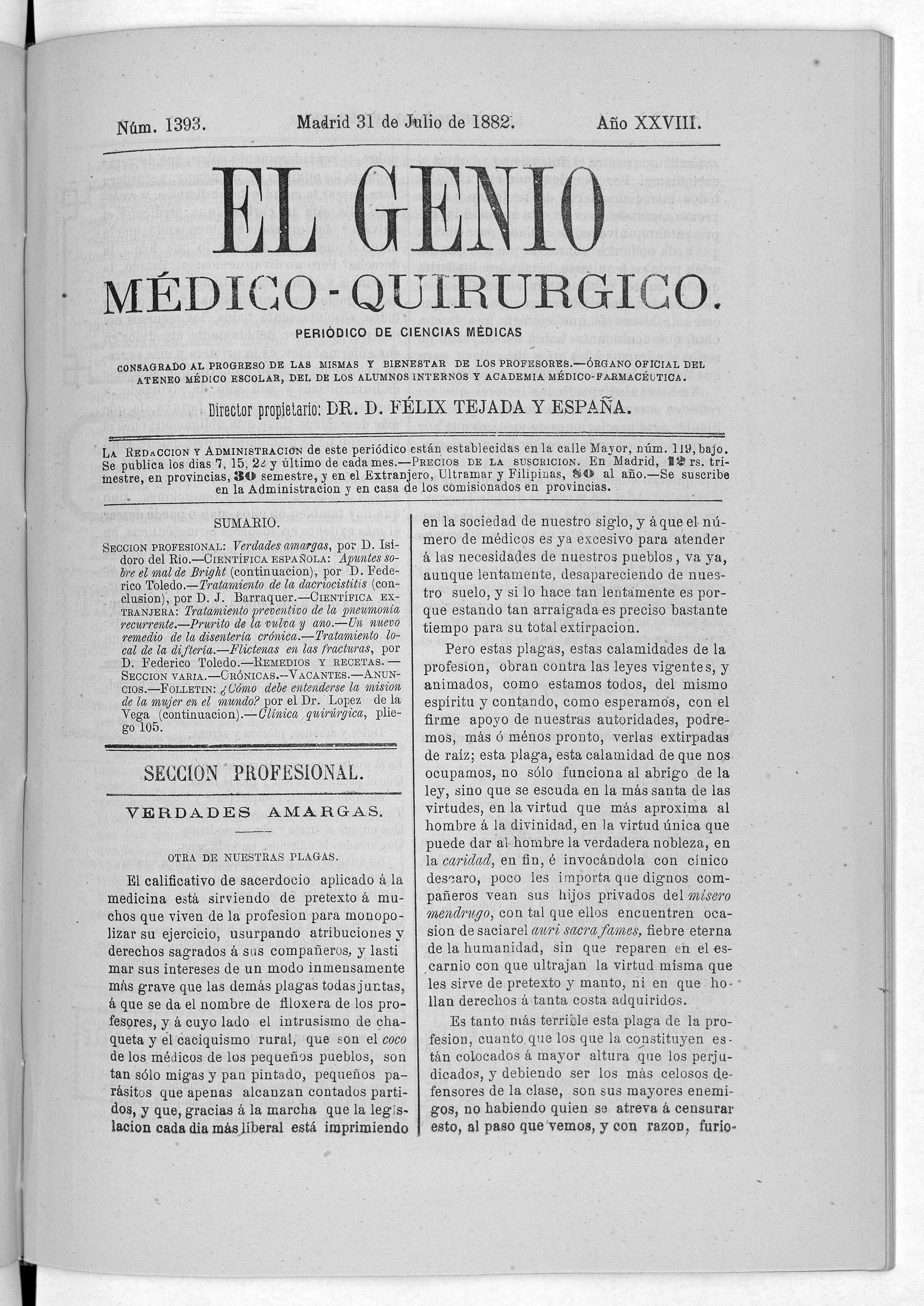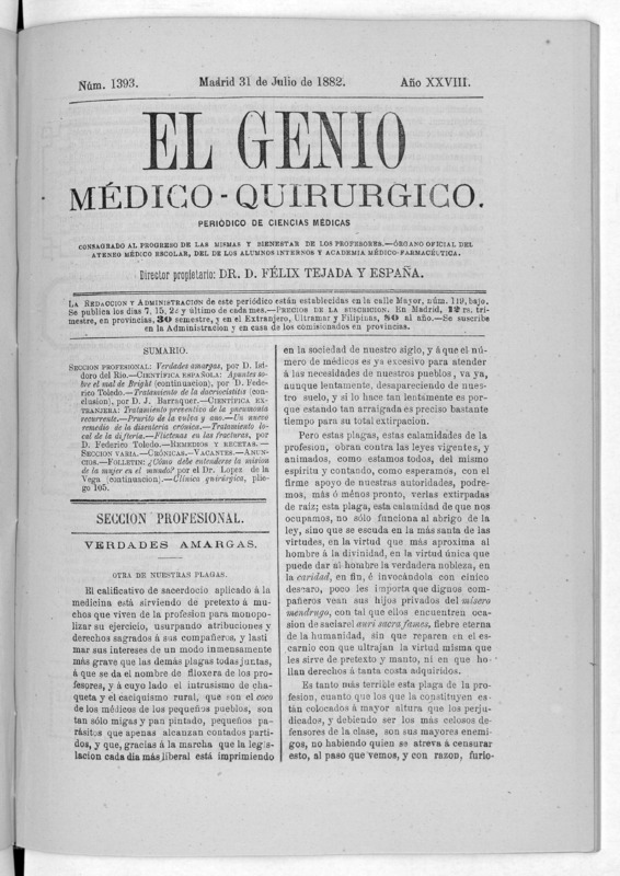 Parte de El Genio médico-quirúrgico : periódico de ciencias médicas ‐ [1882, Vol. 28, n. 1366-1393, 1340-1359.]