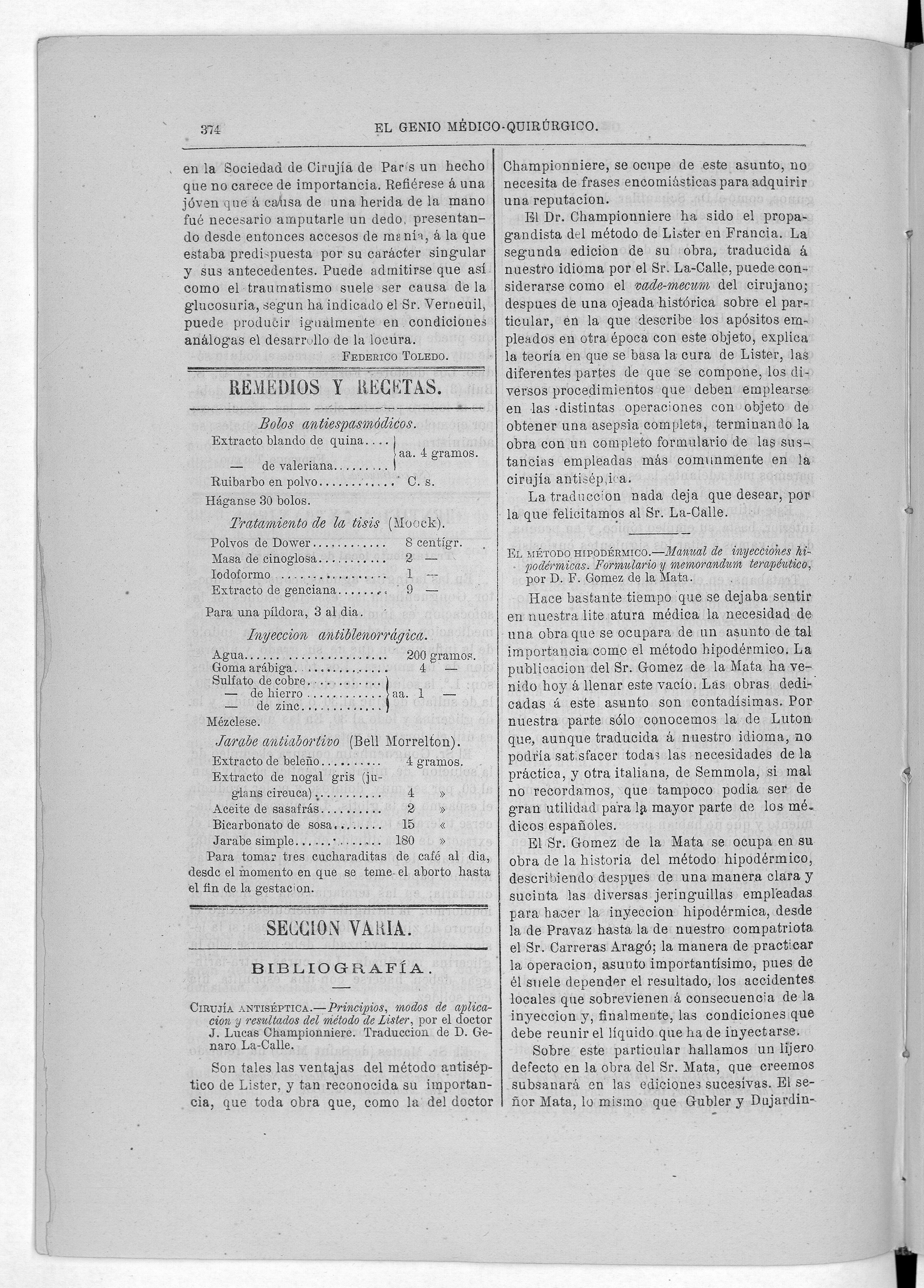 Parte de El Genio médico-quirúrgico : periódico de ciencias médicas ‐ [1882, Vol. 28, n. 1366-1393, 1340-1359.]