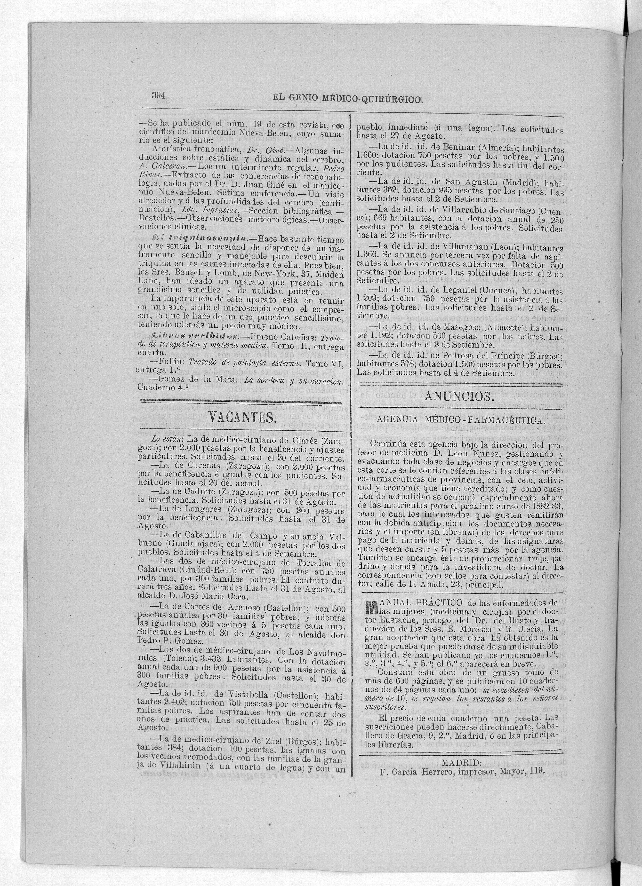 Parte de El Genio médico-quirúrgico : periódico de ciencias médicas ‐ [1882, Vol. 28, n. 1366-1393, 1340-1359.]