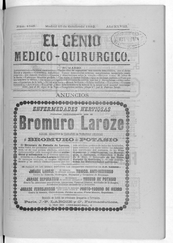 Parte de El Genio médico-quirúrgico : periódico de ciencias médicas ‐ [1882, Vol. 28, n. 1366-1393, 1340-1359.]