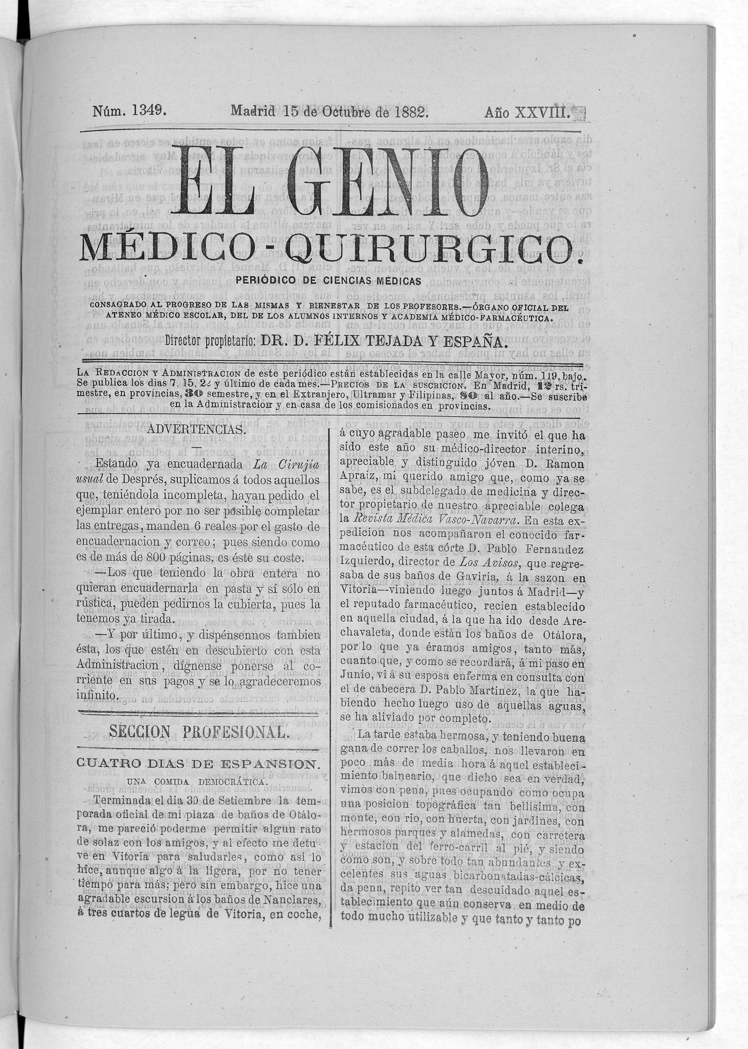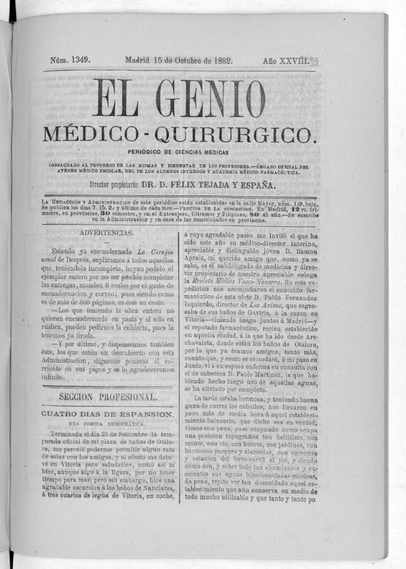 Parte de El Genio médico-quirúrgico : periódico de ciencias médicas ‐ [1882, Vol. 28, n. 1366-1393, 1340-1359.]