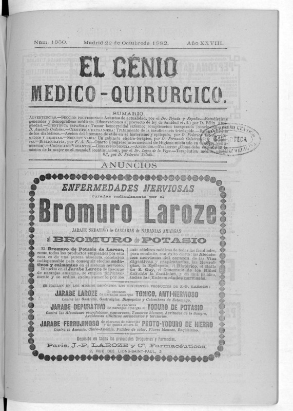 Parte de El Genio médico-quirúrgico : periódico de ciencias médicas ‐ [1882, Vol. 28, n. 1366-1393, 1340-1359.]