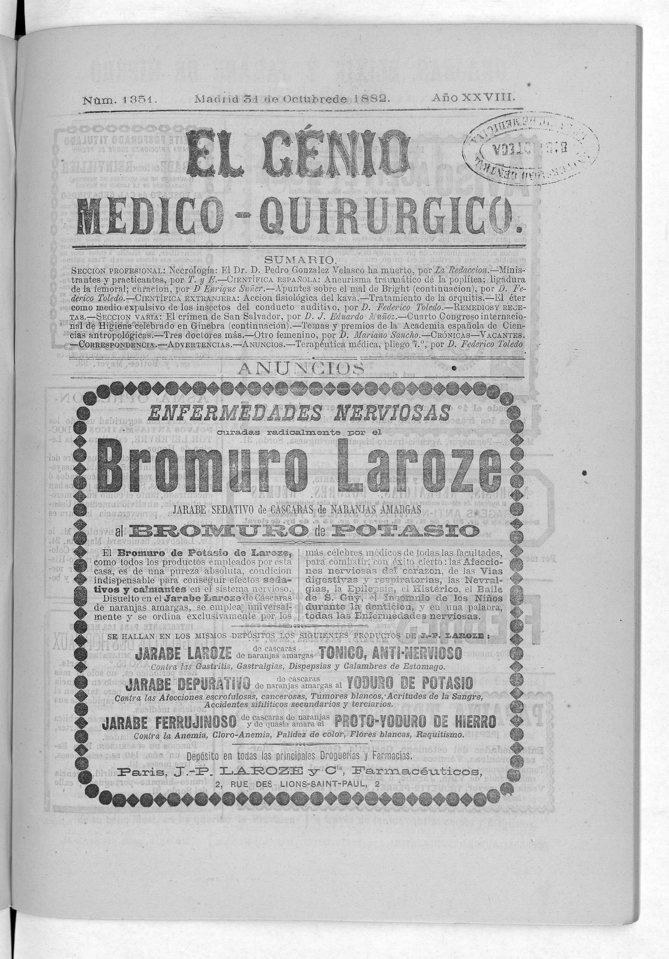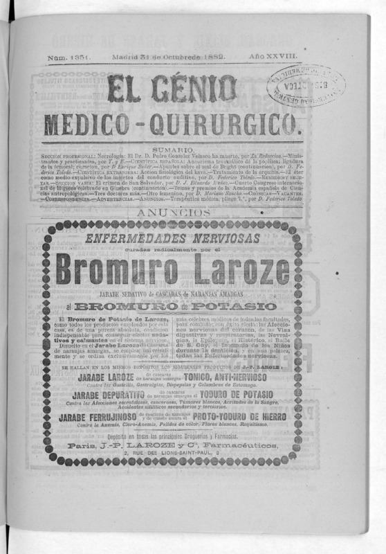Parte de El Genio médico-quirúrgico : periódico de ciencias médicas ‐ [1882, Vol. 28, n. 1366-1393, 1340-1359.]
