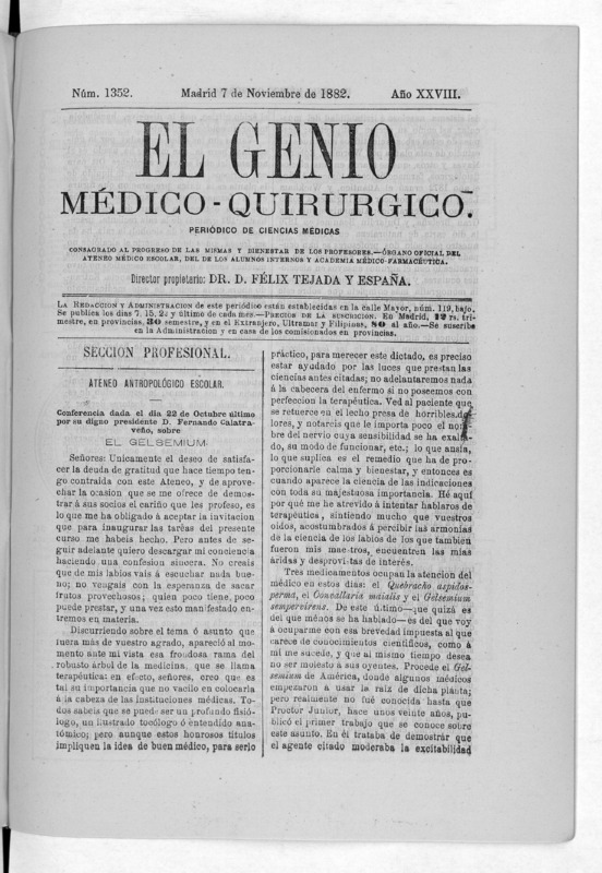 Parte de El Genio médico-quirúrgico : periódico de ciencias médicas ‐ [1882, Vol. 28, n. 1366-1393, 1340-1359.]