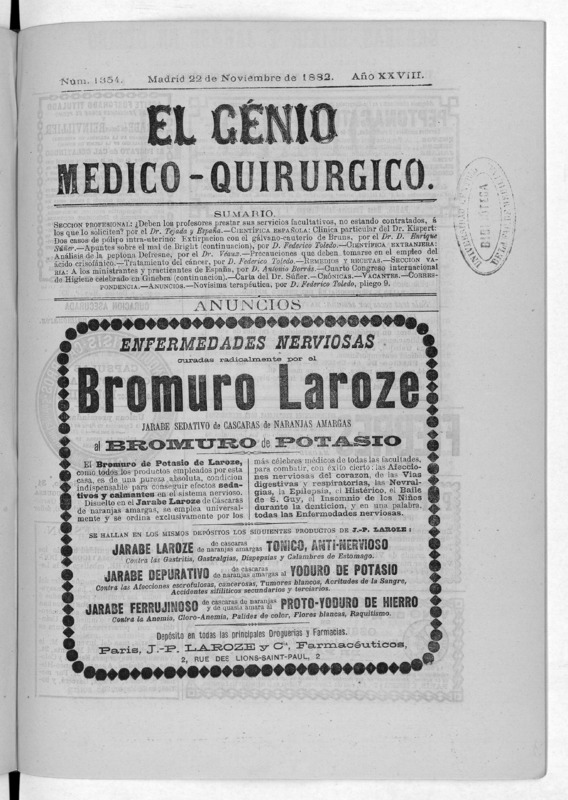 Parte de El Genio médico-quirúrgico : periódico de ciencias médicas ‐ [1882, Vol. 28, n. 1366-1393, 1340-1359.]
