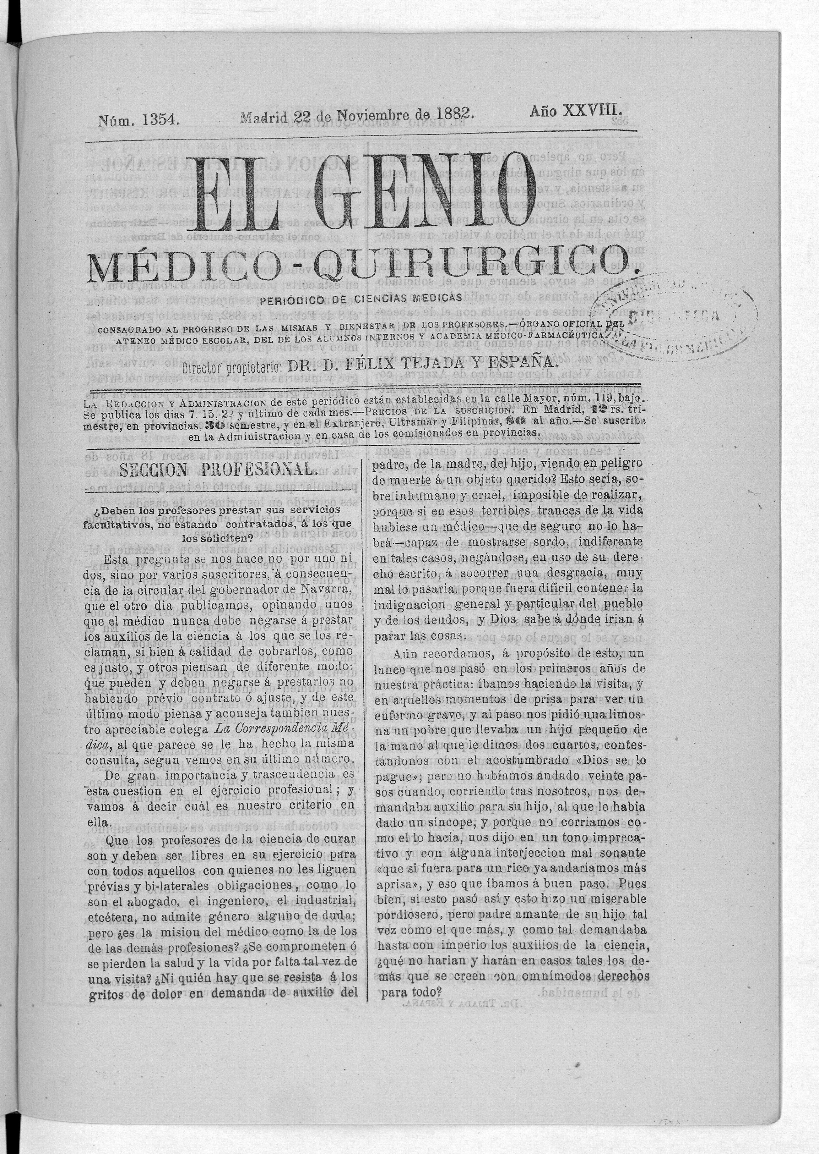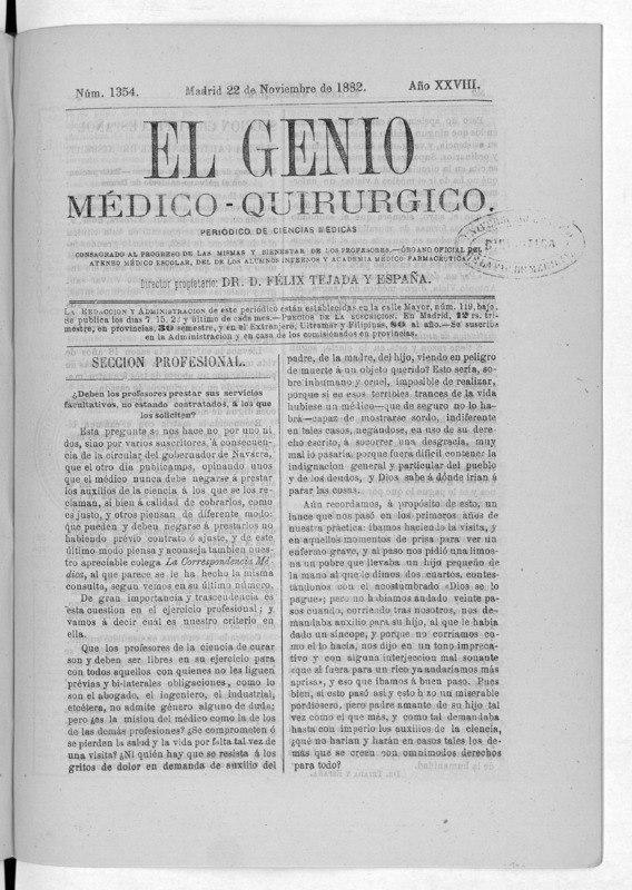 Parte de El Genio médico-quirúrgico : periódico de ciencias médicas ‐ [1882, Vol. 28, n. 1366-1393, 1340-1359.]