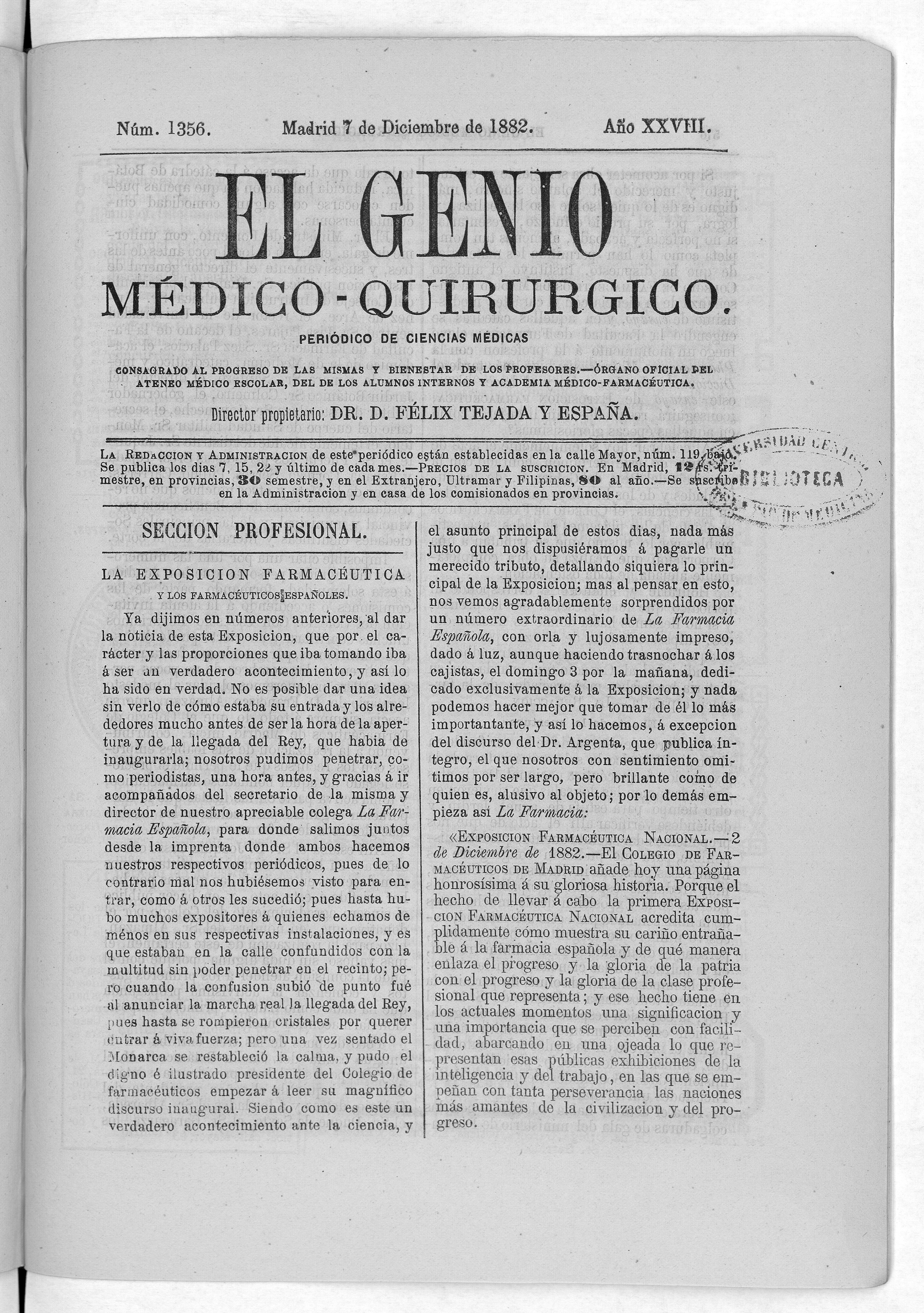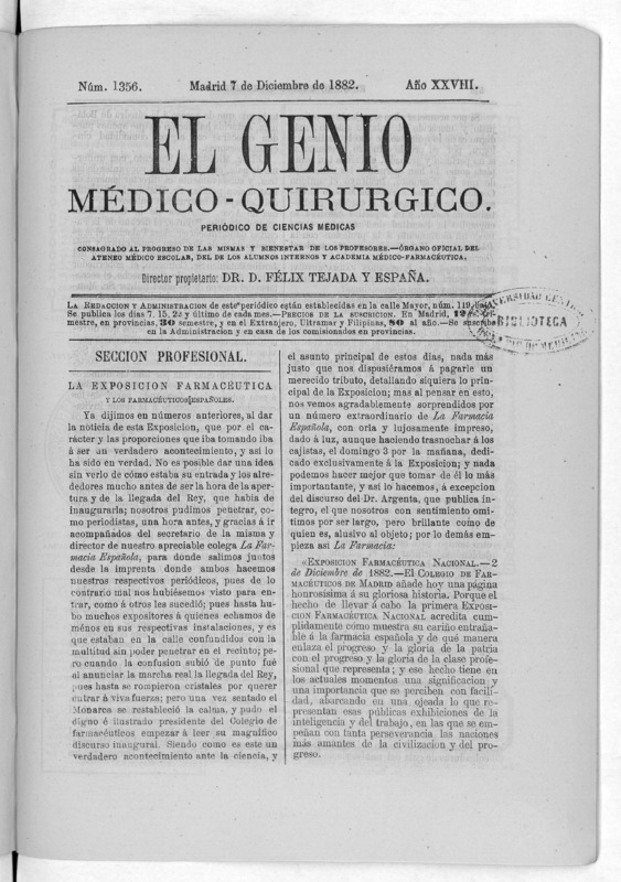Parte de El Genio médico-quirúrgico : periódico de ciencias médicas ‐ [1882, Vol. 28, n. 1366-1393, 1340-1359.]