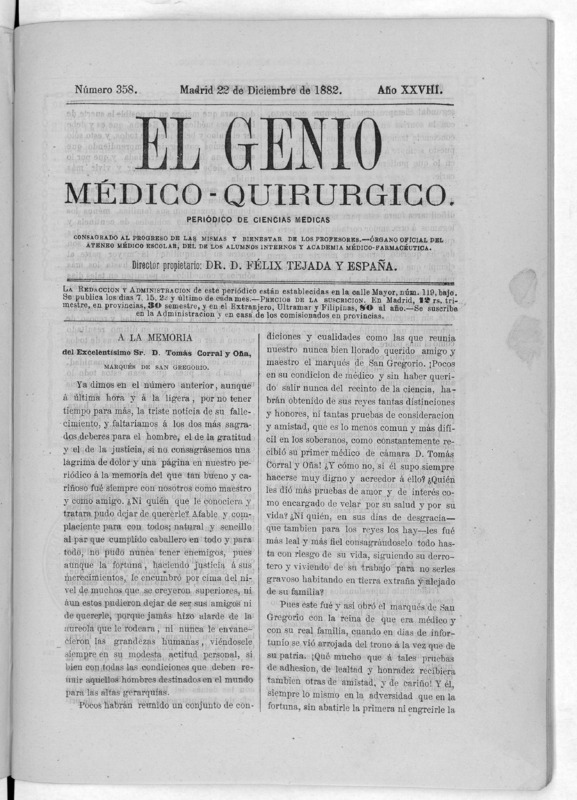 Parte de El Genio médico-quirúrgico : periódico de ciencias médicas ‐ [1882, Vol. 28, n. 1366-1393, 1340-1359.]
