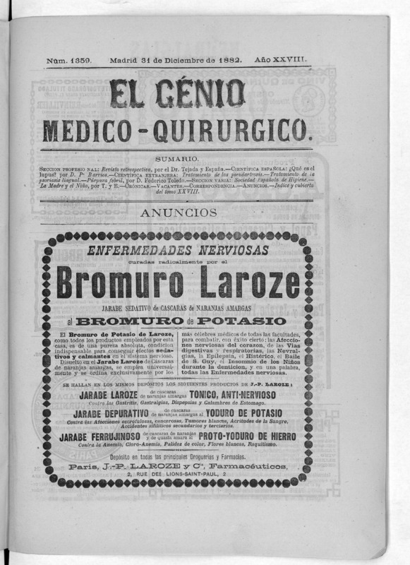 Parte de El Genio médico-quirúrgico : periódico de ciencias médicas ‐ [1882, Vol. 28, n. 1366-1393, 1340-1359.]